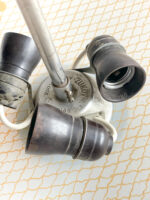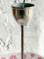 Stav: dobrý původní, dva oťuky na vnitřní straně lemu stínidla. Kovové části nesou známky patiny. Elektroinstalace nová. 250 V, 3 x 40 W