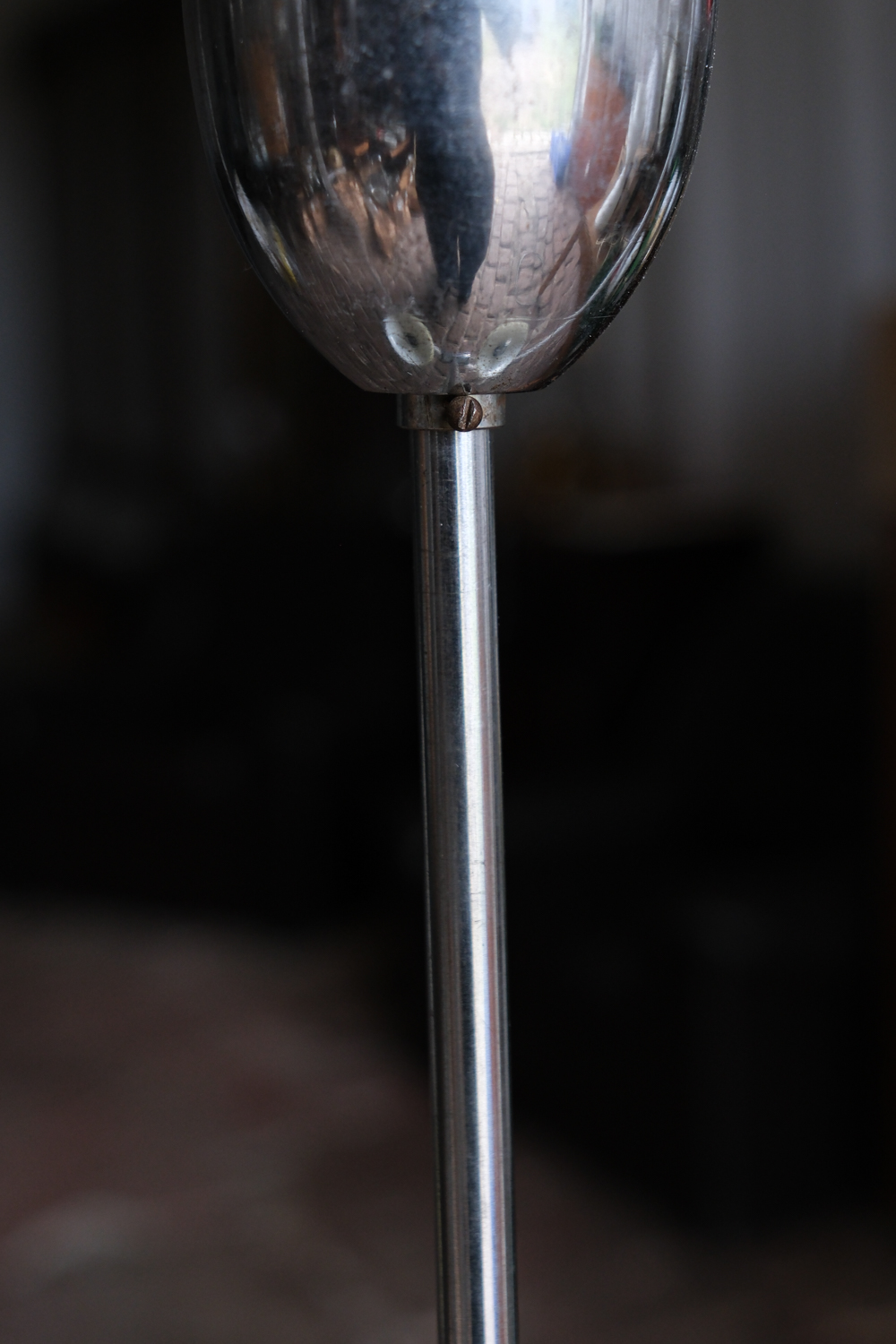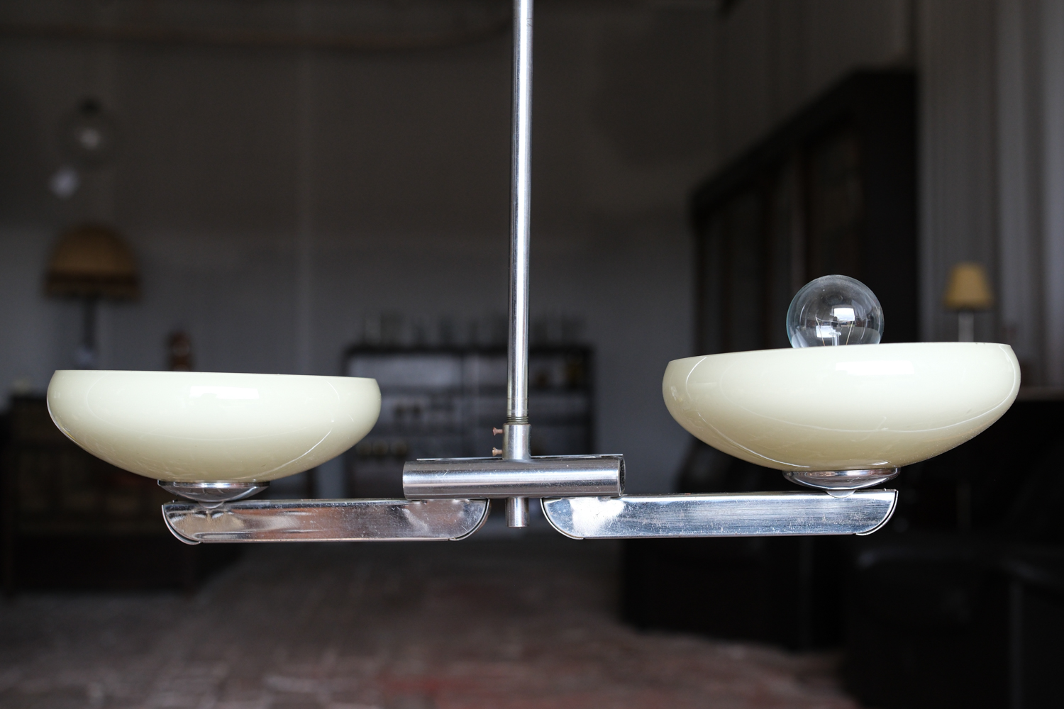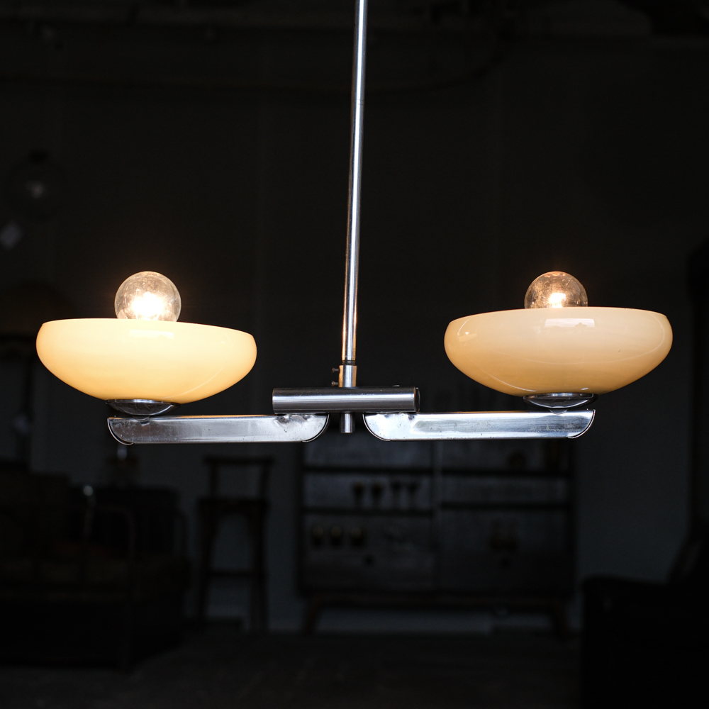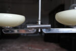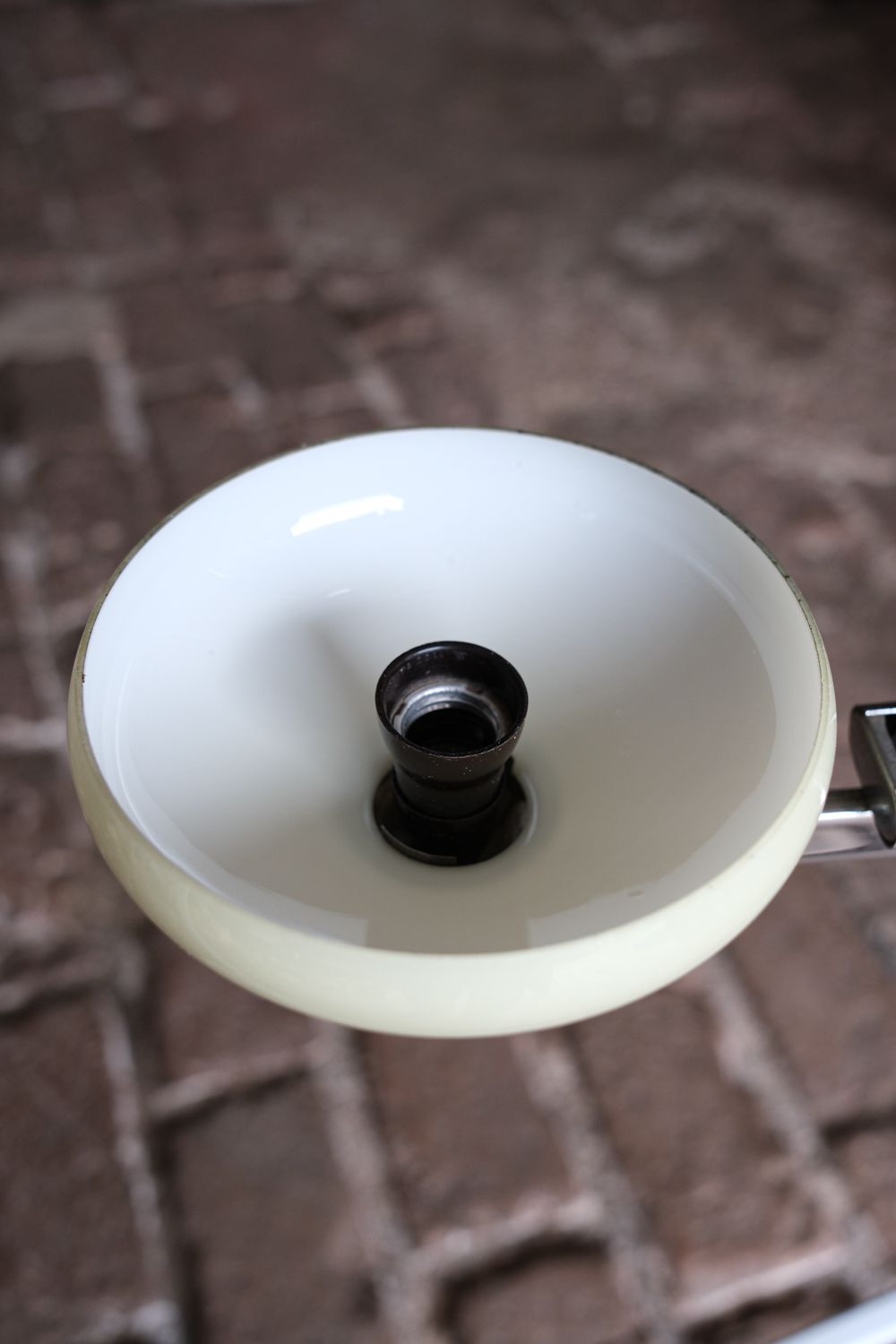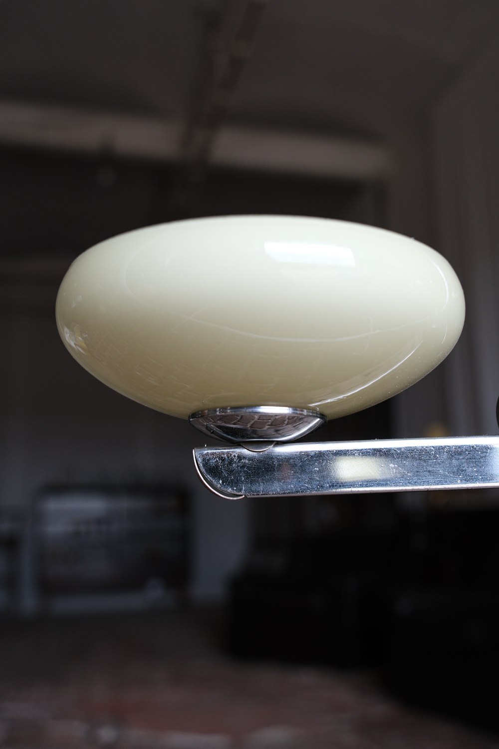 Zajímavým prvkem je i jejich odstín. Místo čistě bílé mají jemně vanilkový tón, který světlo zjemňuje a dodává mu teplejší, příjemnější charakter. V kombinaci s jednoduchou chromovou konstrukcí vzniká celek typický pro 70. léta, kdy se důraz kladl na čistotu formy a funkčnost, doplněnou o jemný výraz materiálu.