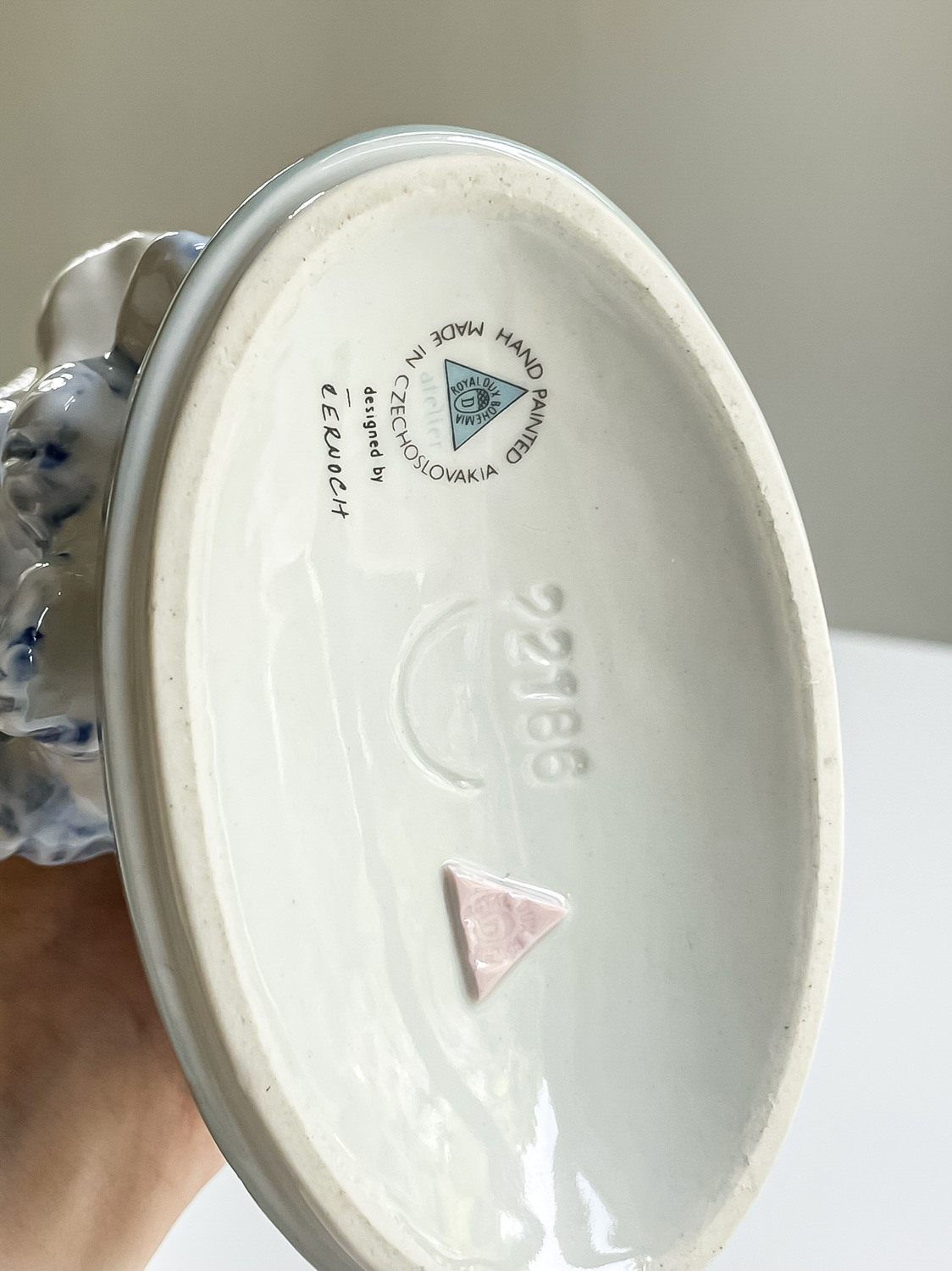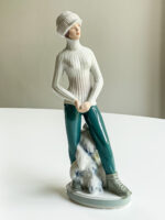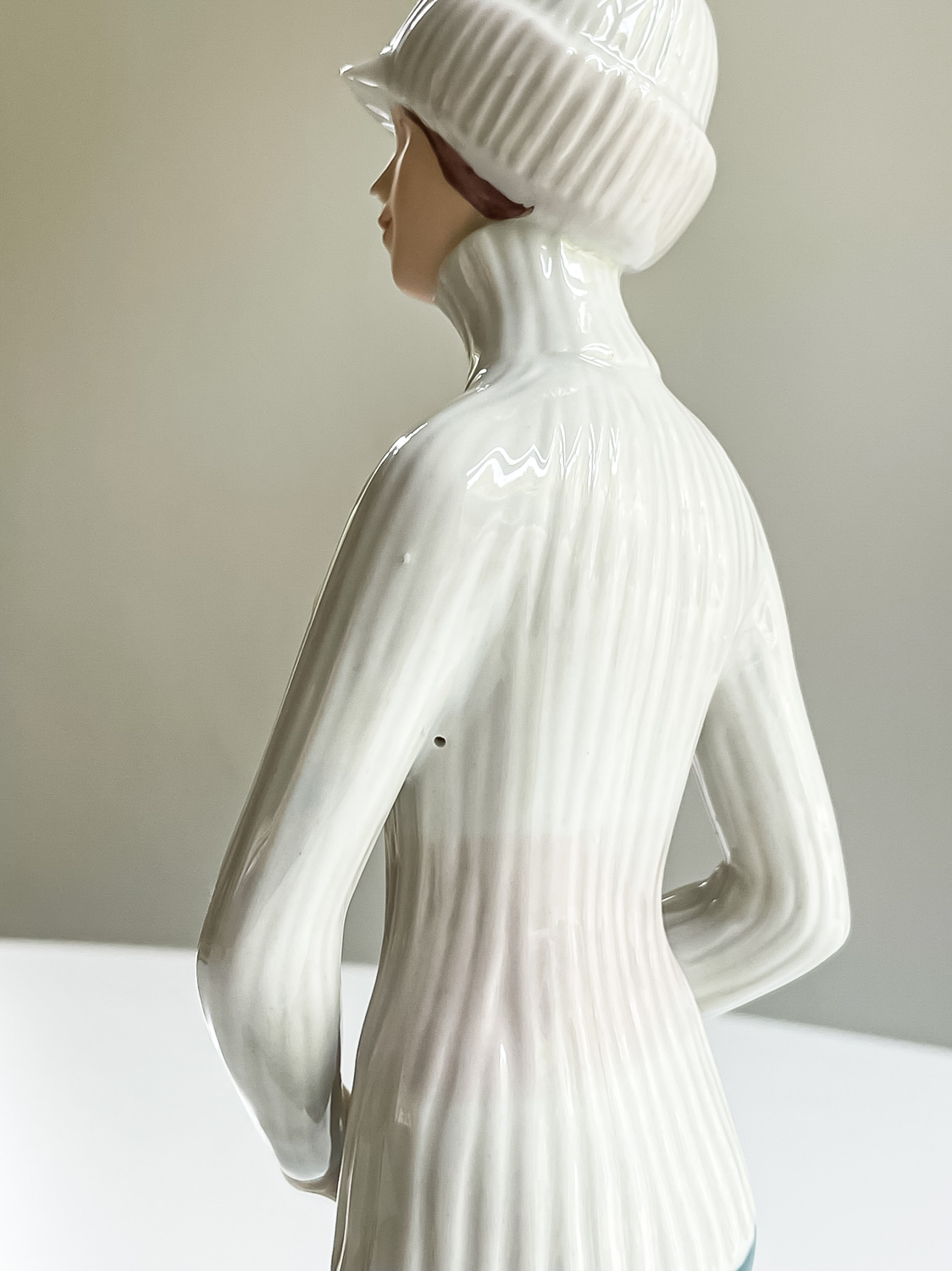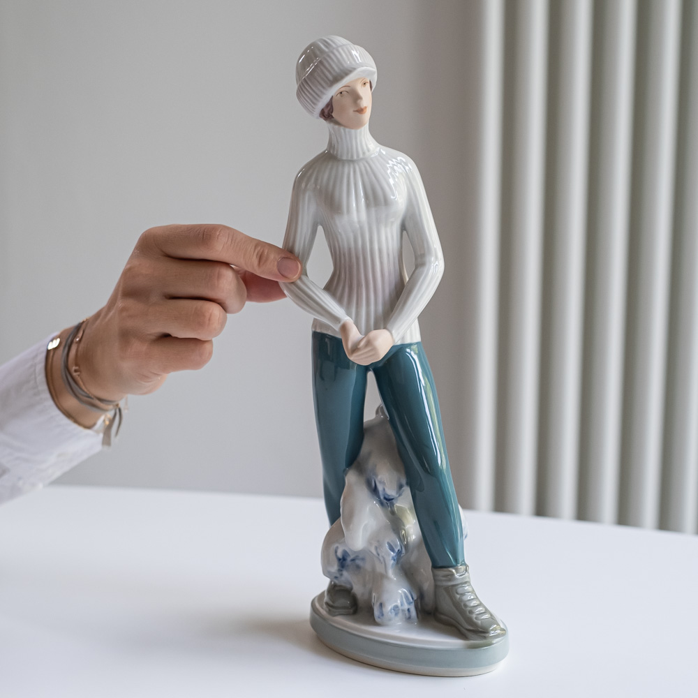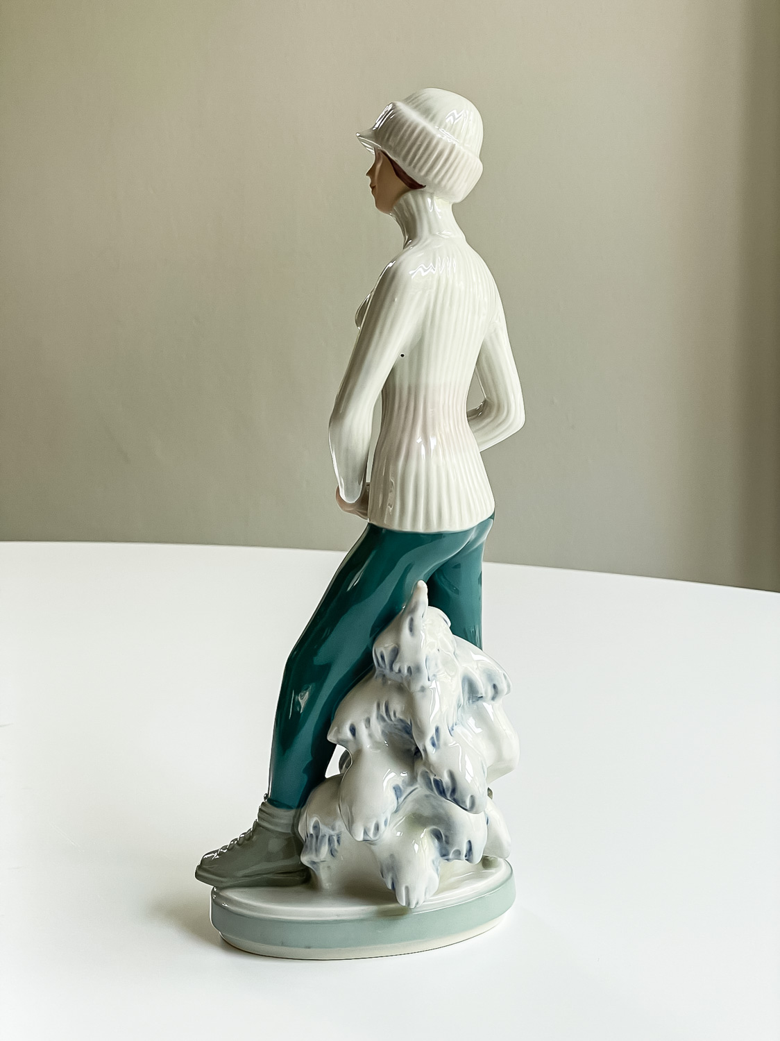Soška lyžařky v barevném provedení z porcelánky Dux z minulého století.
