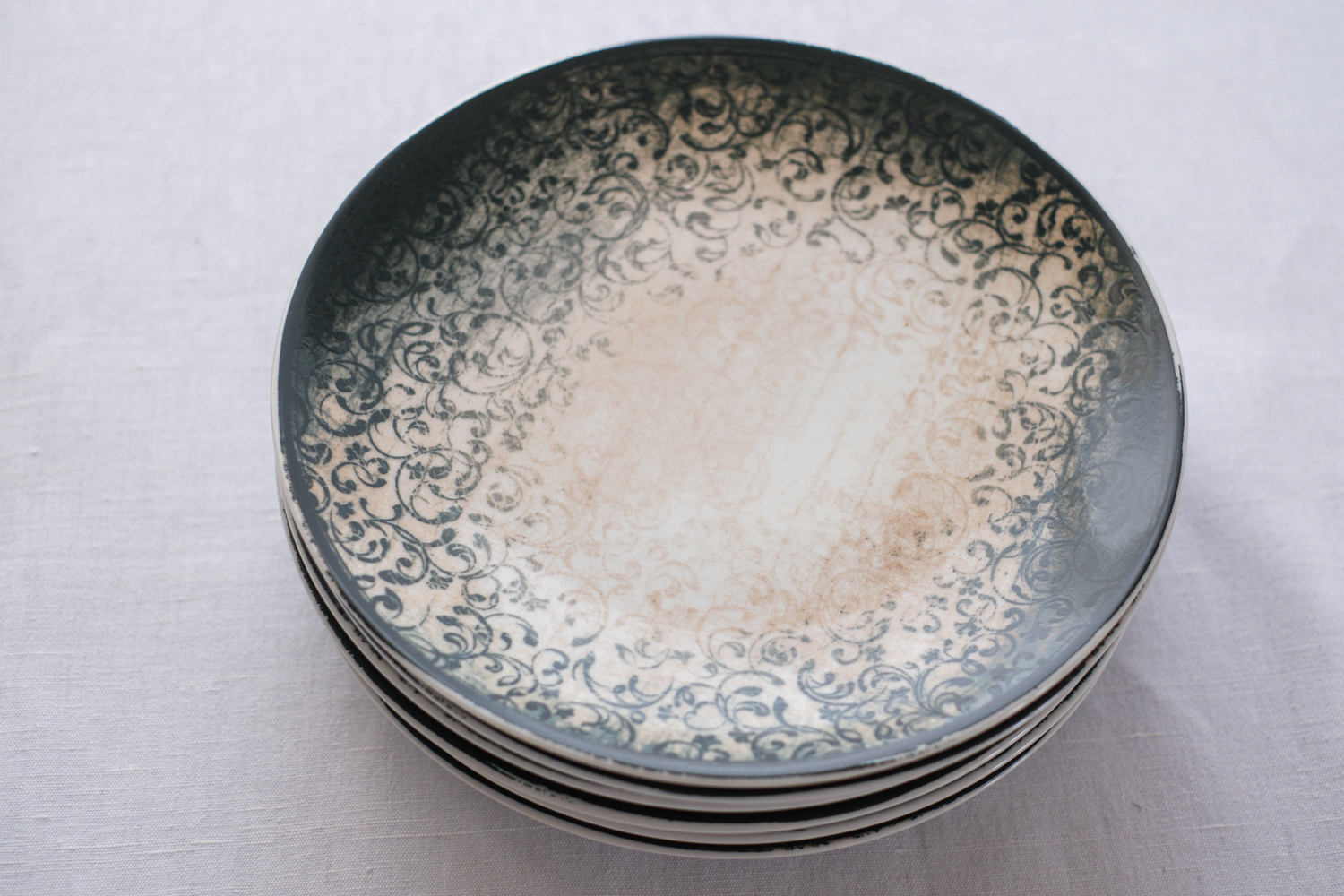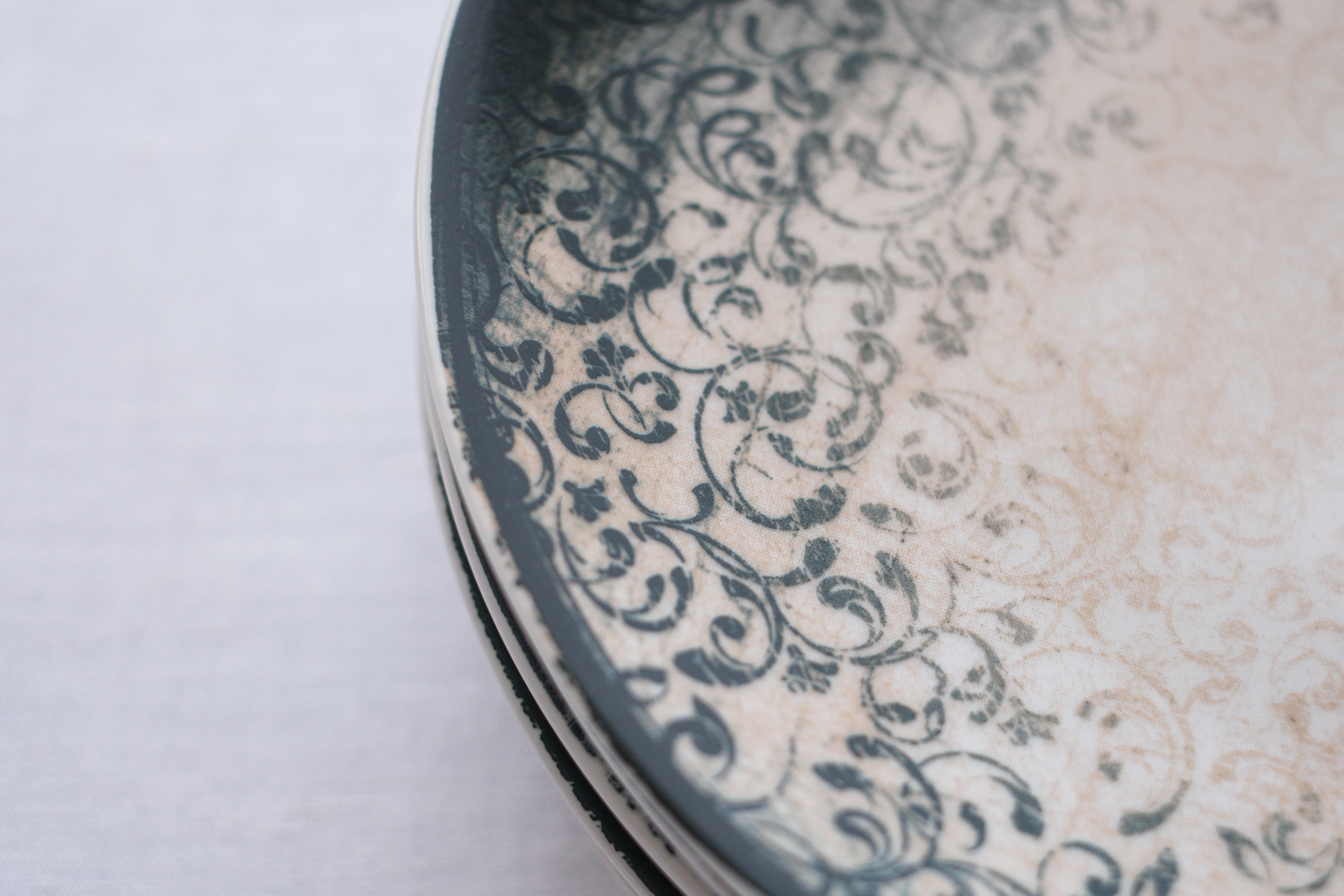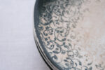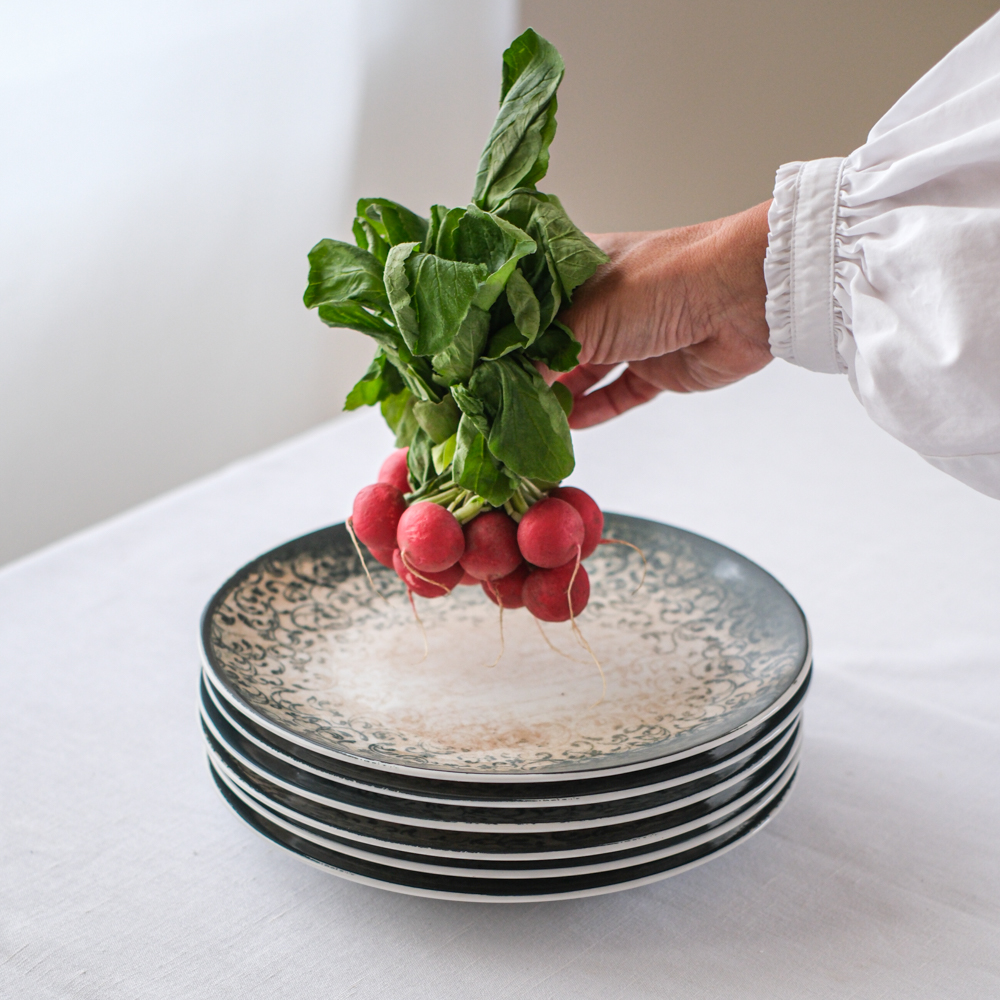 Mělký porcelánový talíř ze silnějšího střepu s vintage vzorem působí dojmeme starého „ošoupaného talíře“. Řada nese název vintage a je vyrobena porcelánkou G. Benedikt. Barva petrolejová, je možno mýt v myčce i dát do mikrovlnky.