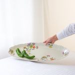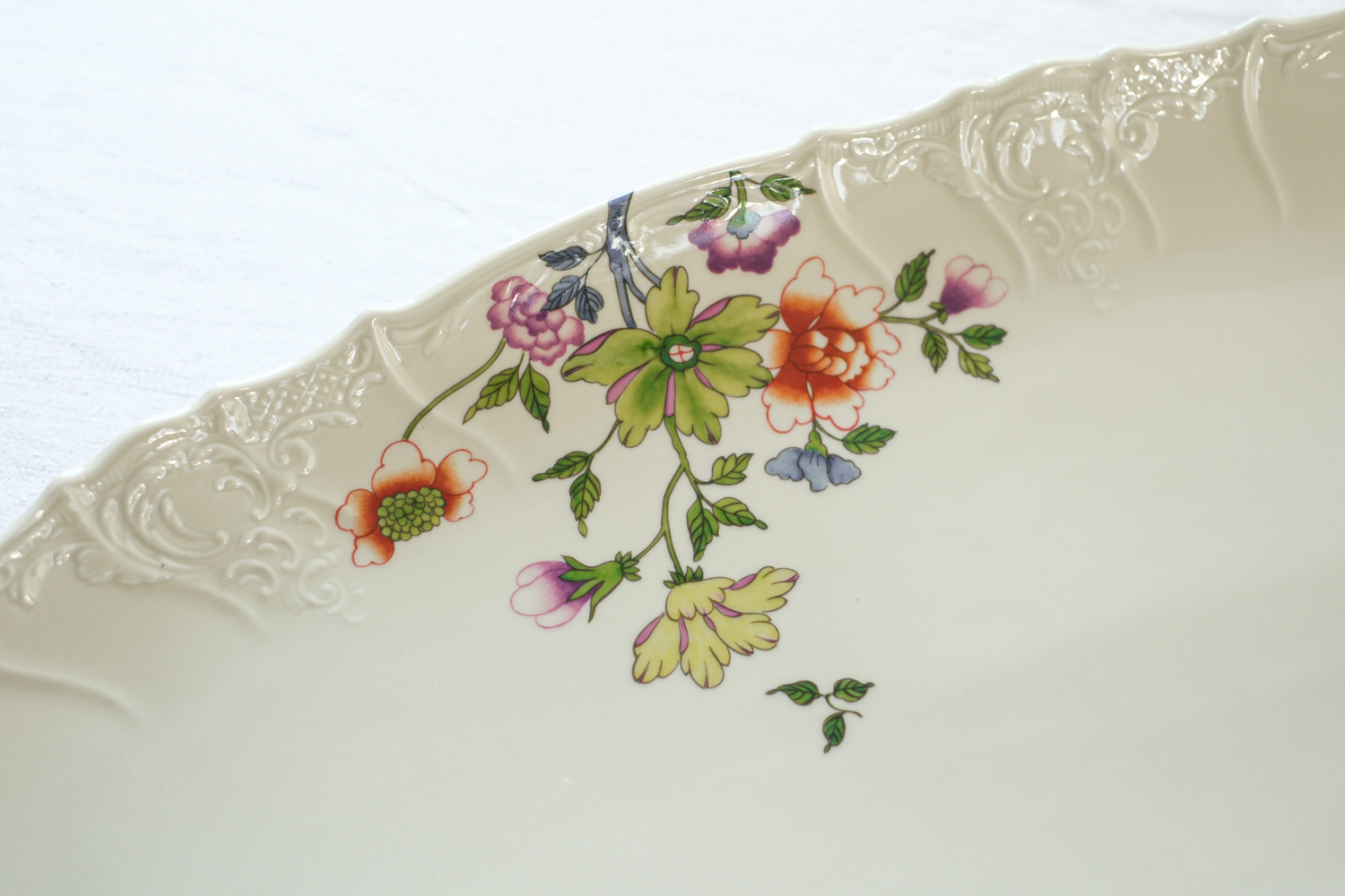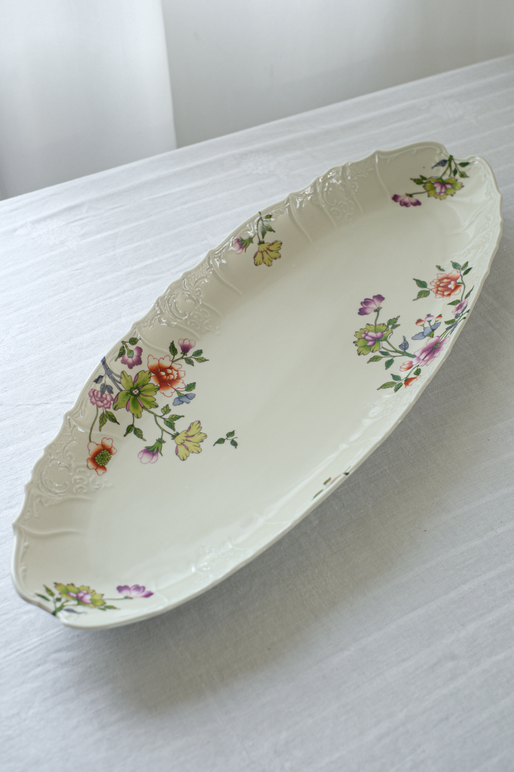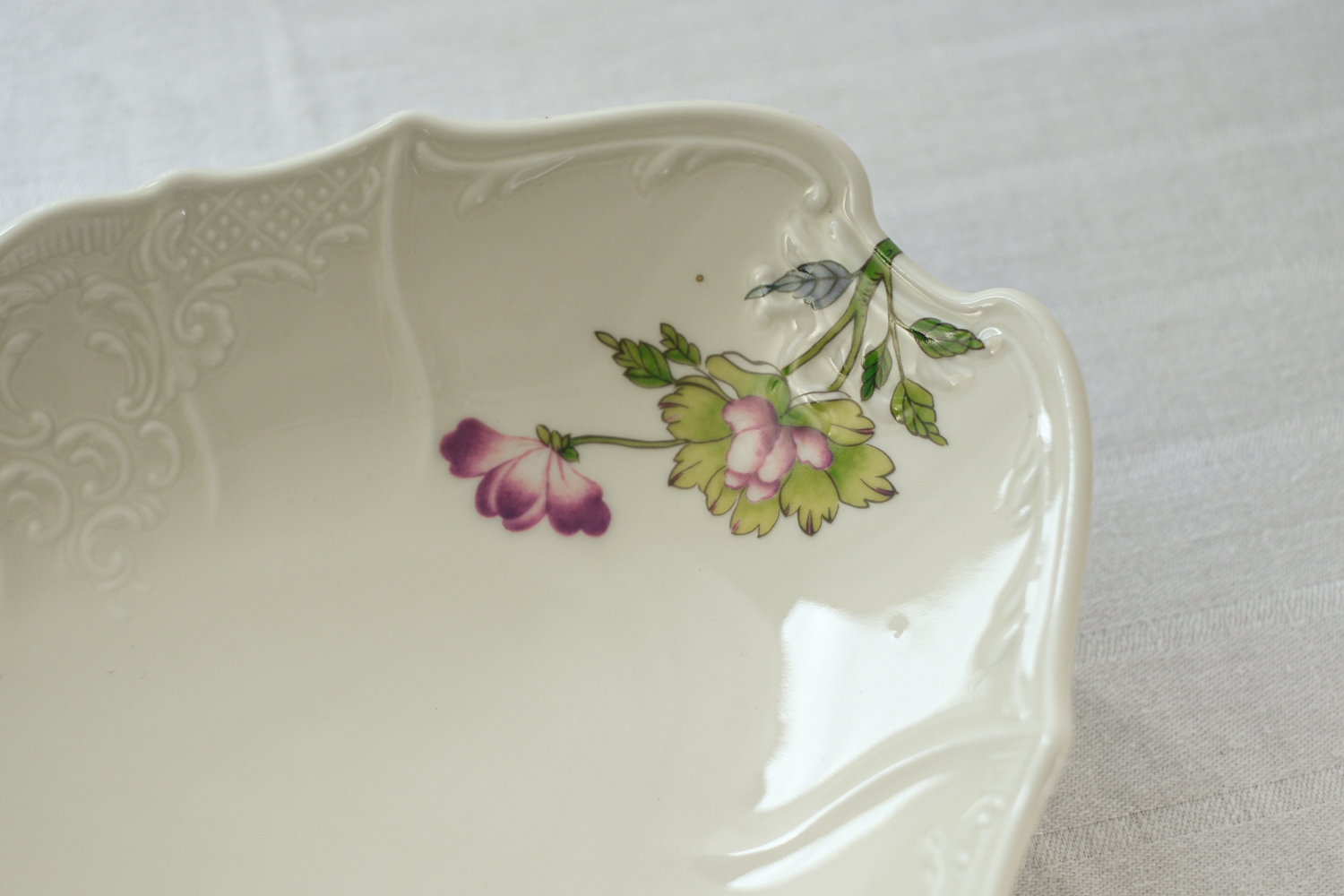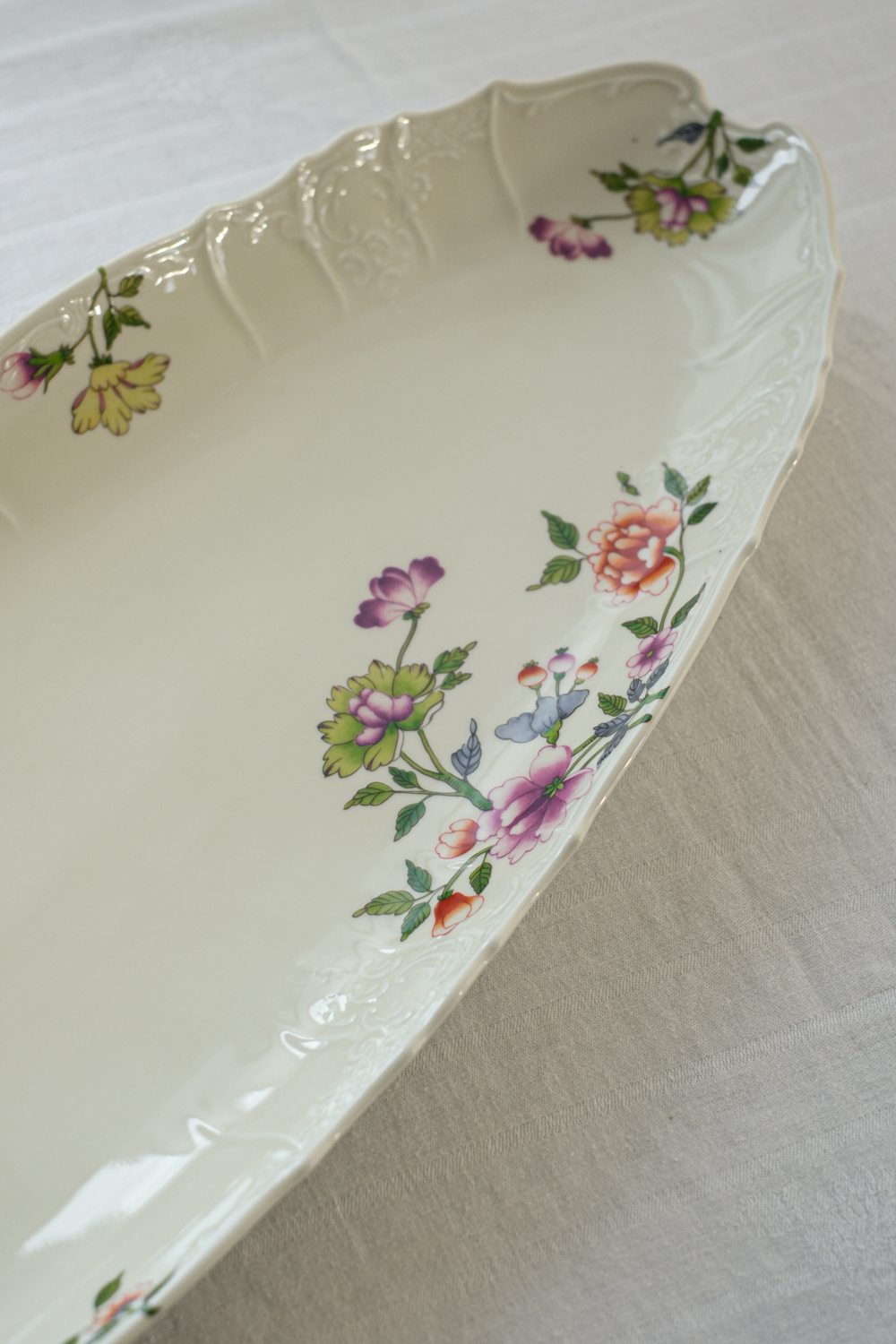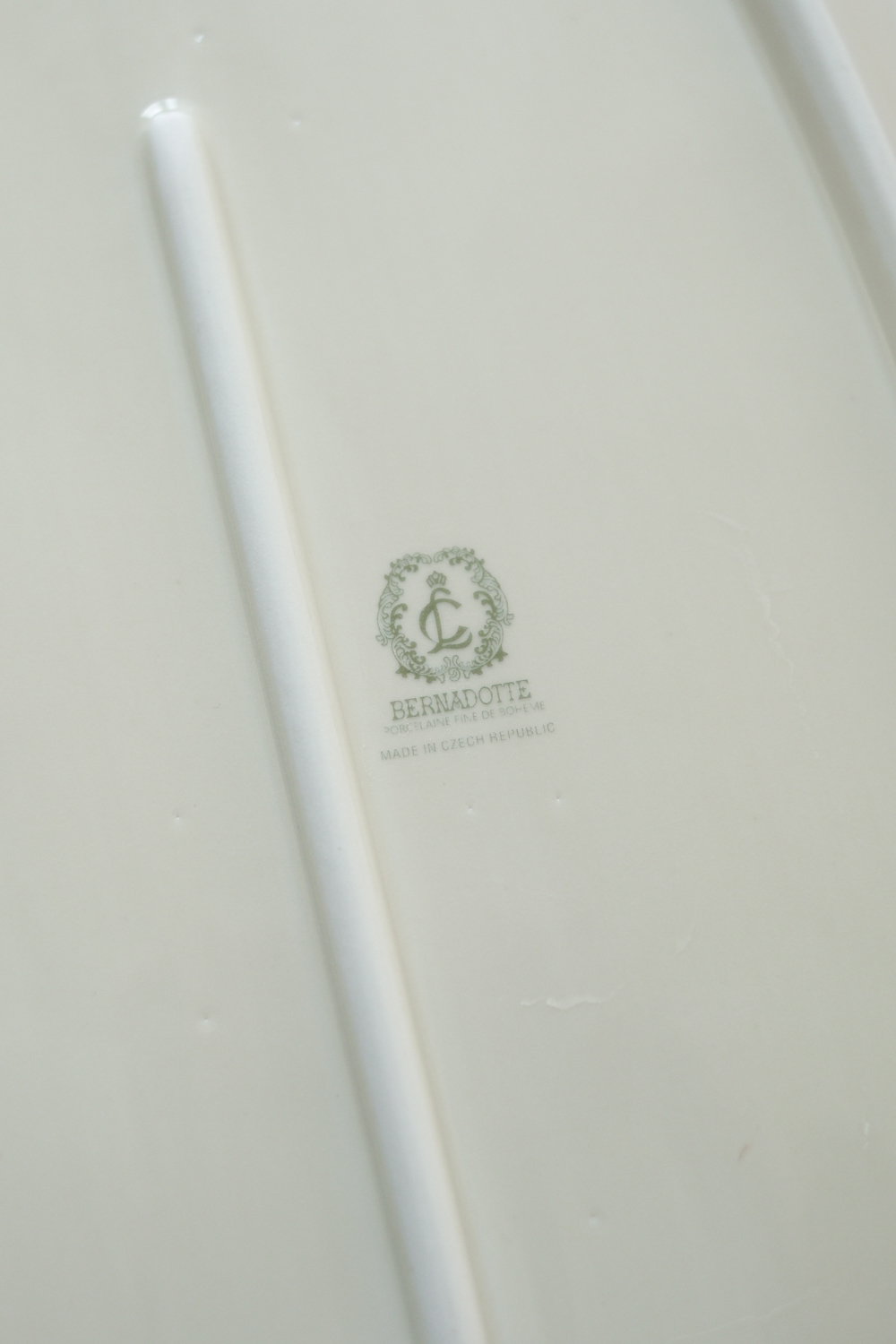 Velká porcelánová mísa ze série Bernadotte, vyráběné porcelánkou Leander Loučky. Výrazný kus, který se na stole neztratí. Jemný smetanový tón porcelánu s charakteristický reliéfním okrajem a květinovým motivem odkazují na tradiční český dekor.