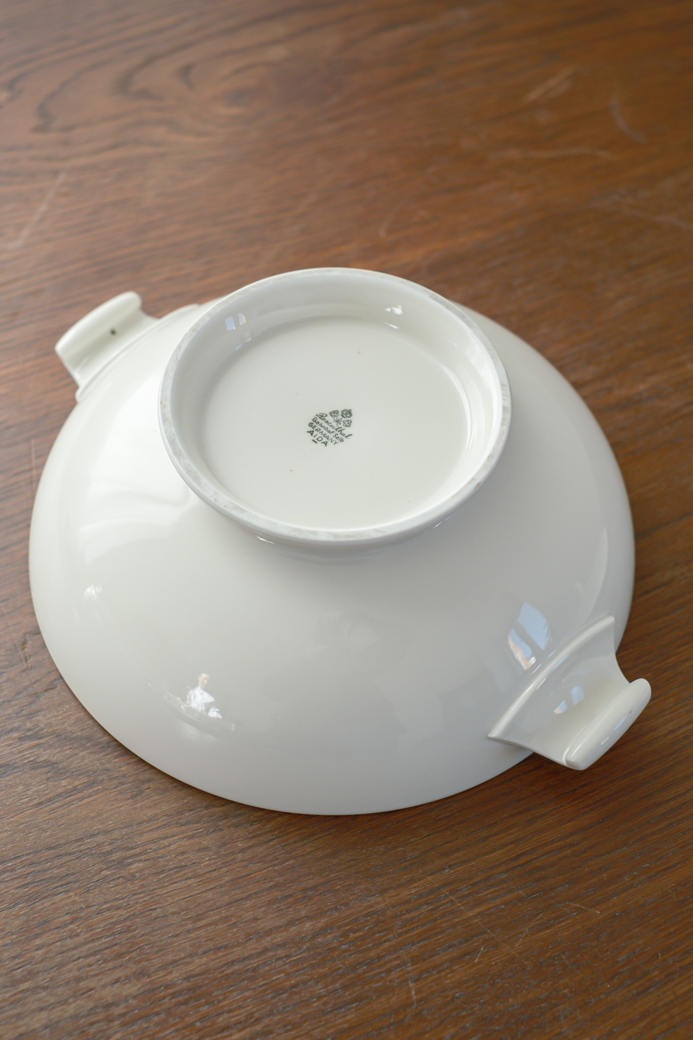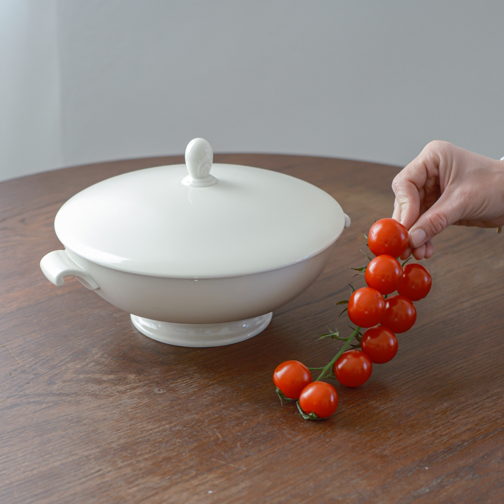 Minimalistická mísa s poklopem od německé porcelánky Rosenthal ve smetanové barvě pochází ze série Aida.