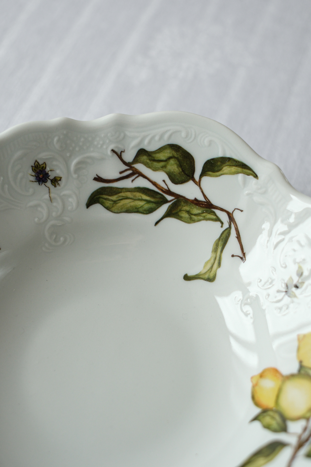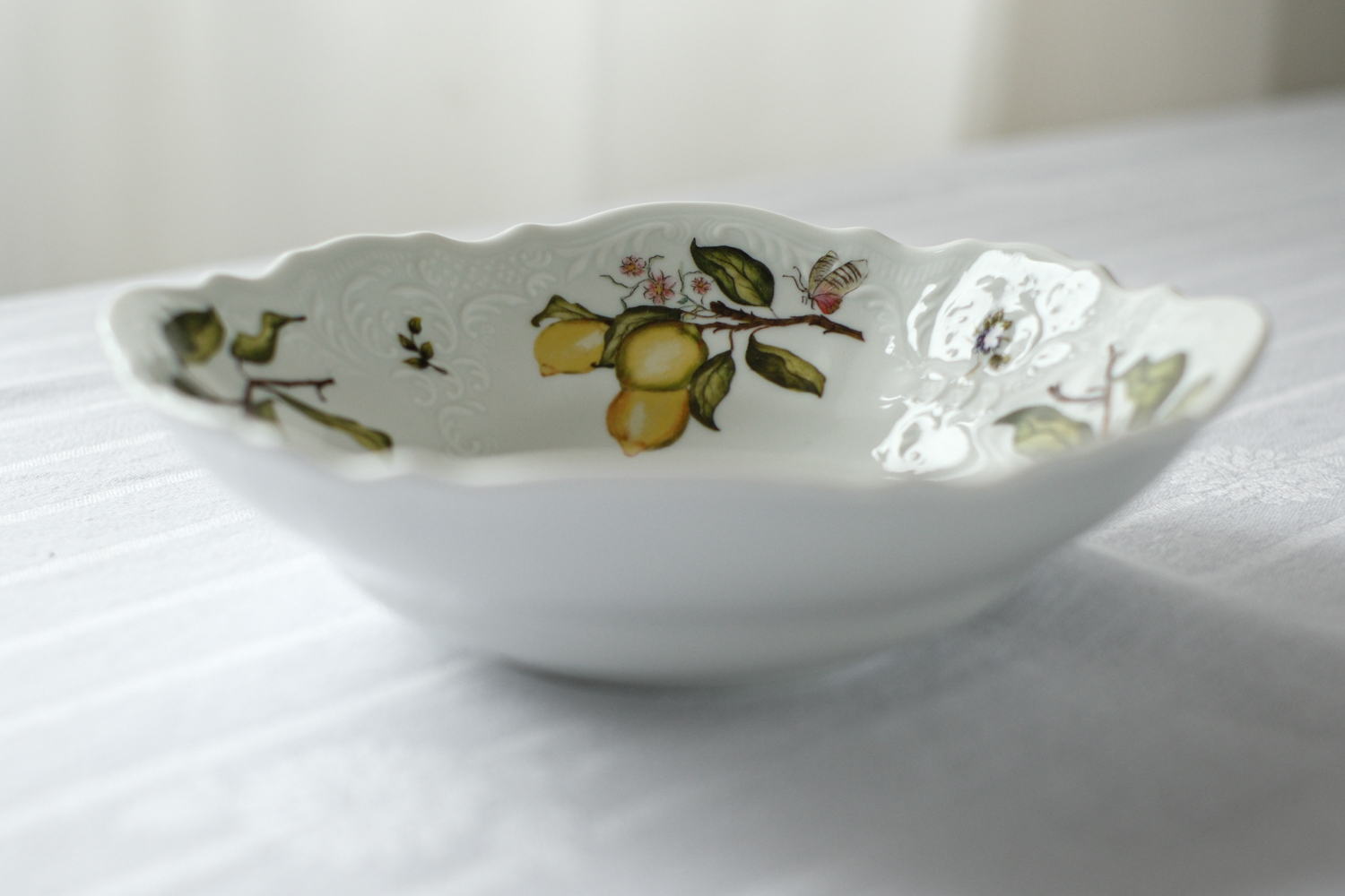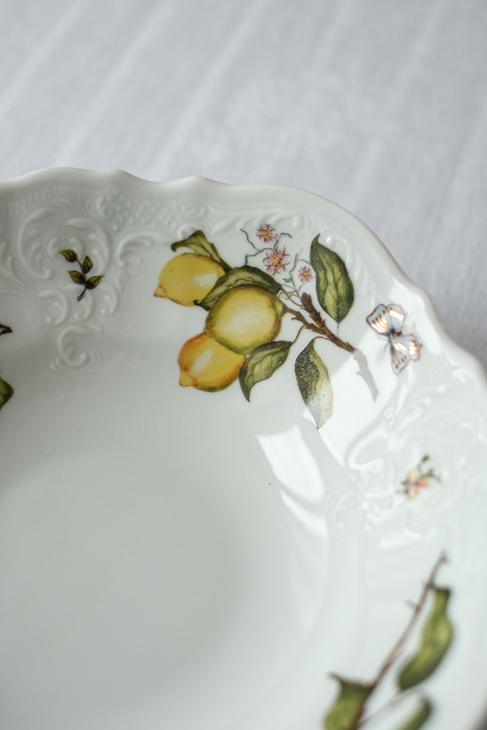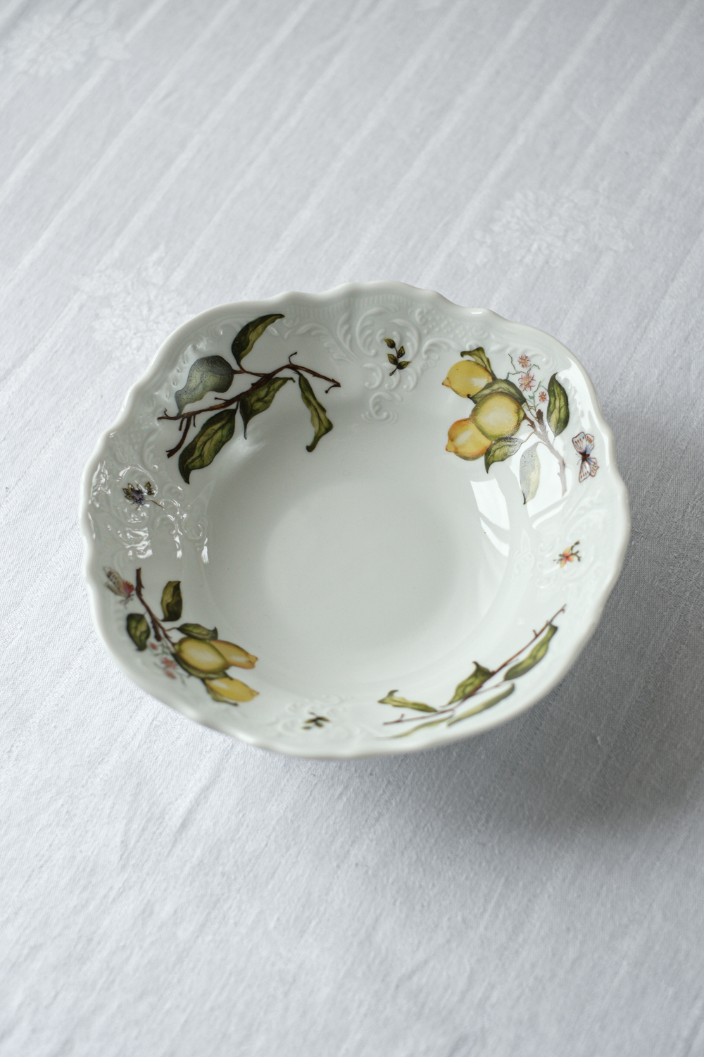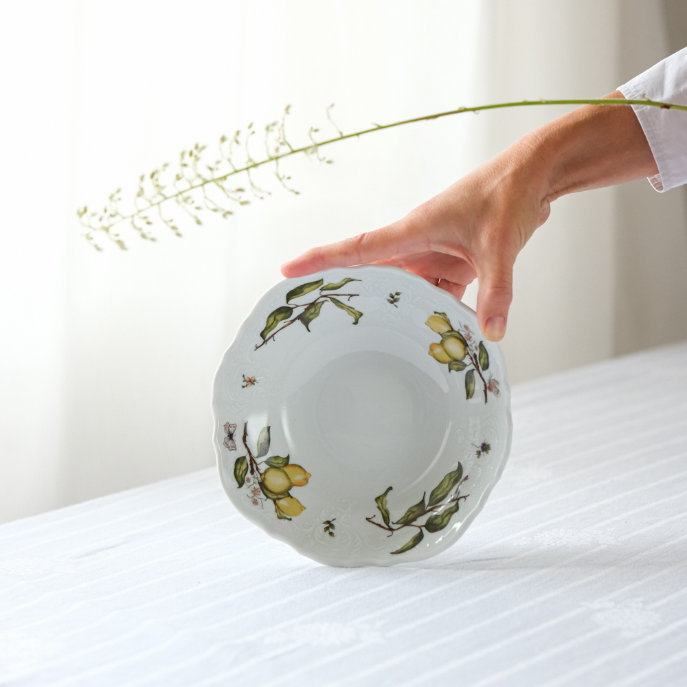 Salátová miska s bohatým dekorem citrónů od Tania Bulhões, brazilské značky luxusního porcelánového nádobí a bytových doplňků, známé pro spojení brazilské živosti s francouzskou elegancí. Značka, kterou založila Tania Bulhões, vznikla v roce 1989 s ručně malovaným porcelánem v malém butiku v Brazílii. Od té doby se rozrostla v celosvětově uznávanou značku známou svými sofistikovanými designy a spoluprací s řemeslníky, jako je Royal Limoges, historická francouzská porcelánka.