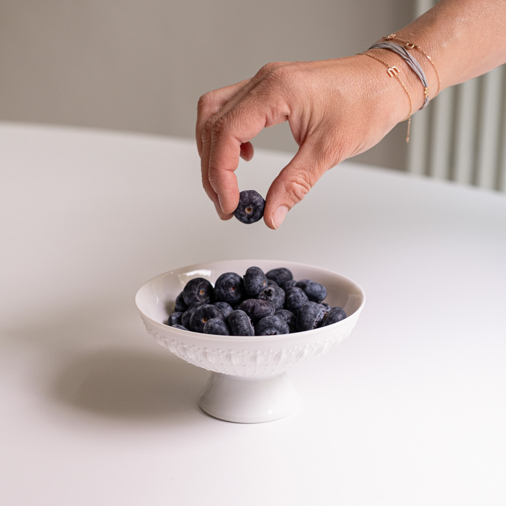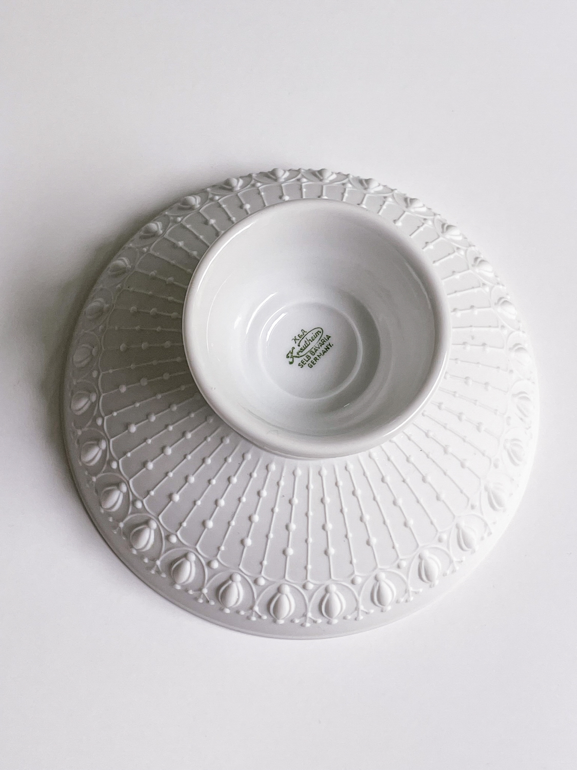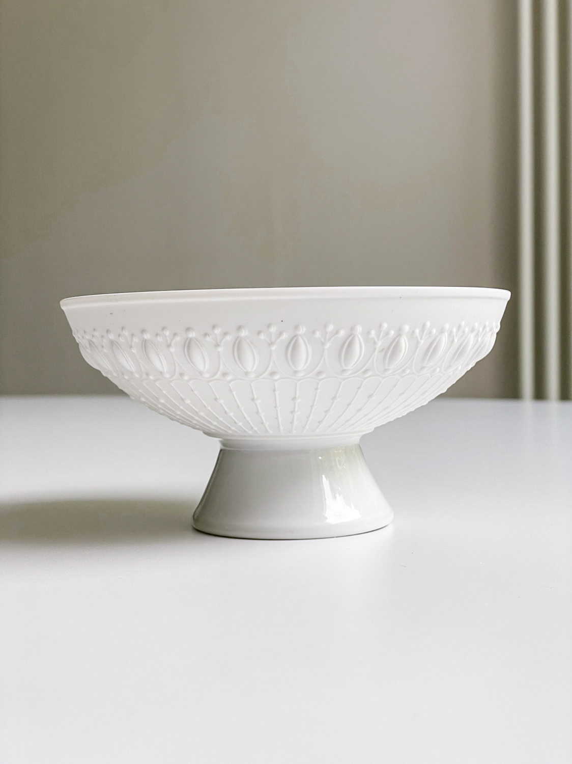 Mistička na noze v kombinaci glazury a biscuitu s krásným plastickým vzorem. Lze ji využít na servírování oříšků, oliv nebo používat na odkládání šperků. Parádu zaručeně udělá jak na jídelním tak nočním stolku. Můžet ji ale propůjčit zcela novou funkci svícnu, když ji otočíte. Vynikne tak ještě lépe její nádherné zdobení.