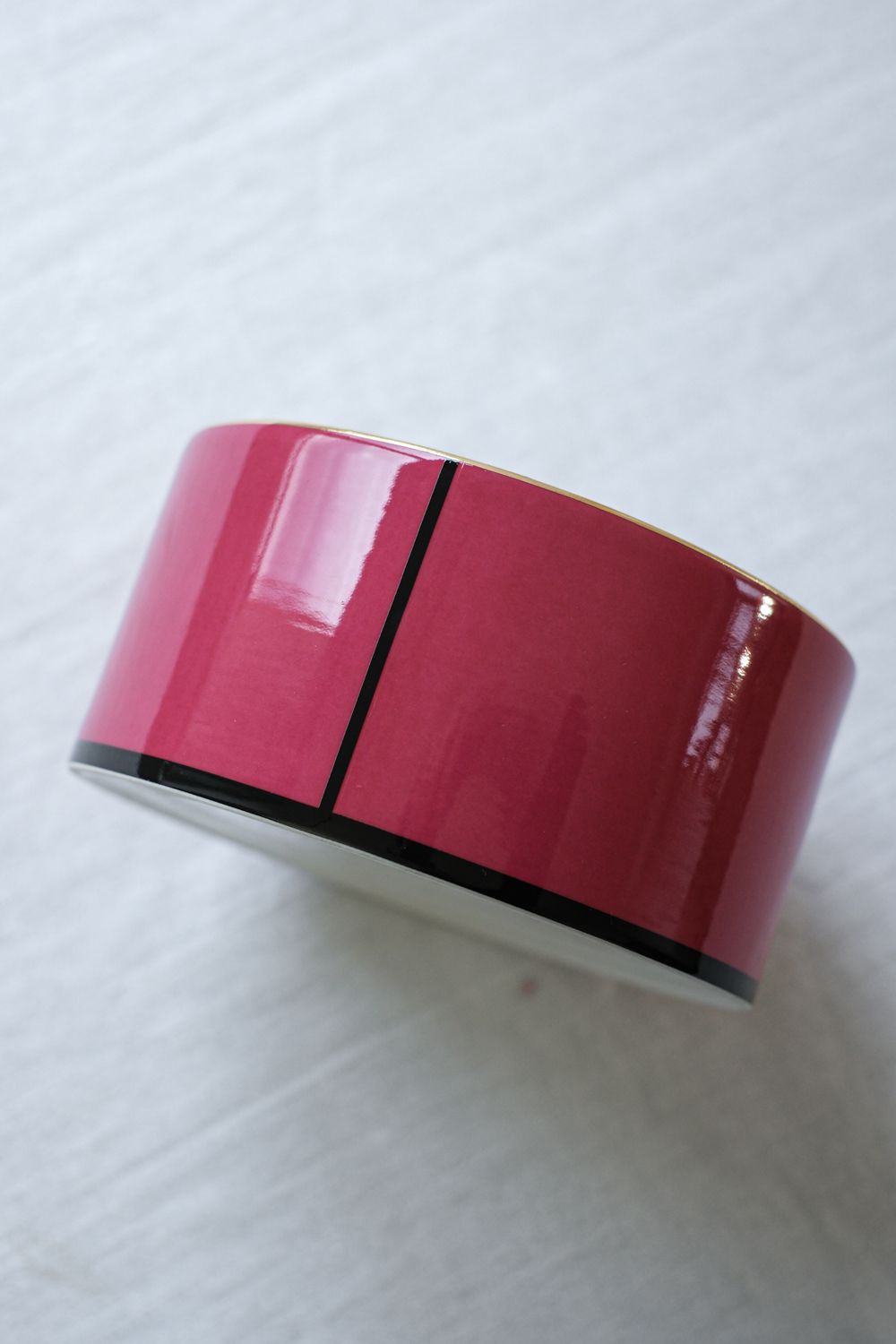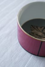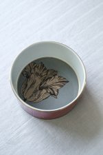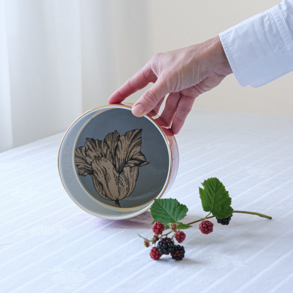 Uvnitř misky se rozvíjí kresba tulipánu na matném šedém podkladu, vnější část zdobí výrazná fuchsiová se zlatým lemem a kontrastní černou linkou. Výrazný akcent pro interiér, který spojuje moderní design a eleganci klasického porcelánu.