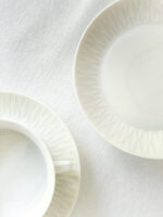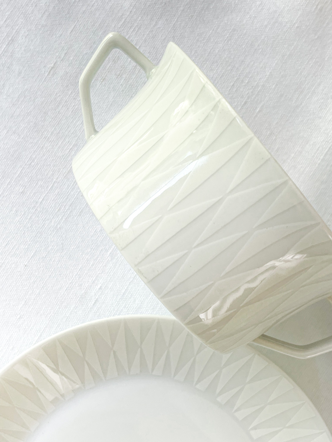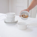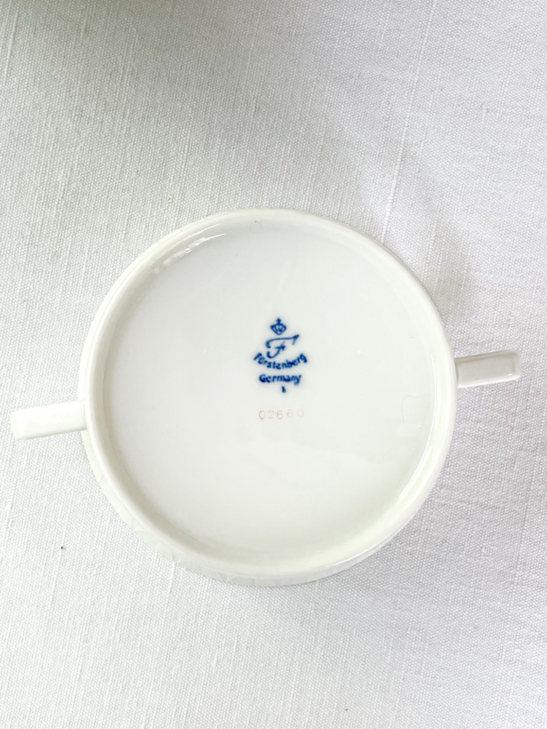 Mistička pochází z německé porcelánky Fürstenberg, která letos oslavila 275 let (založena 11.1.1747) a jedná se o druhou nejstarší porcelánku v Německu. Miska s talířkem mají velmi moderní tvar i geometrický dekor. Zajímavá je kombinace lesklého porcelánu a matného zdobení. Jedná se sice o misku na bujón, ale my bychom v ní viděly třeba müsli.