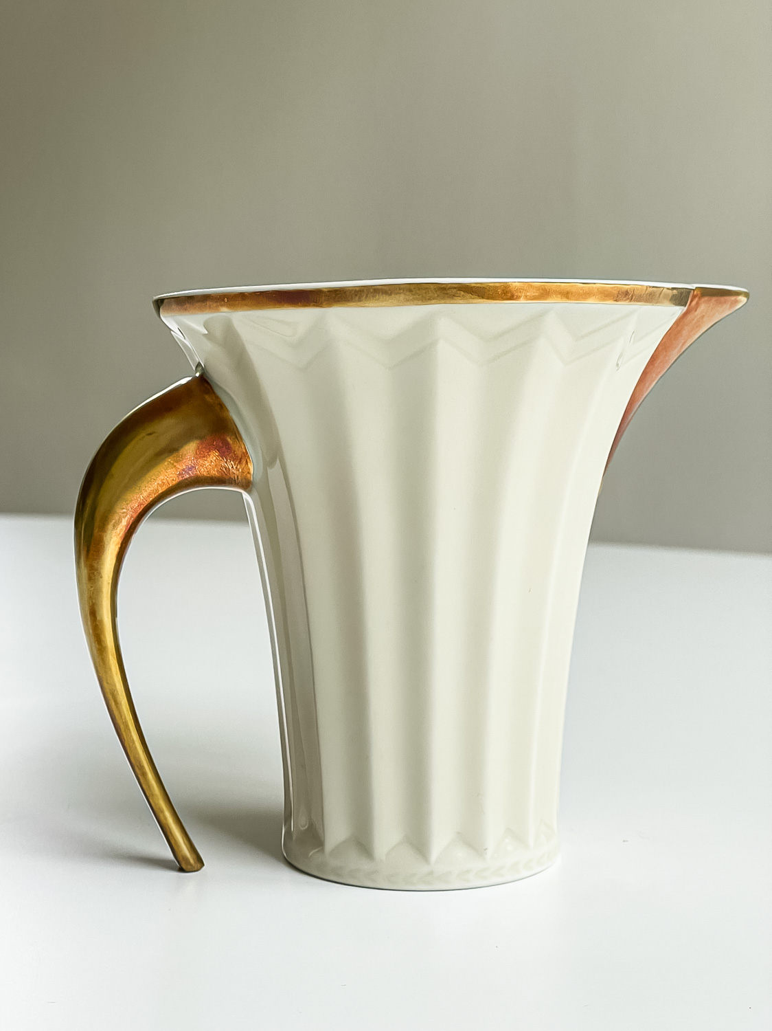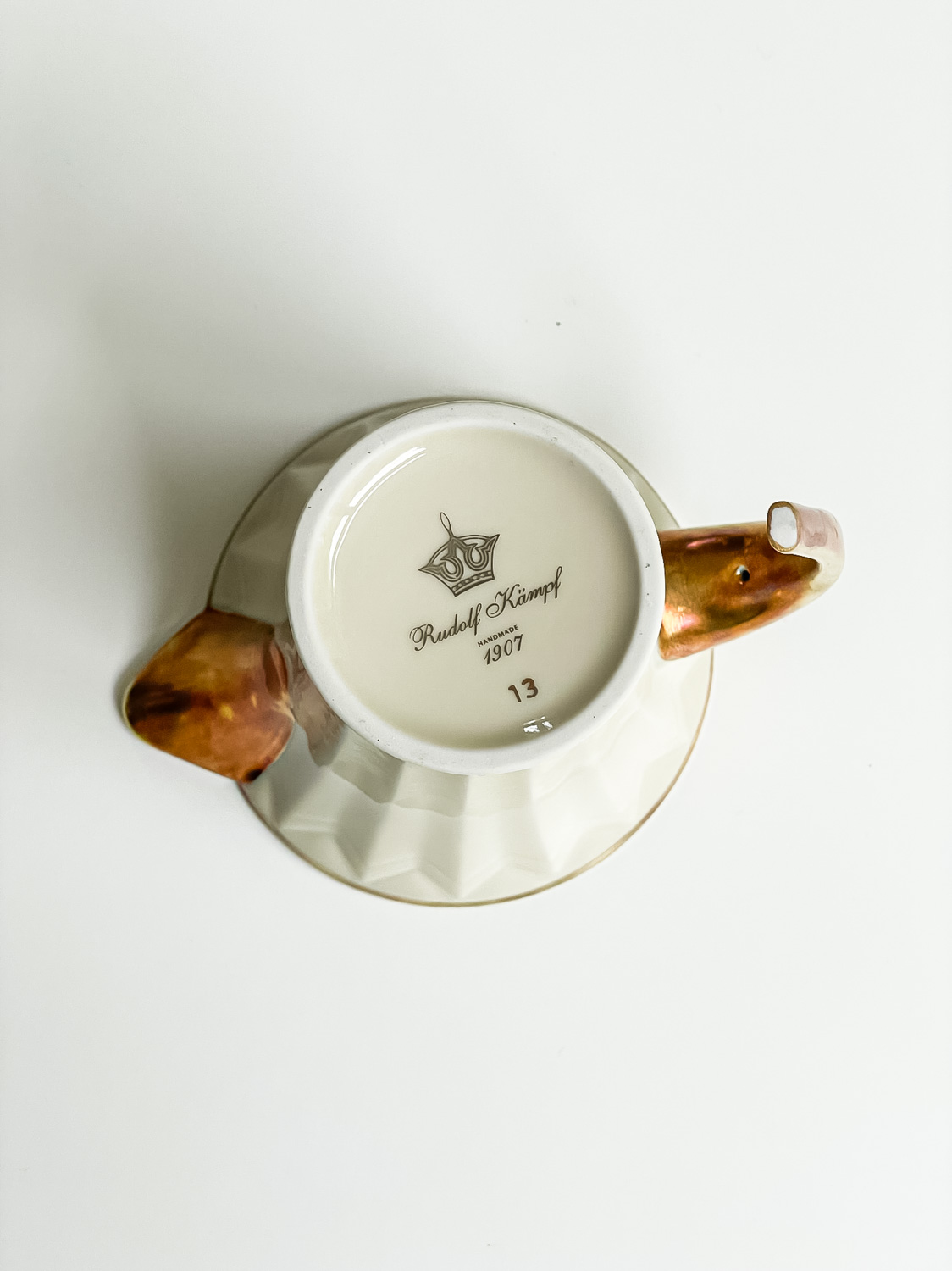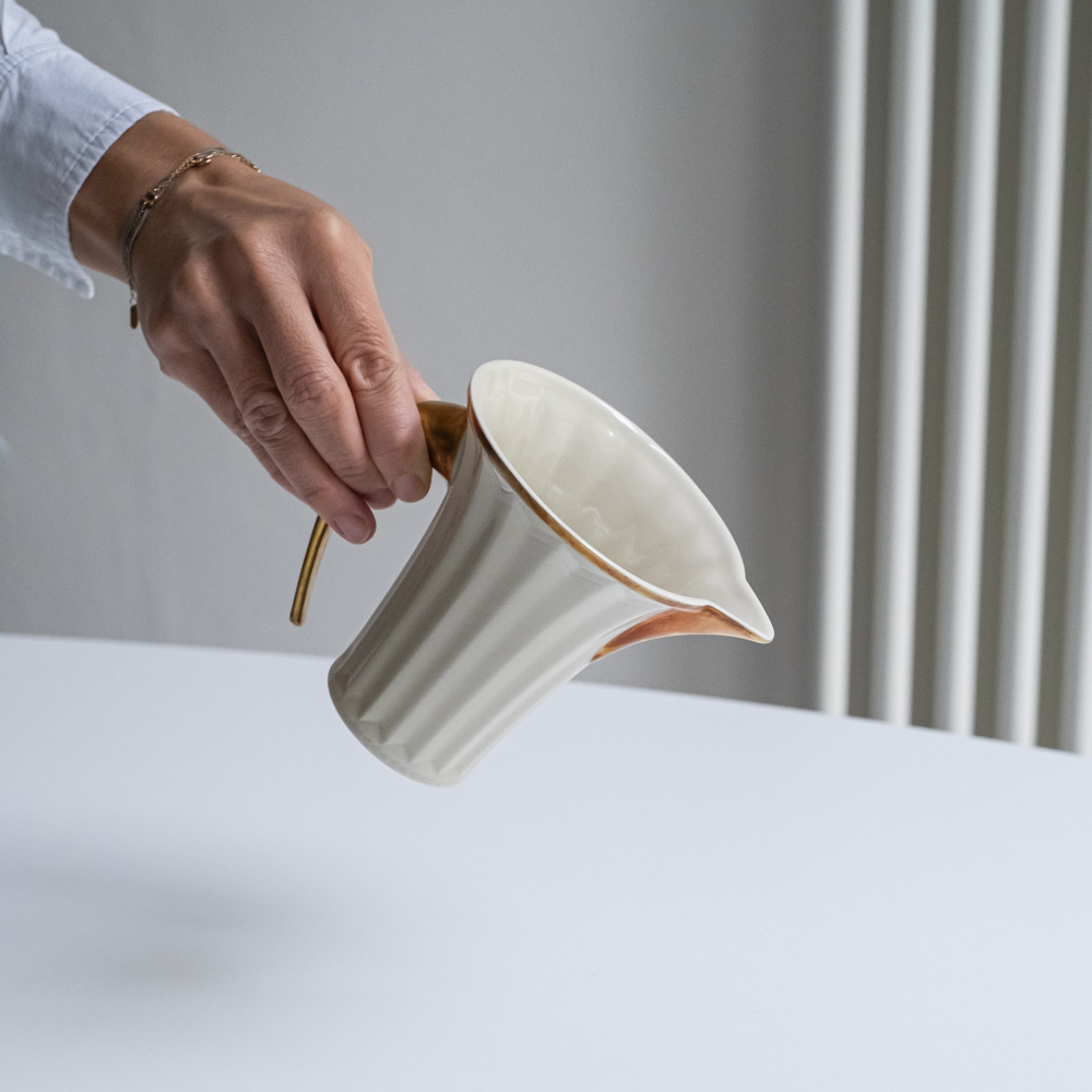 Luxusní mlékovka od české porcelánky Rudolf Kämpf, která byla založena na přelomu 19. a 20. století za podpory habsburské královksé dynastie. Továrna byla založena jako elitní dodavatel vysoce uměleckého nádobí, figurek a dalšího porcelánu pro královský dvůr a domácnosti evropské aristokracie. Společnosti se podařilo udržet si své hlavní přednosti i ve 21. století. Je jedinou továrnou v České republice, kde se porcelán vyrábí ručne, což dodává jejím výrobkům na vyjímečnosti. Výrobky značky Rudolf Kämpf tvoří většinou limitované série a exkluzivní exemplaře. Mlékovka v barvě slonové kosti je zdobená pravým zlatem a pochází z edice Egypt, která byla inspirována starověkou mytologií.