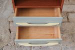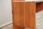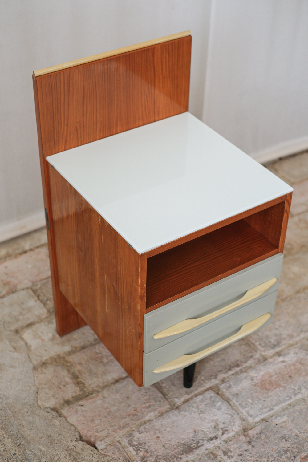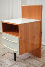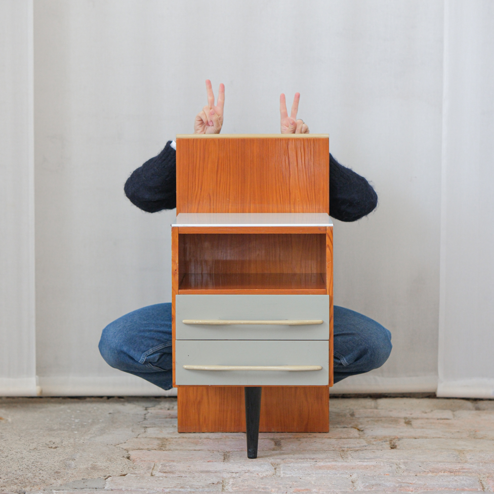 Klasika československého moderního nábytku 60. let z návrhářské dílny Mojmíra Požára pro UP Závody Bučovice. Typická kombinace materiálů a barev – tělo s výraznou kresbou dřeva, bílá horní deska z opaxitového skla a šedozelené čelo zásuvek s plastickými krémovými úchytkami – dodává stolku lehkost a eleganci.