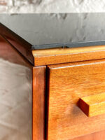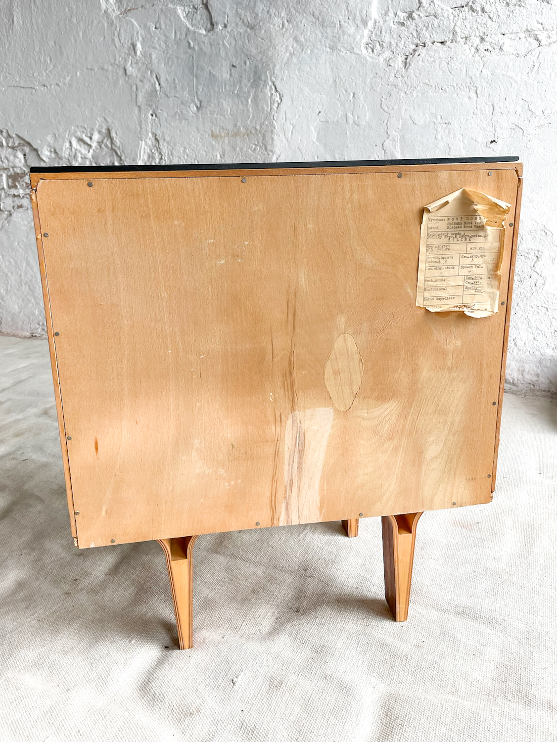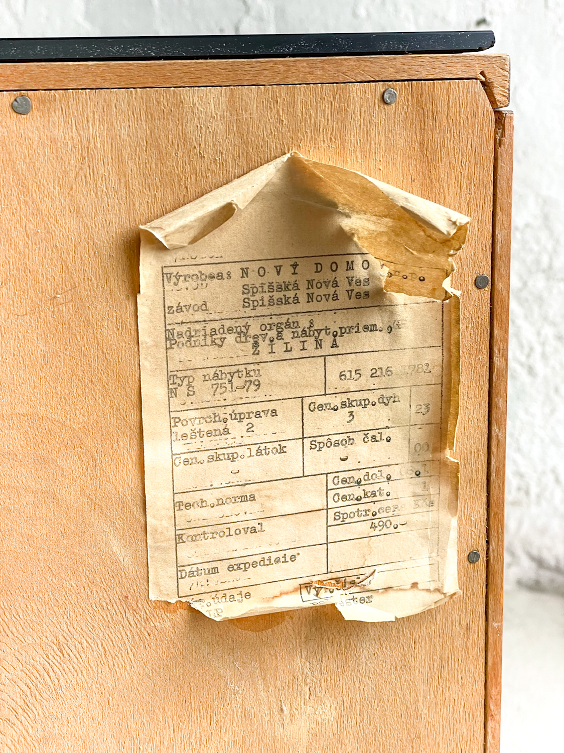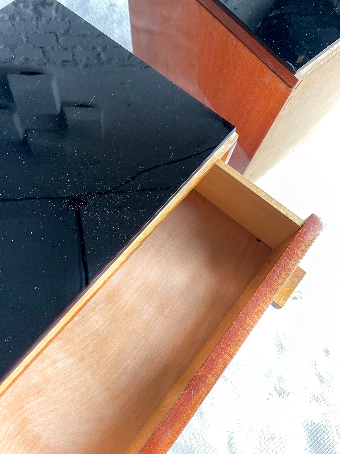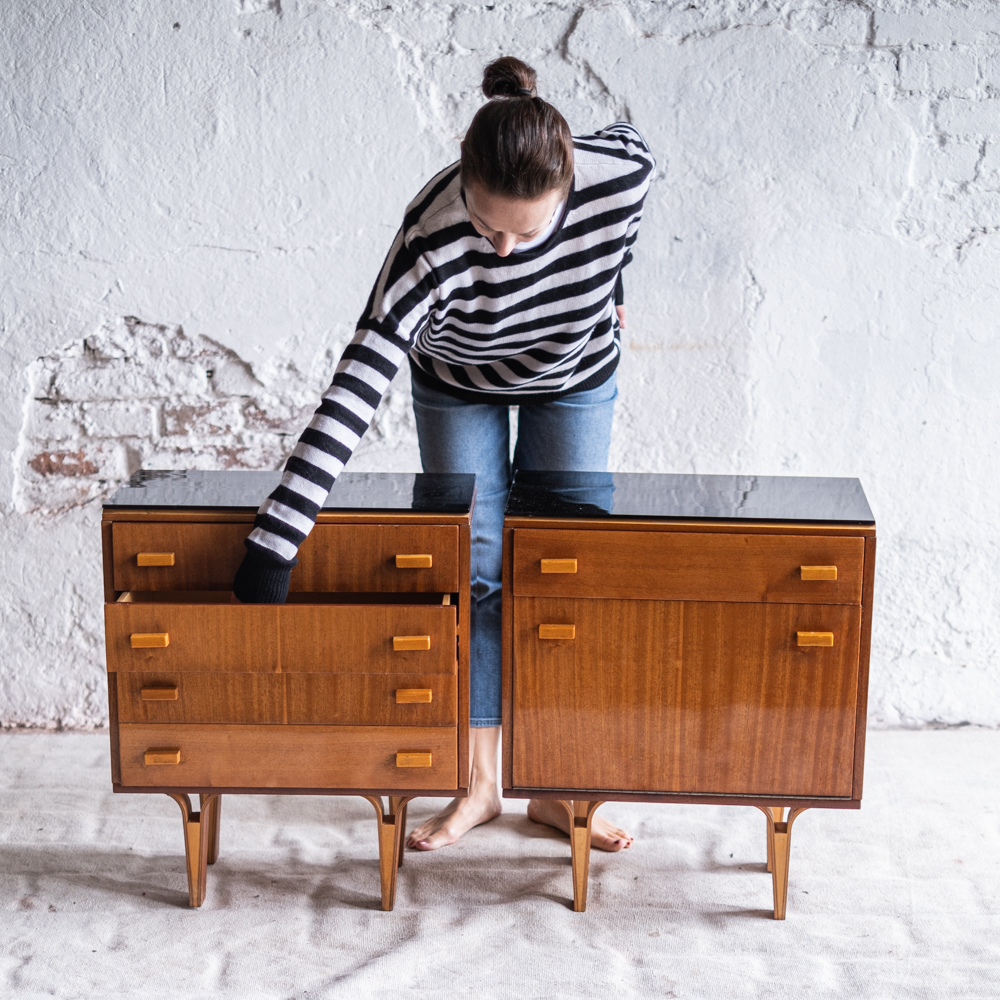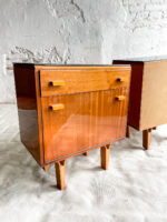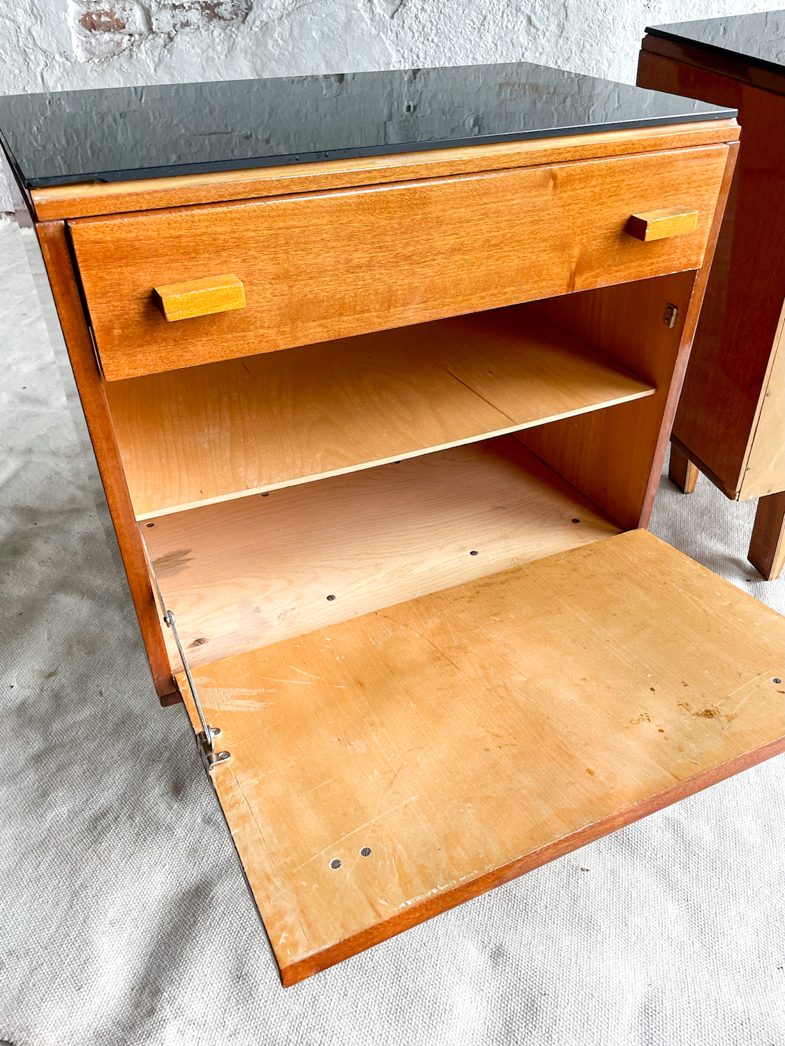 Set legendárních nočních stolků z 60. let 20. století od návrháře Františk Mezulánika. Návrhy tohoto známého architekta jsou charakteristické svou praktičností, jednoduchými liniemi a nadčasovostí. Noční stolky jsou v provedení dýhovaný masiv, lakování vysoký lesk a horní desku tvoří opaxitové sklo. Jeden stolek je s šuplíkem a výklopnými dvířky. Druhý stolek je tvořen čtyřmi šuplíky.