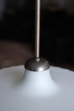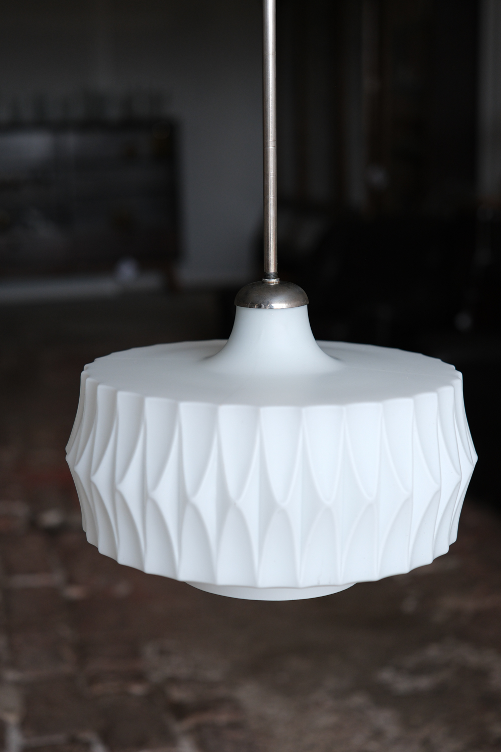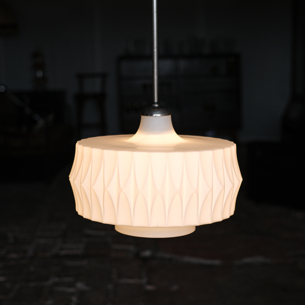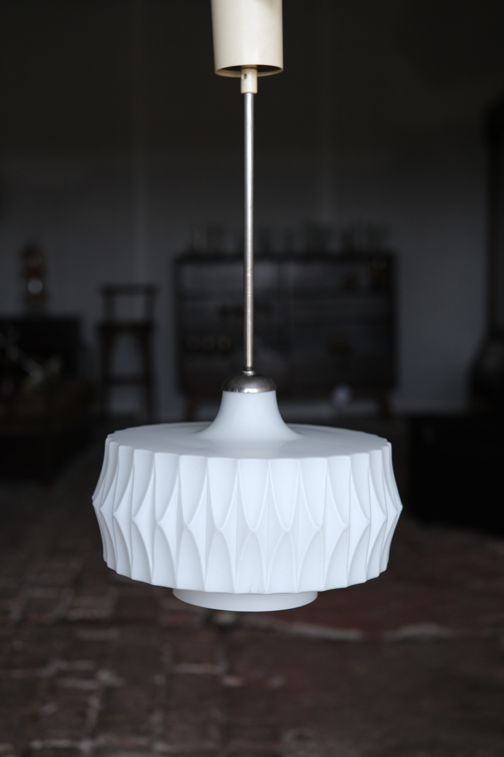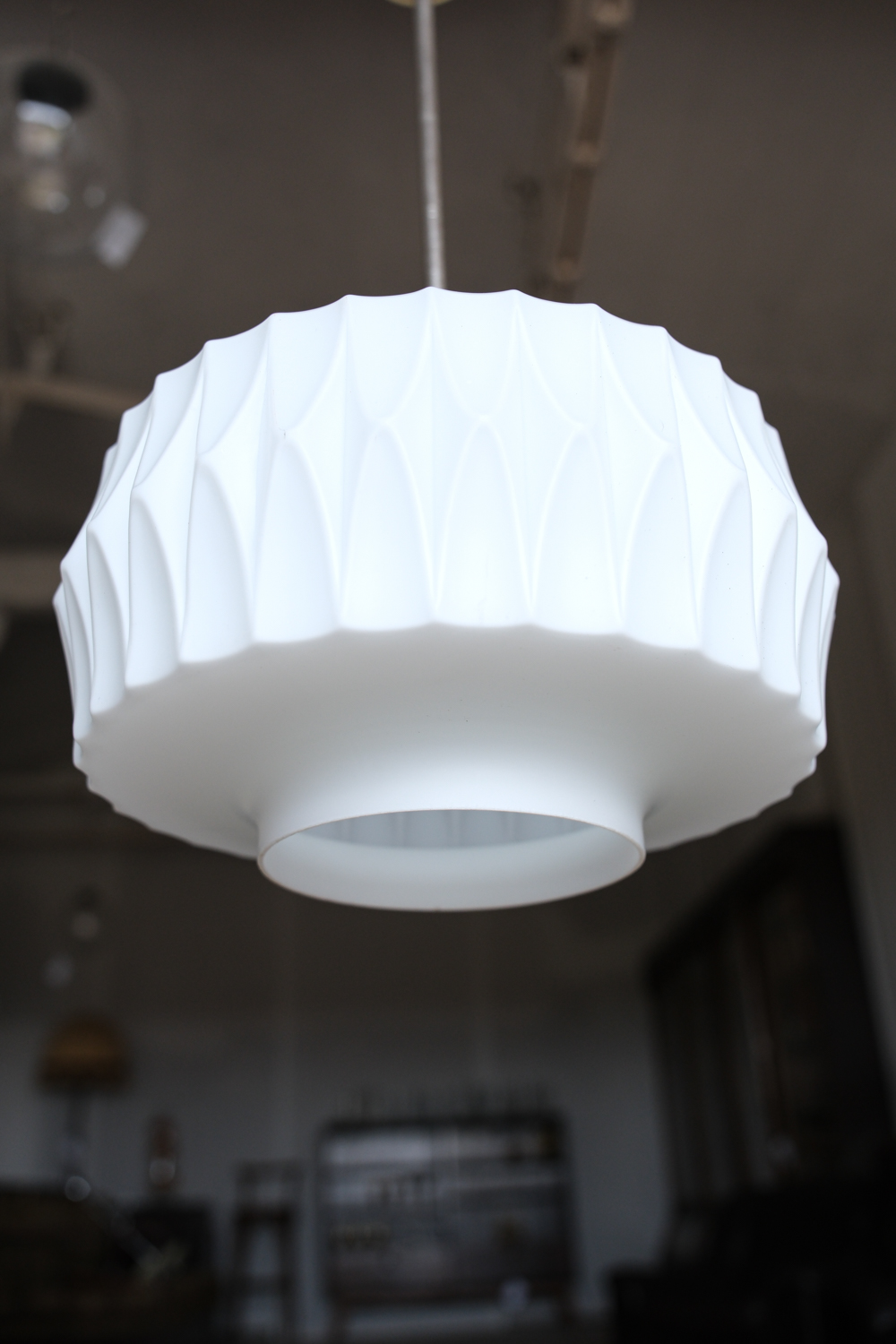 Tvarově výrazné závěsné svítidlo s plastickým dekorem, který vyniká zejména při rozsvícení. Bílá opálová skleněná stínidla s geometrickým reliéfem byla oblíbená zejména v 60. a 70. letech a dodnes zaujmou svou strukturální hrou světla a stínu. Tento model svým tvarem připomíná papírovou skládanku origami.