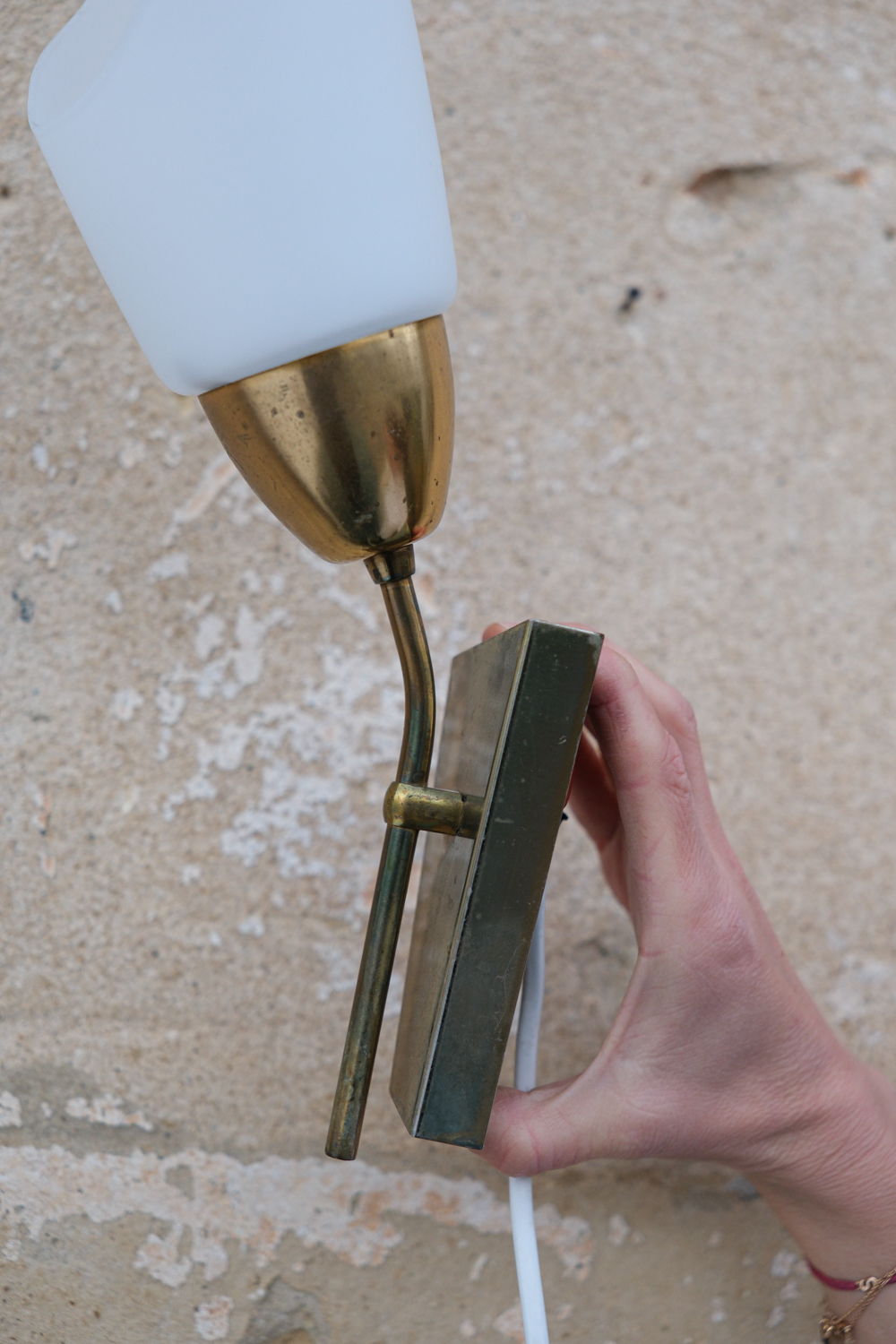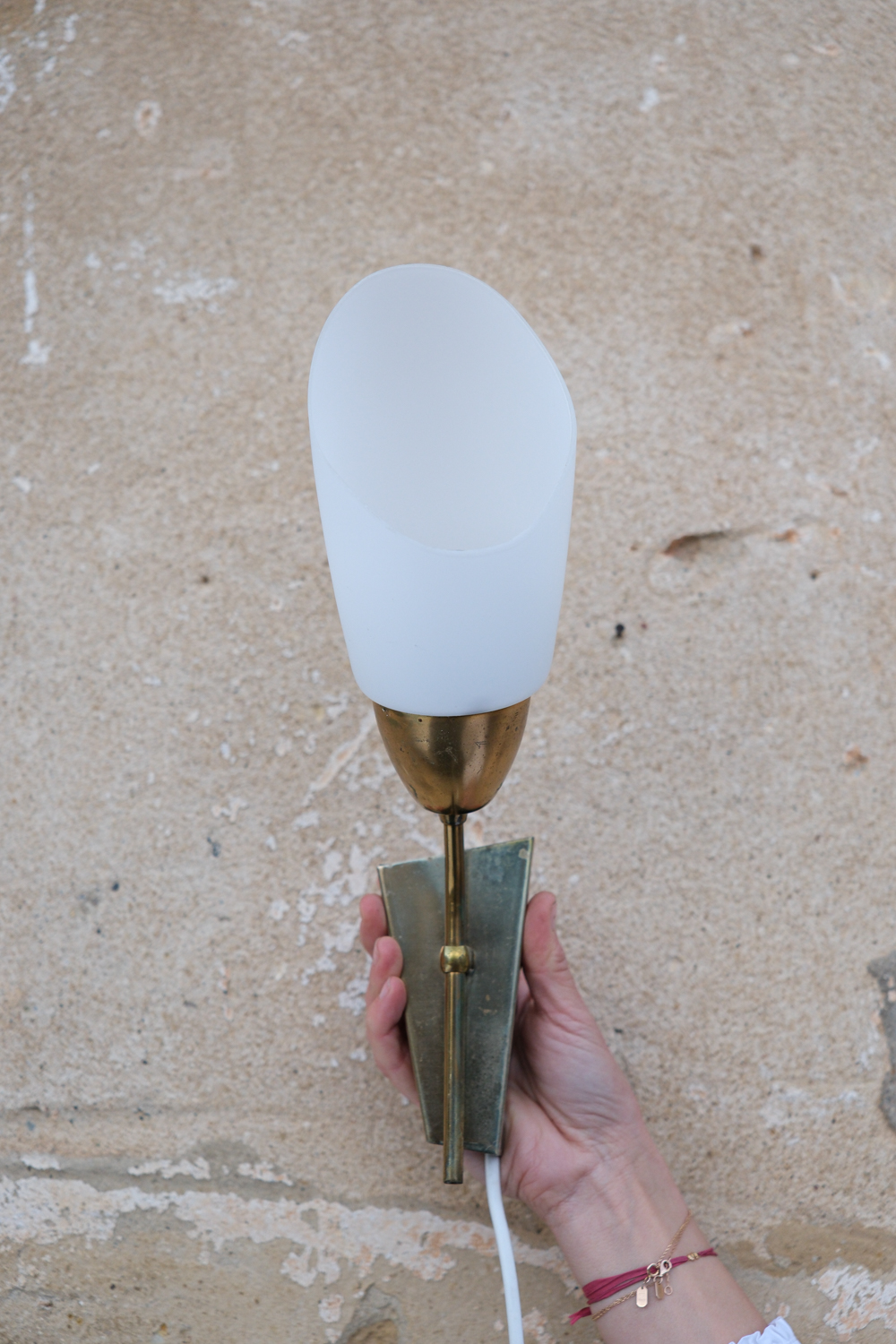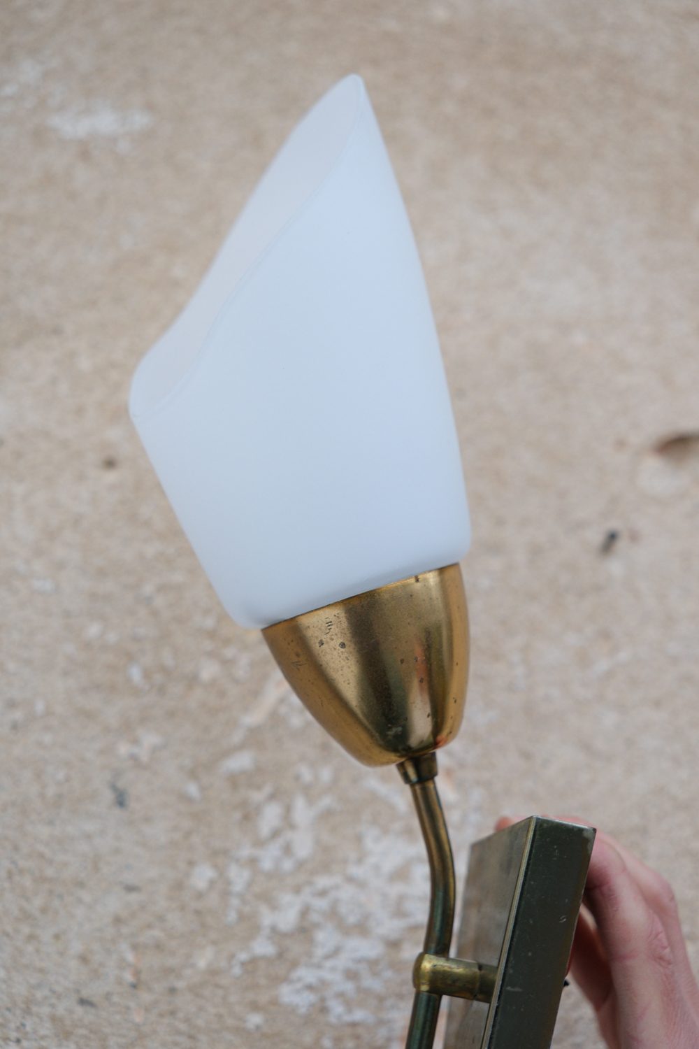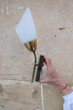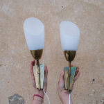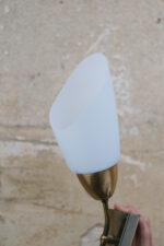 Dvojice nástěnných lamp s jemně tvarovaným skleněným stínidlem a mosaznou konstrukcí, která nese přirozenou patinu času.