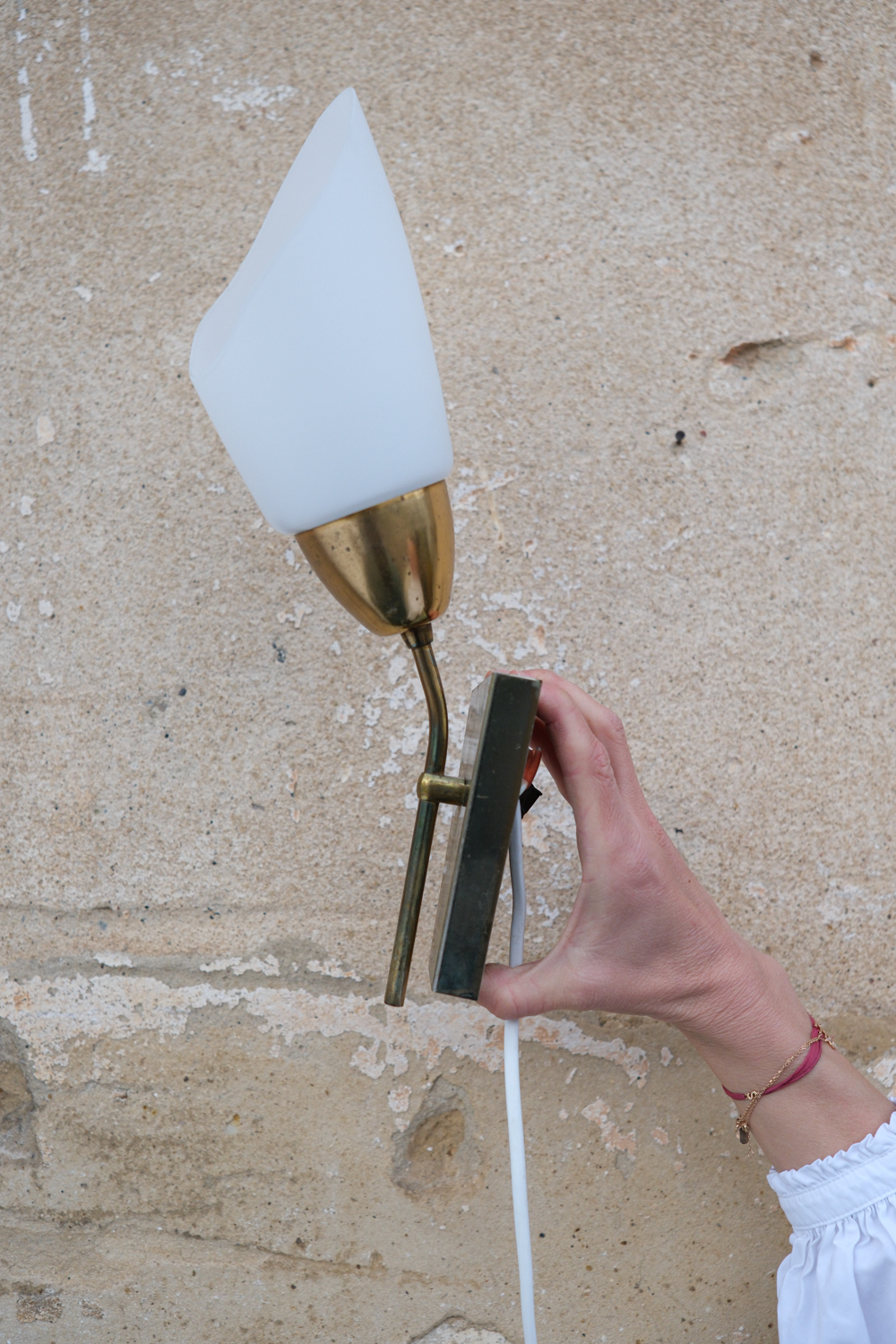 Na první pohled jednoduchý návrh doplňují drobné detaily – lehce lomený tvar stínidla i subtilní uchycení na stěnu. Celek působí vyváženě a klidně, bez zbytečné dekorativnosti.