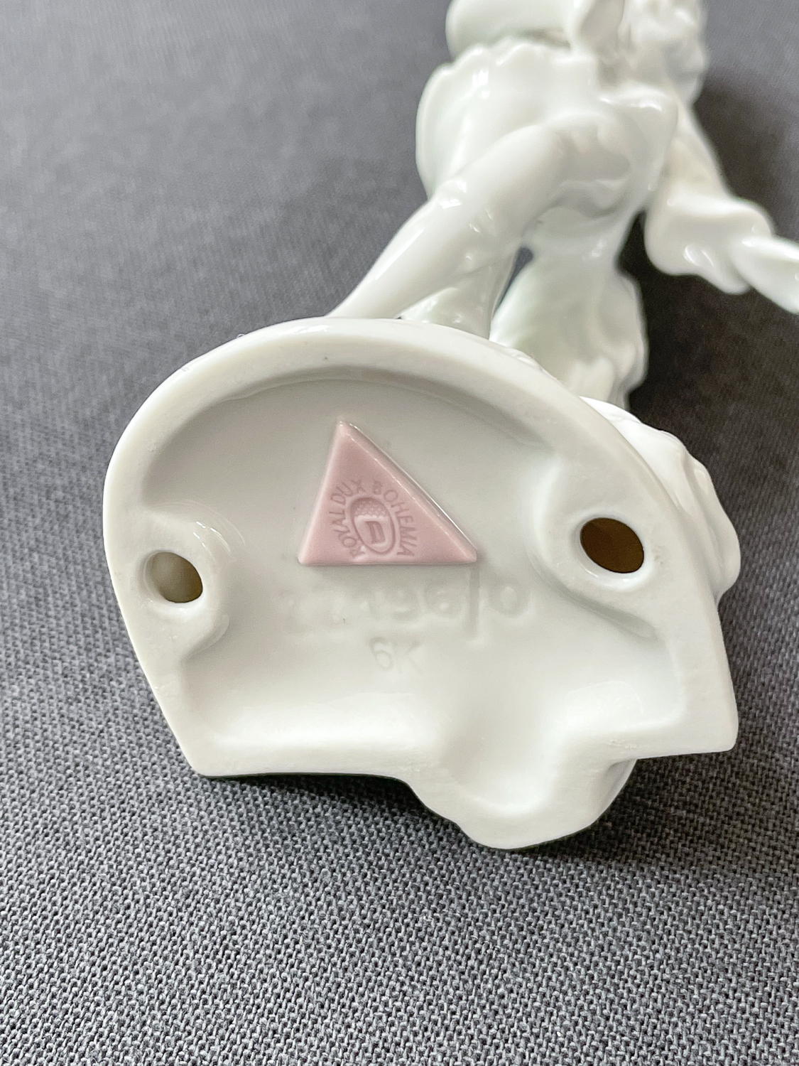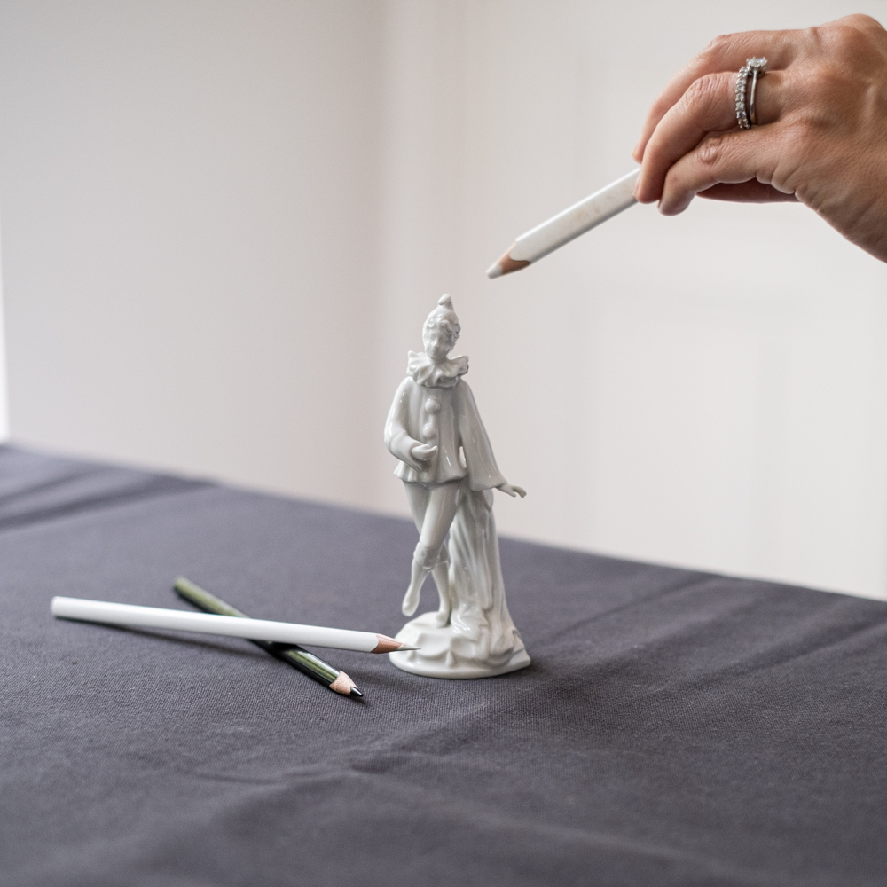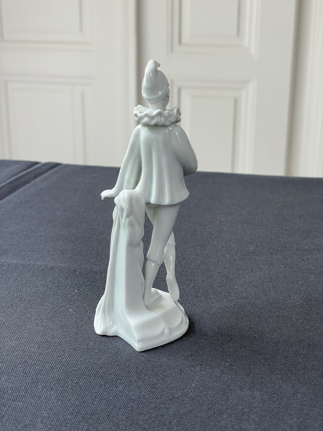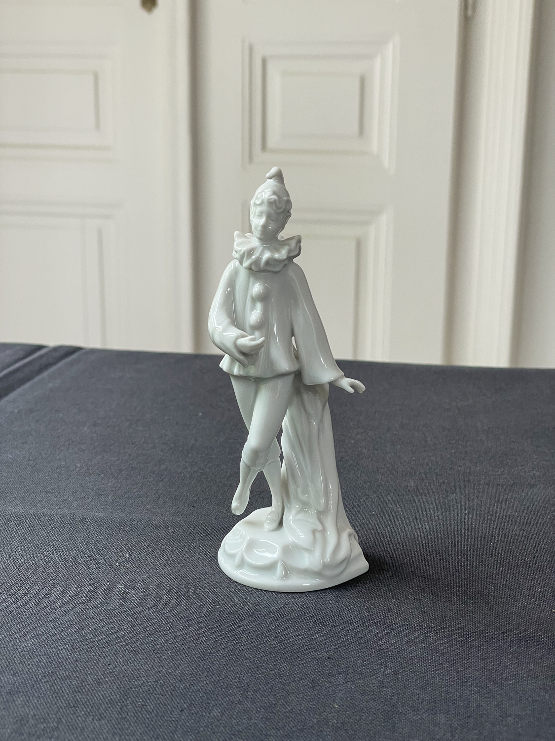 Porcelánová soška pierota, postavy z francouzsého lidového divadla, v typických dlouhých bílých šatech s velkými knoflíky. Soška je velmi detailně zpracovaná.