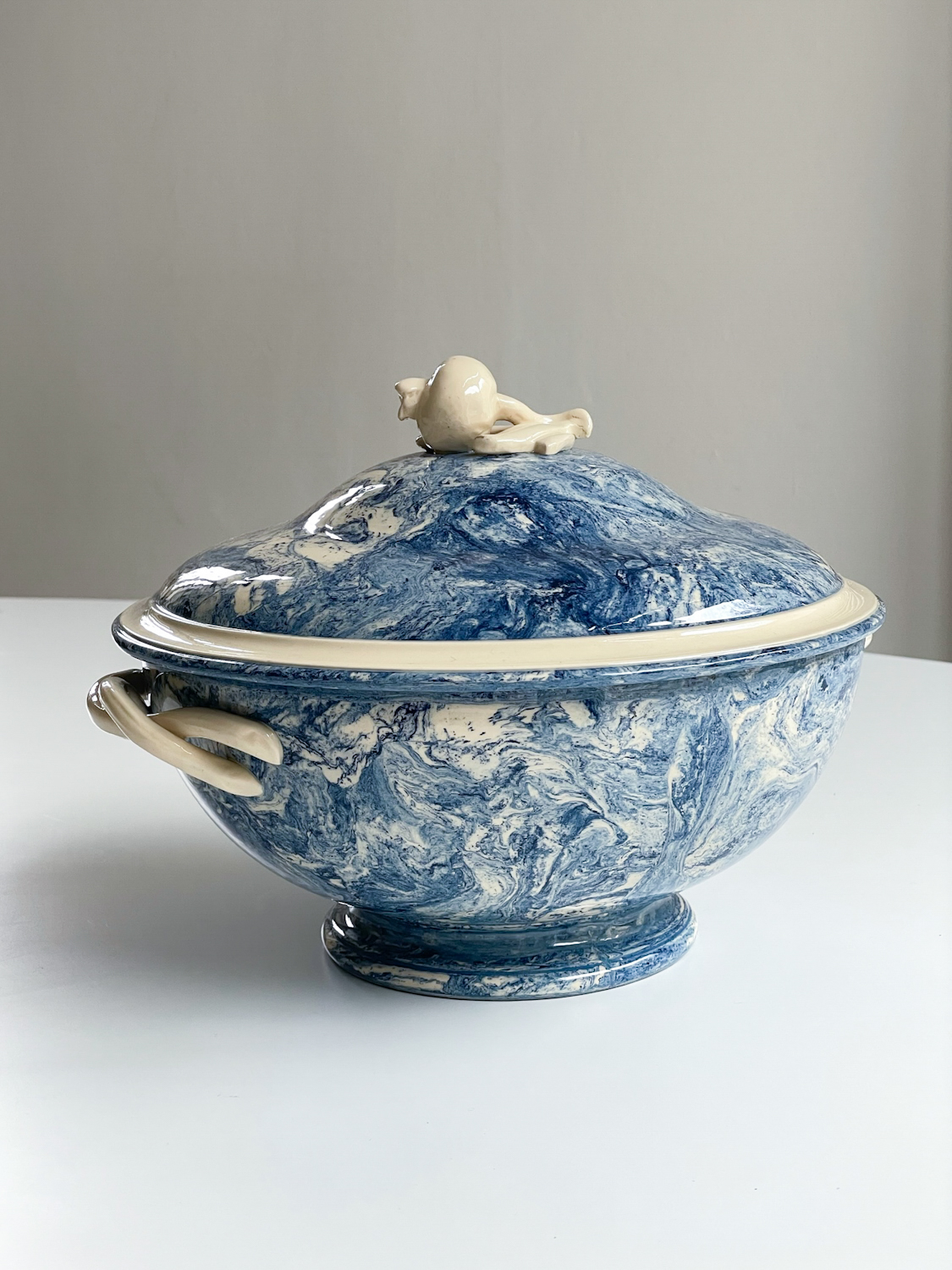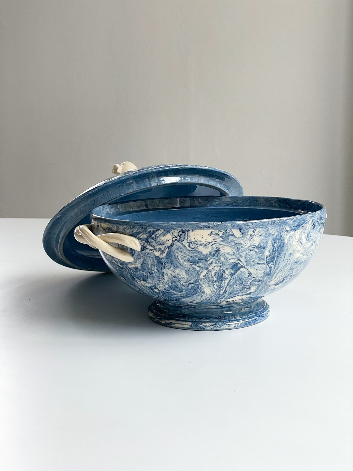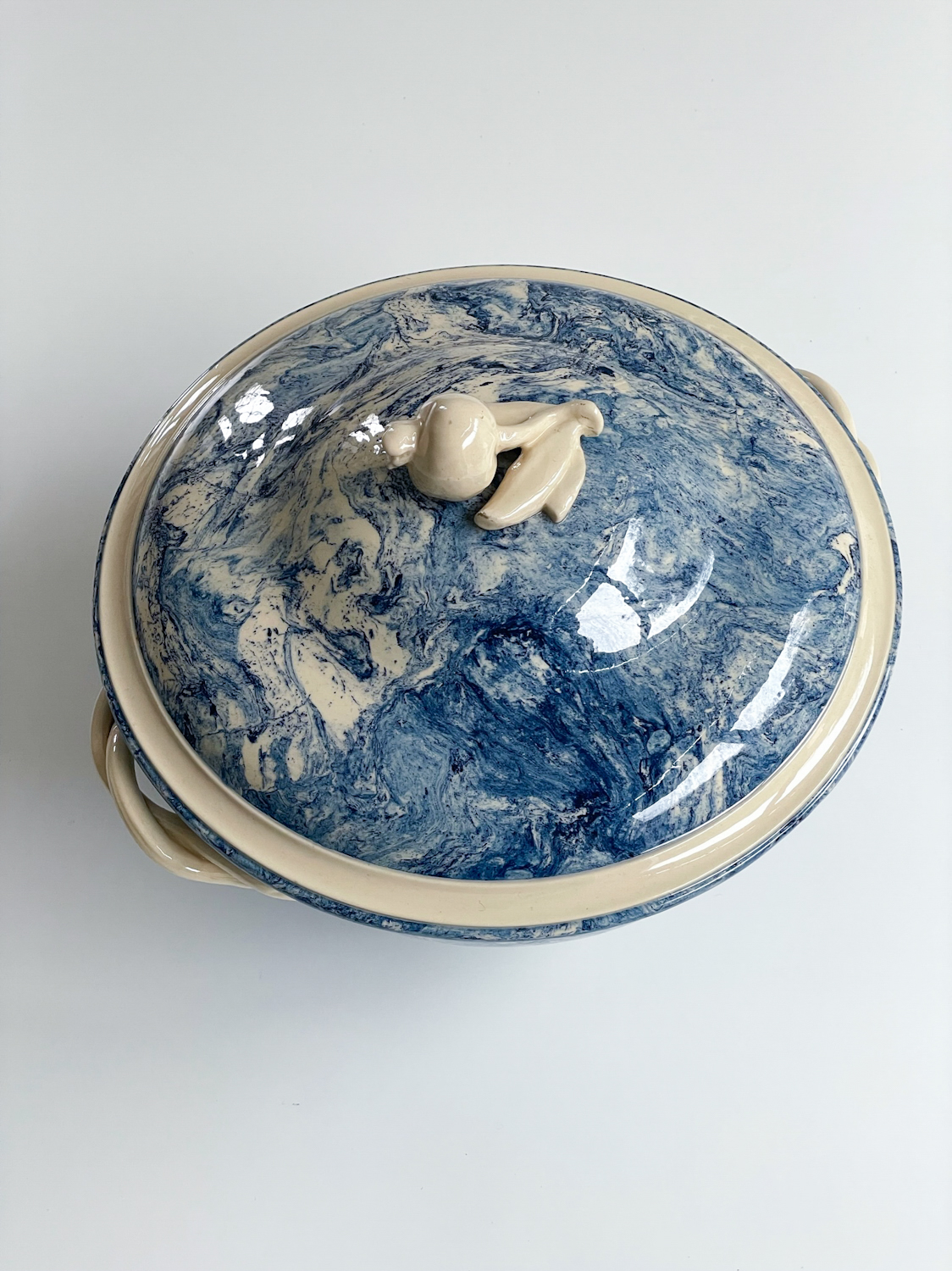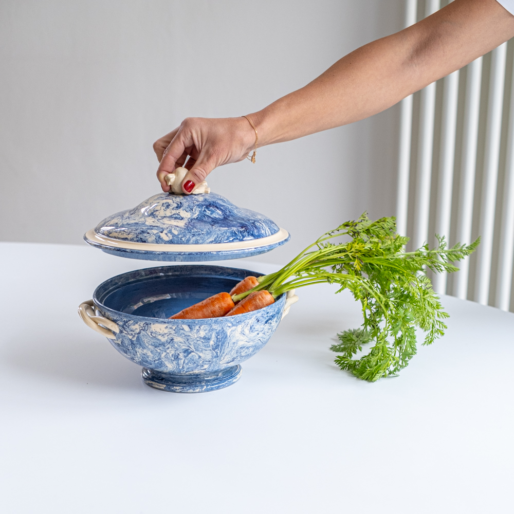 Krásná polévková mísa z Francie s abstraktním vzorem v blankytně moderé barvě v kombinaci se slonovou kostí. Mísa má zajimavě řešená ucha a úchyt na výčku ve tvaru granátového jablka. Za zmínku stojí i probarvení mísy uvnitř připomínající provedeni značky Wedgwood, ale značku se nám nepodařilo dohledat.