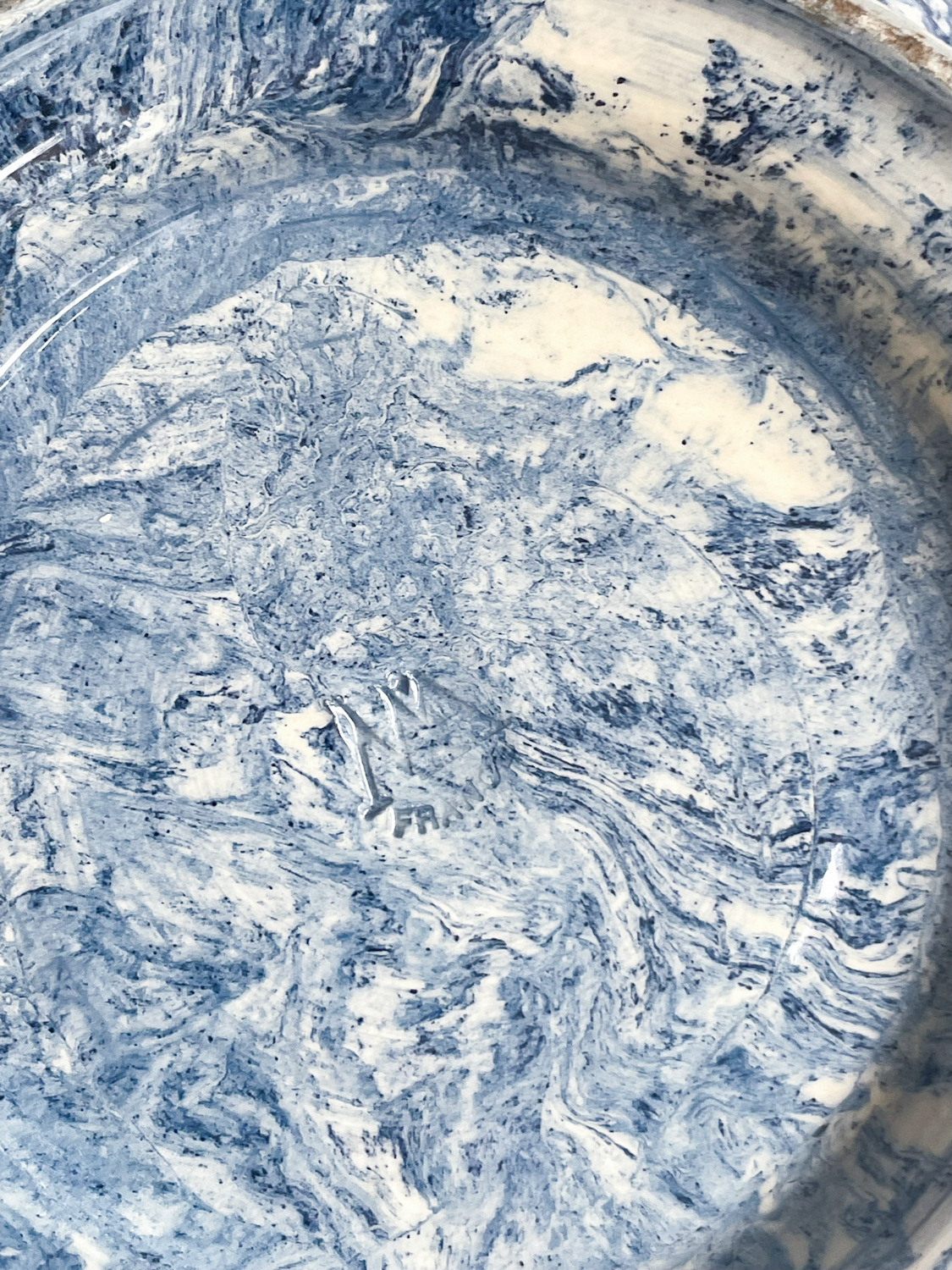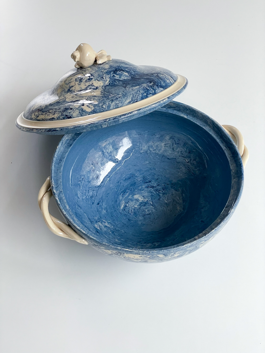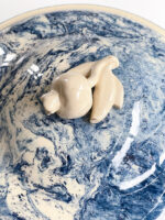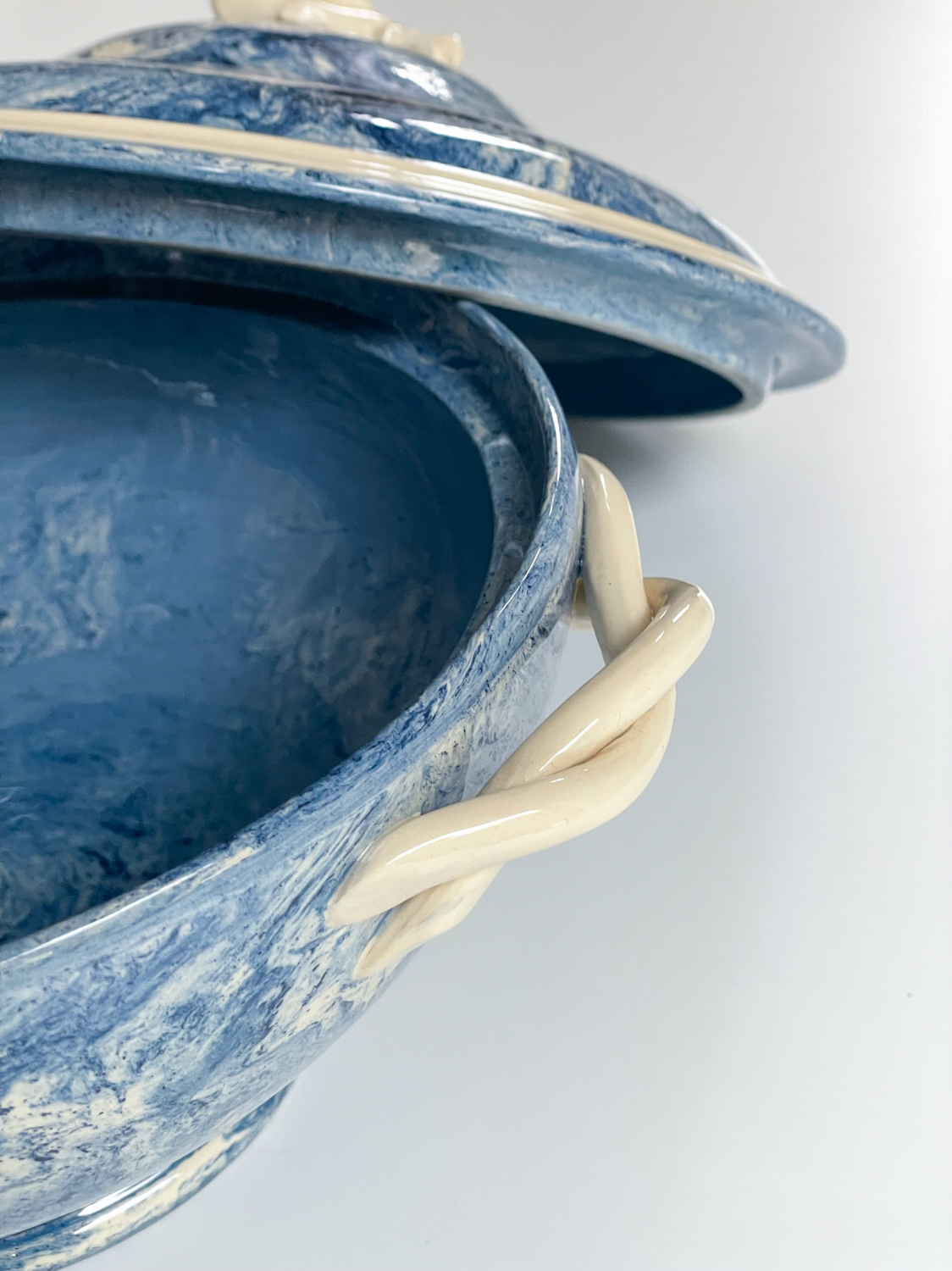 Krásná polévková mísa z Francie s abstraktním vzorem v blankytně moderé barvě v kombinaci se slonovou kostí. Mísa má zajimavě řešená ucha a úchyt na výčku ve tvaru granátového jablka. Za zmínku stojí i probarvení mísy uvnitř připomínající provedeni značky Wedgwood, ale značku se nám nepodařilo dohledat.