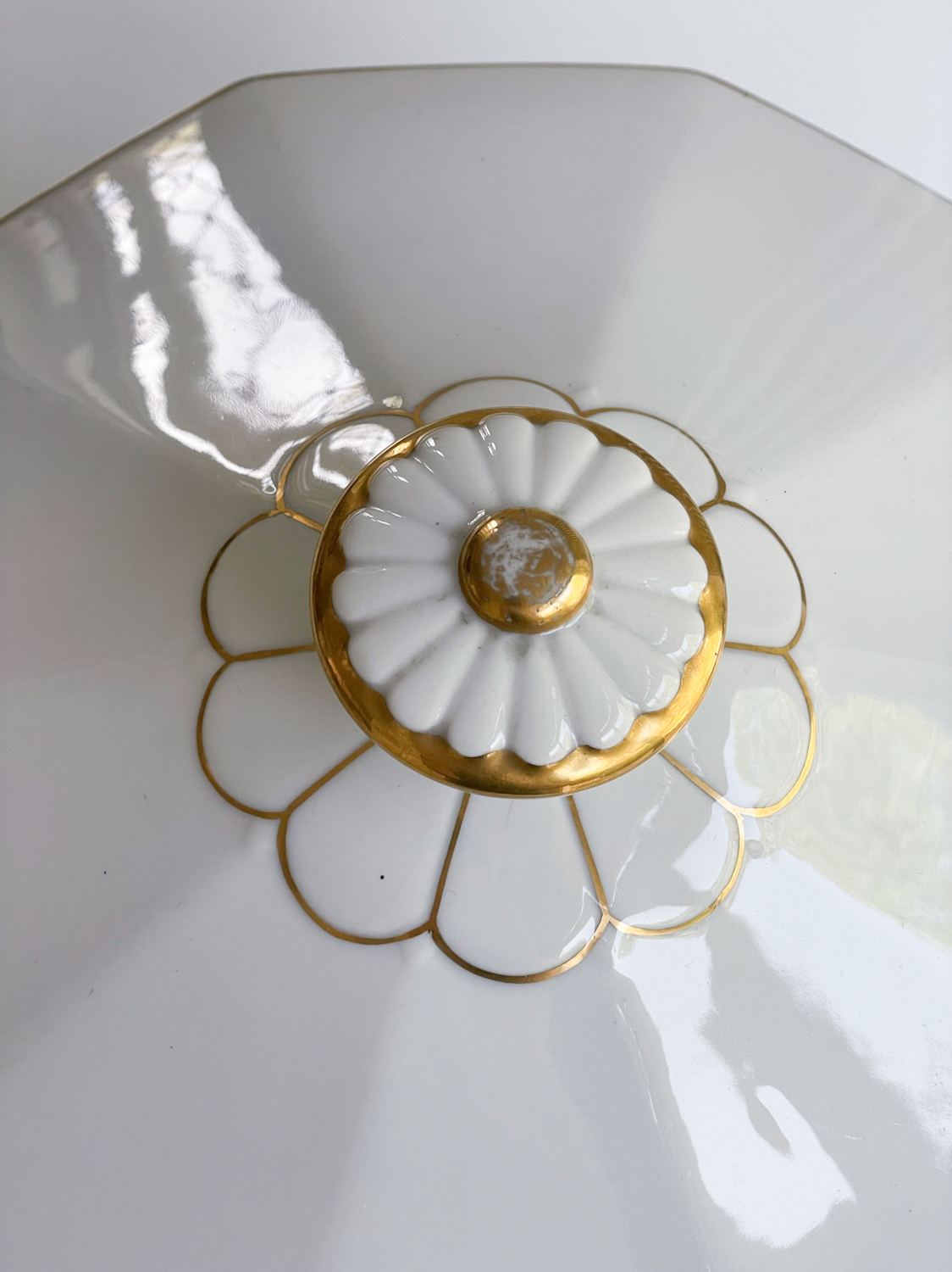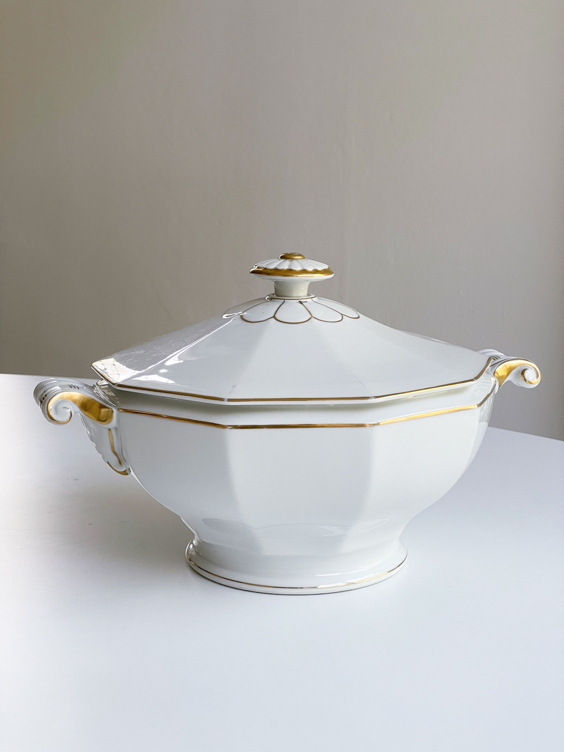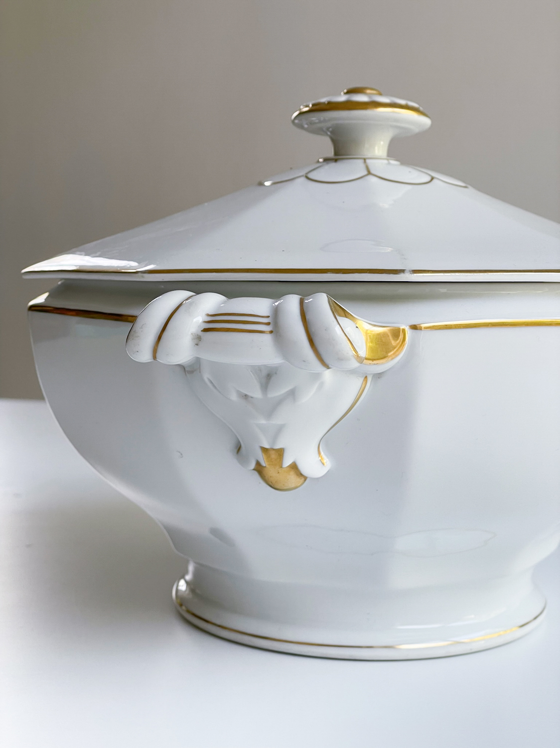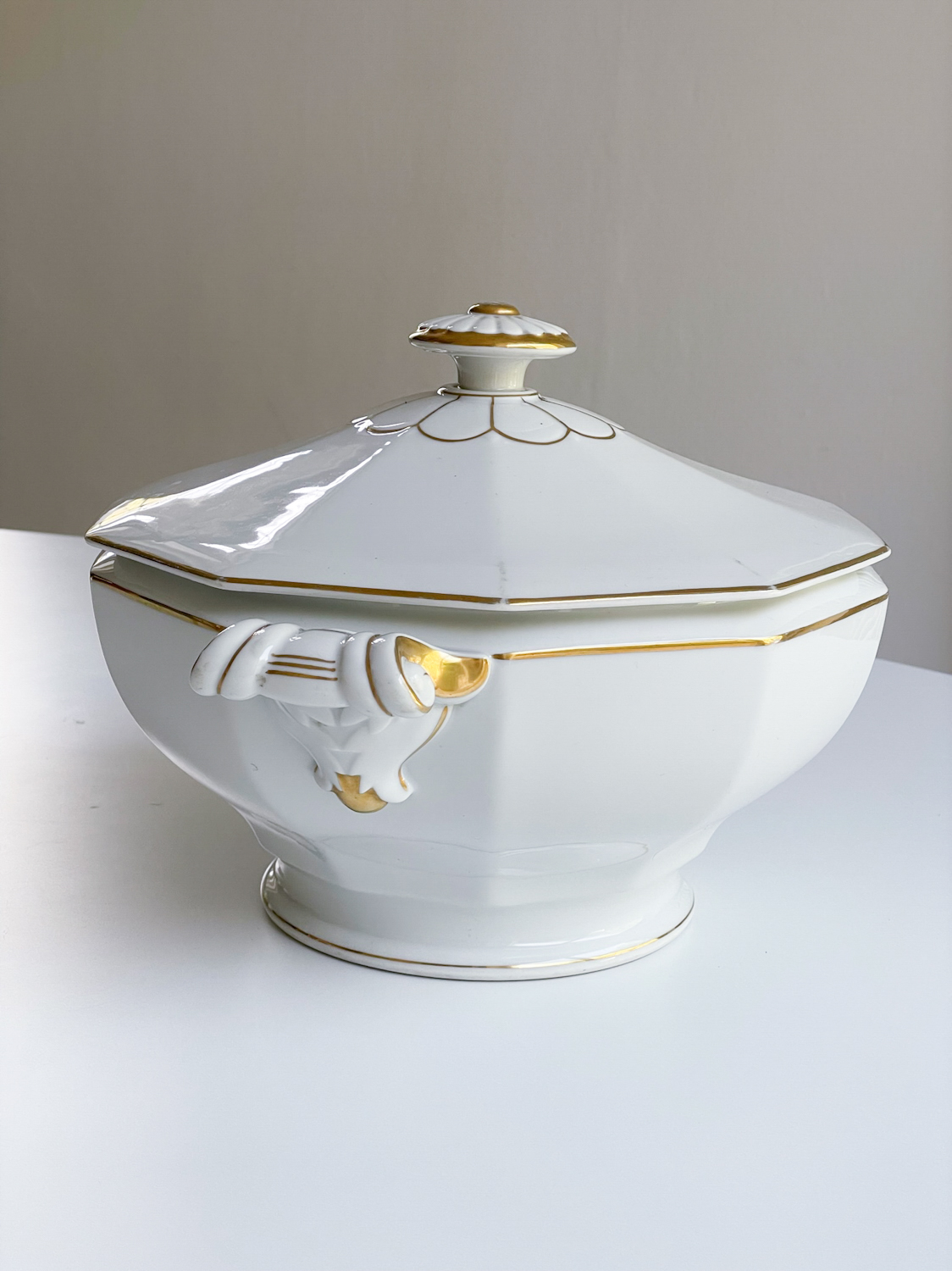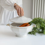 Krásná velká sváteční polévková mísa od české porcelánky Haas a Czjzek působí jak ze zámeckého stolu. Kombinace bílo zlaté je vždy velmi elegantní. Svátečnost mísy umocňuje i její tvar a bohatě zdobená ucha včetně úchytu na víčku.