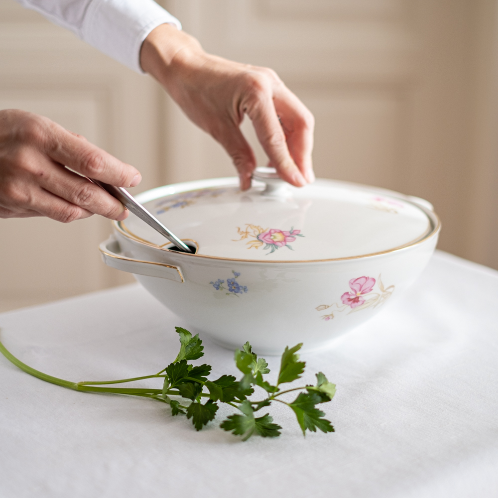 Polévkové mísy jsou asi spíše vánoční záležitost, ale tahle je vyloženě jarní/letní. A proč si neudělat sváteční tabuli i v průběhu roku, že? Pokud třeba na velikonoční svátky čekáte velkou rodinnou sešlost, bude se vám tato terina hodit, protože pojme přes 2l polévky.