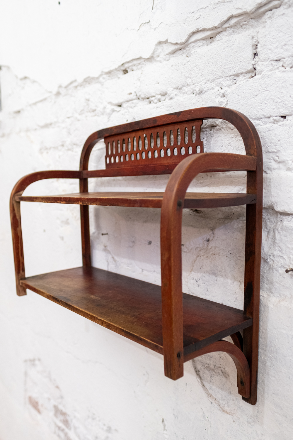 Málo vídaná dřevěná polička od firmyThonet. Dřevo sice nese známky patiny, ale konstrukčně je v pořádku.