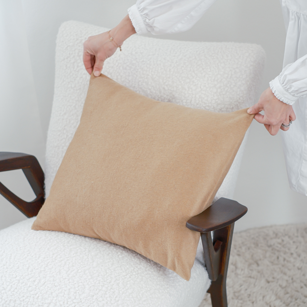 Polštář ze směsi vlny a kašmíru v béžové barvě. Výplň (duté vlákno) je součástí polštáře. Ze stejné látky máme k dispoczici také povlak se zajímavým prošitím.