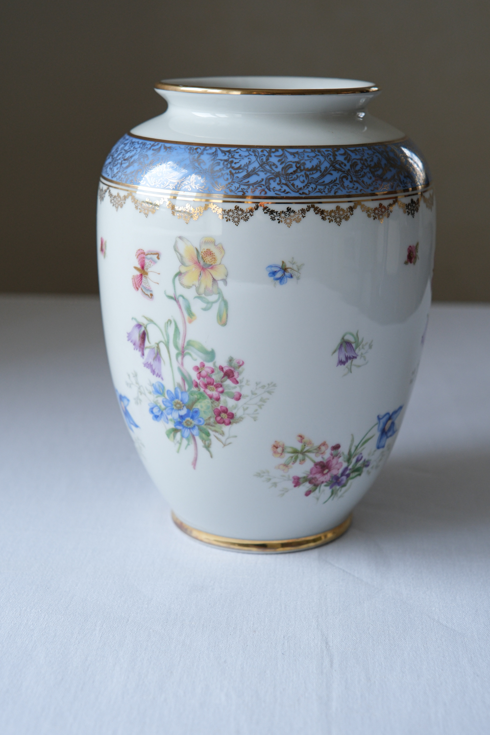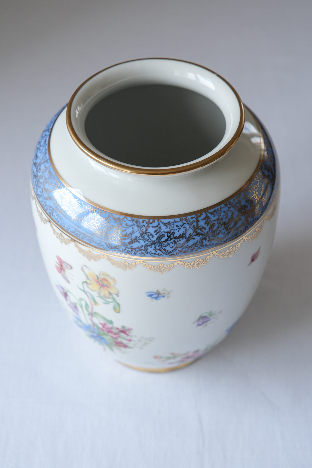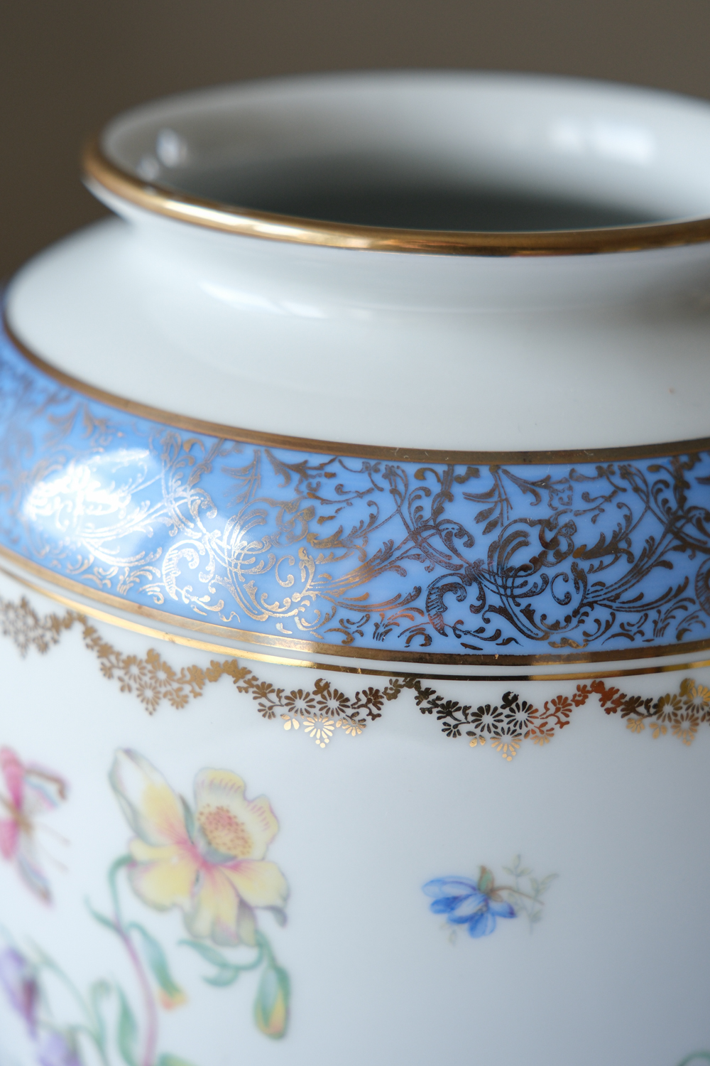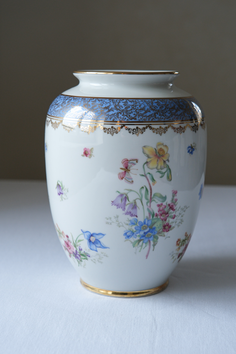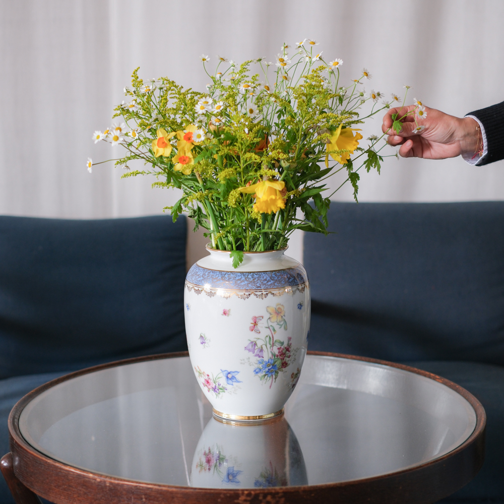 Porcelánová váza z produkce Bavaria s bohatším květinovým dekorem, doplněným zlatými detaily a výraznější modrou bordurou v horní části. Dekor je živý a barevný, ale díky klasickému základu nepůsobí přehnaně – naopak přináší do interiéru jasný akcent.