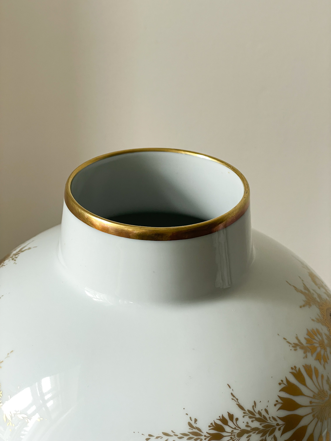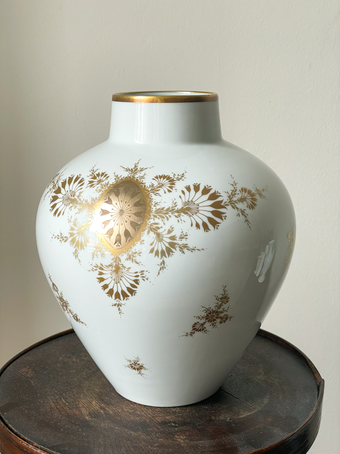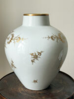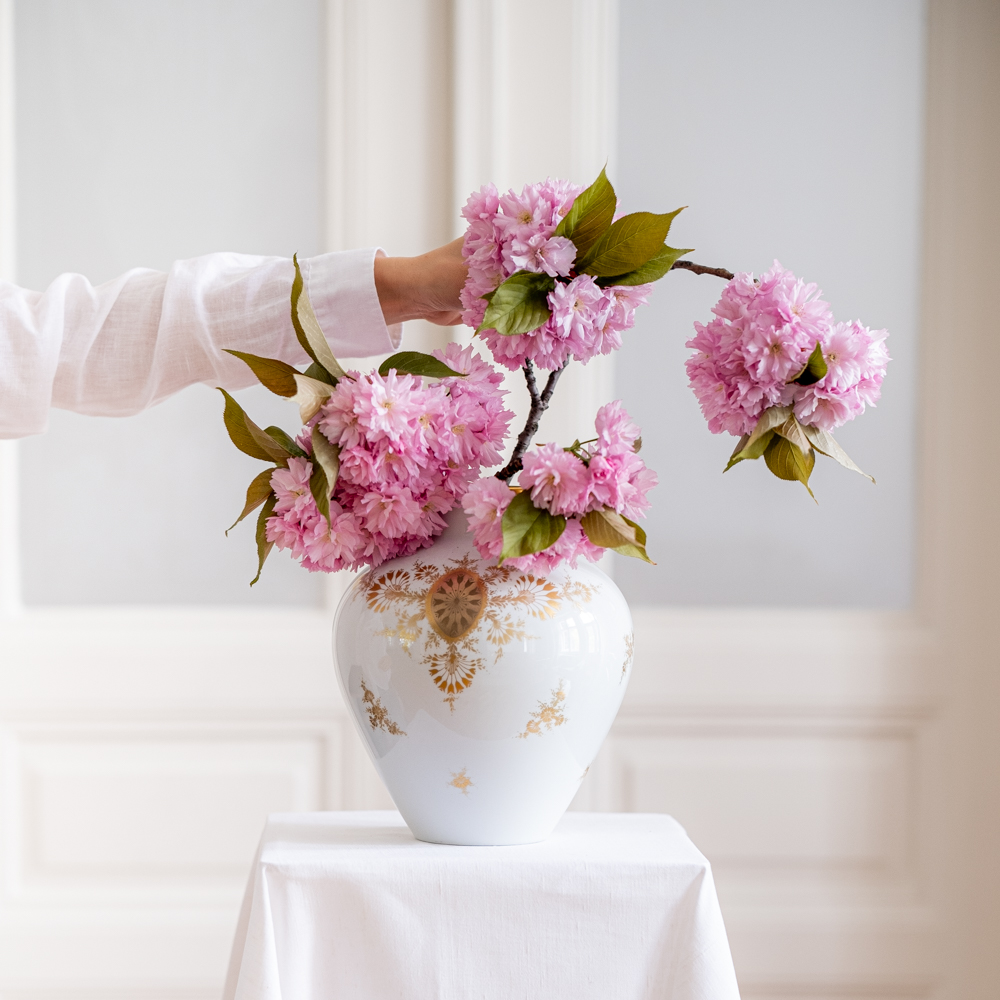 Buclatá velká váza s abstraktním vzorem květin ve zlaté barvě je svou konstrukcí vhodná i na menší košaté větve.