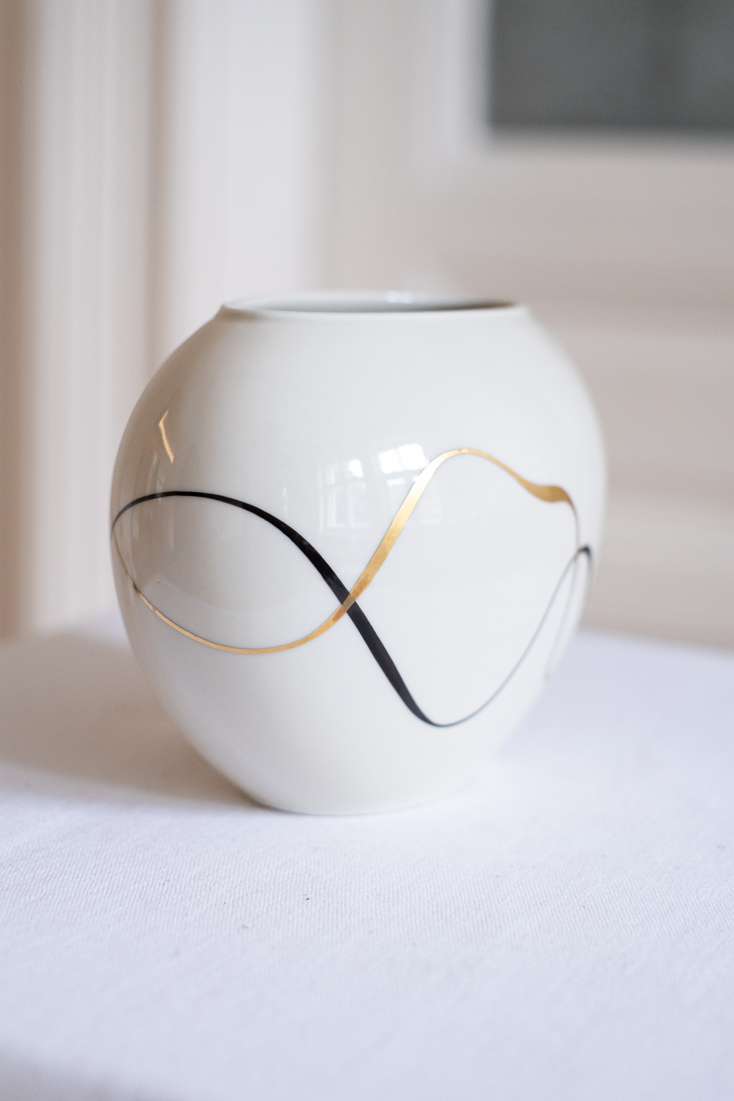 Porcelánová váza značky Creidlitz v barvě slonové kosti se zajímavým abstraktním zdobením ve zlato-černé barvě. Váza pochází z již zaniklé německé porcelánky, založené v roce 1913. Bude krásným doplňkem interiéru, i když v ní zrovna nebudete mít květiny. Slušet to v ní bude ale napřílad na podzim astrám nebo na jaře petrklíčům.