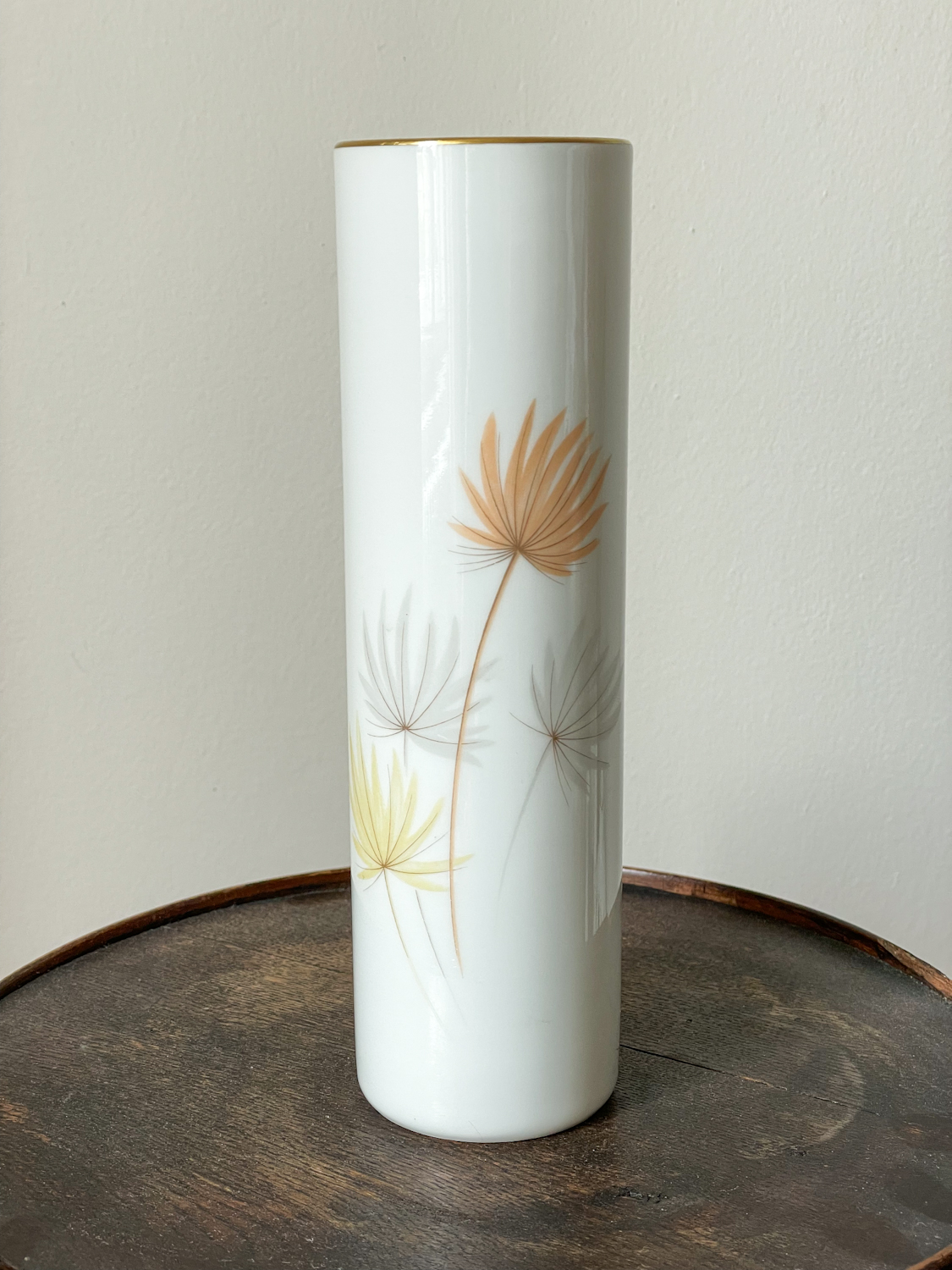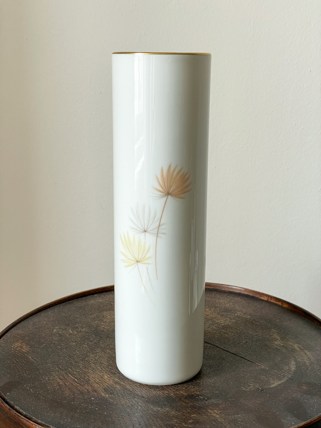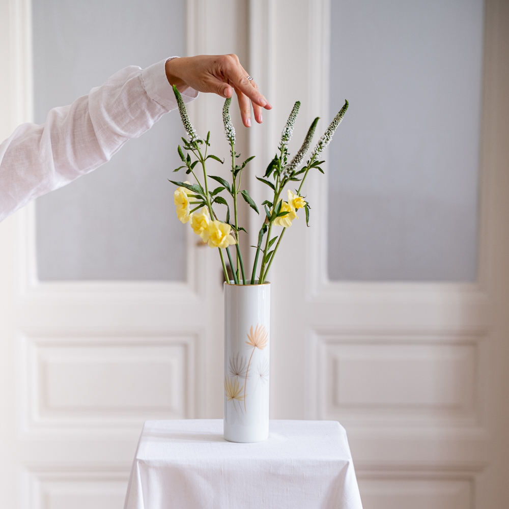 Jednoduchá váza ve tvaru válce s jemným pastelovým vzorem listů. Vhodná na vyšší jemné květiny.