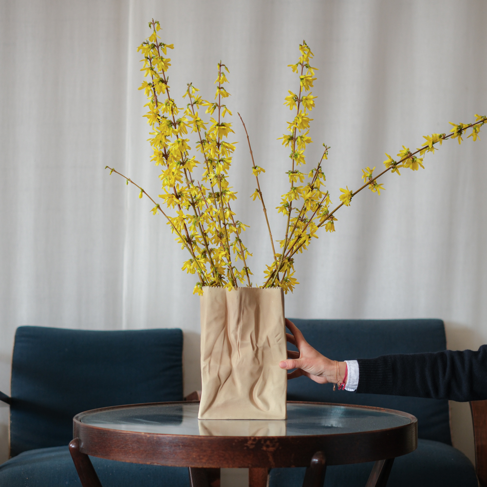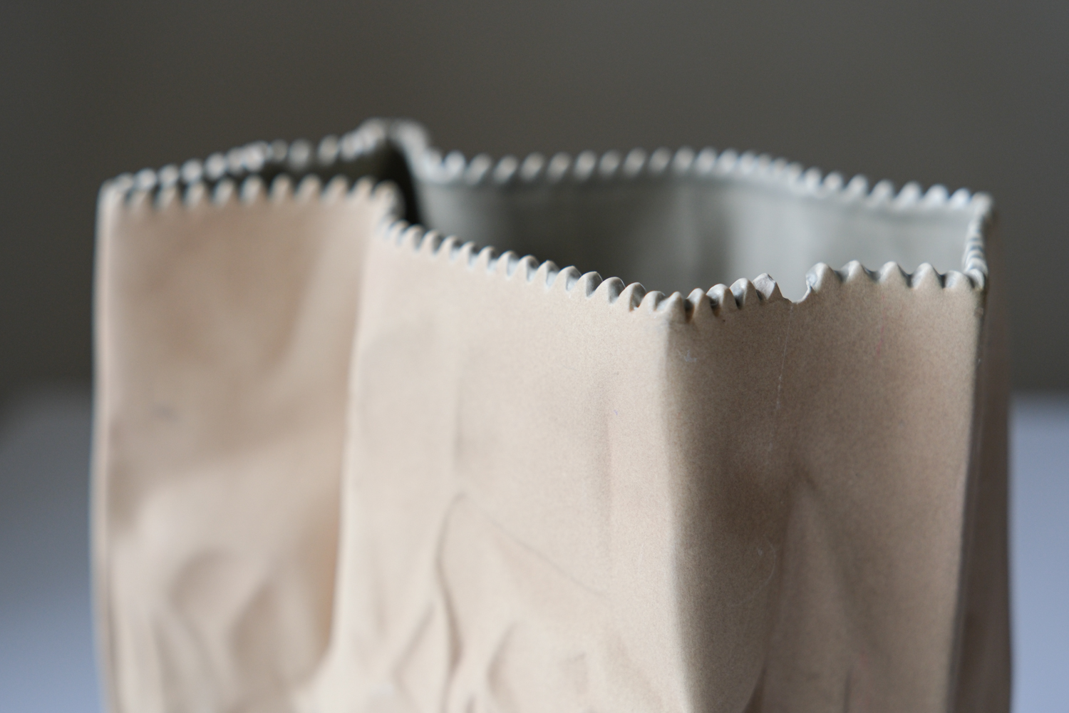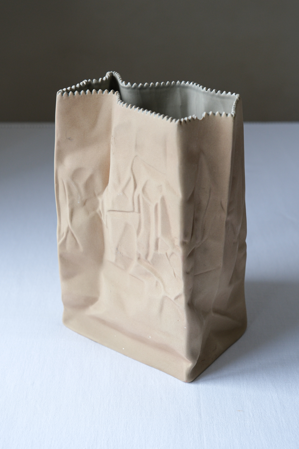 Designová porcelánová váza z produkce Rosenthal podle návrhu Tapio Wirkkaly z konce 70. let. Typický „pytlový“ tvar vychází z motivu zmačkaného papírového sáčku, který je převeden do porcelánu s až sochařskou lehkostí.