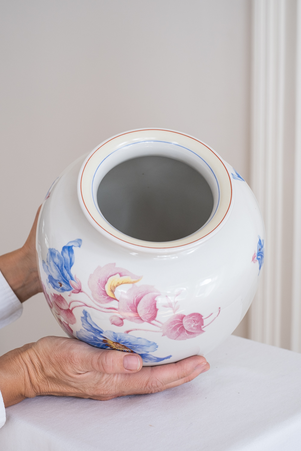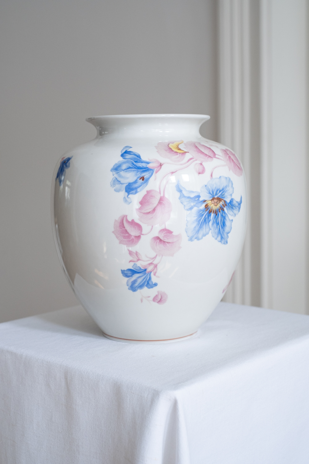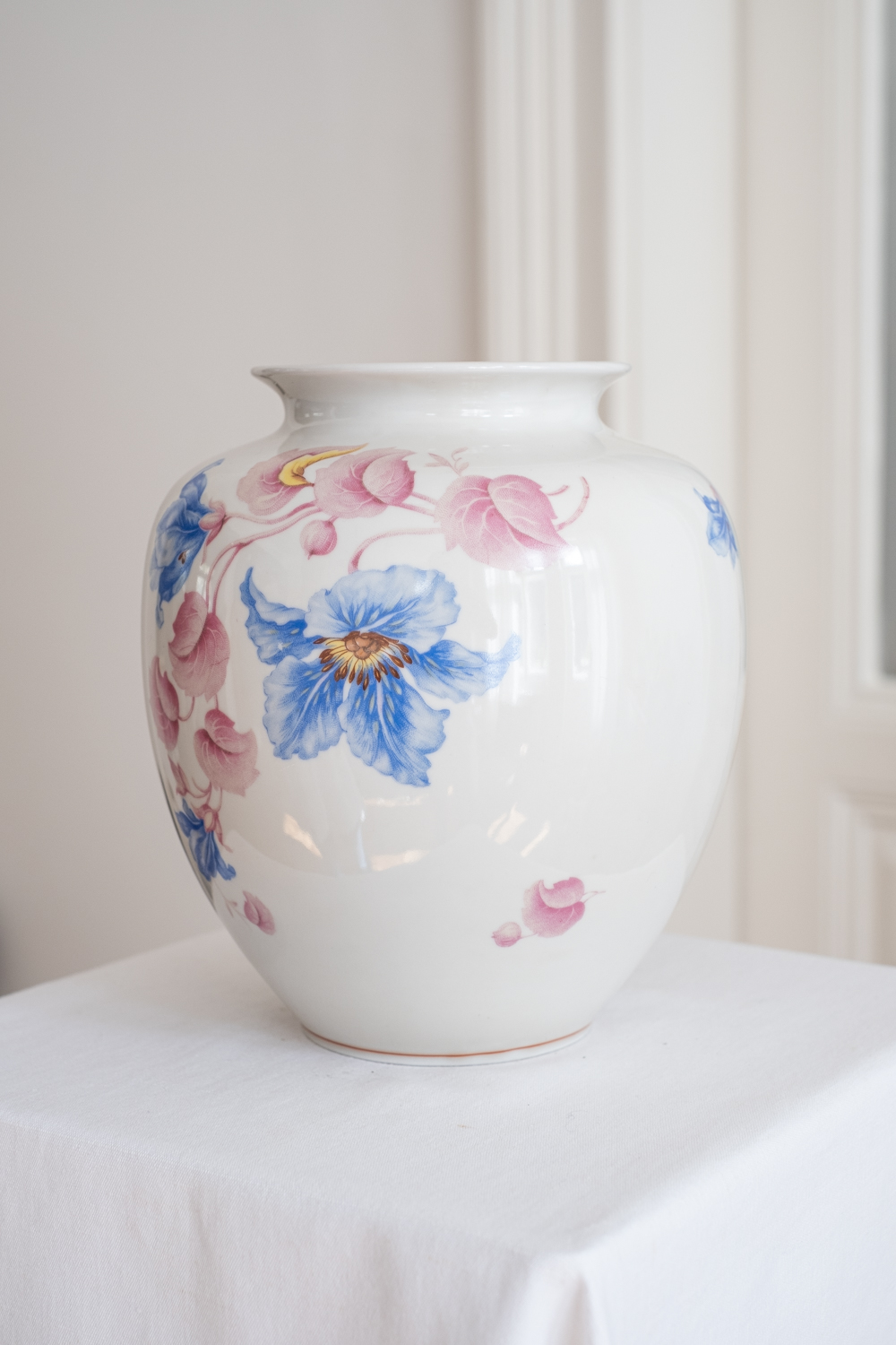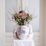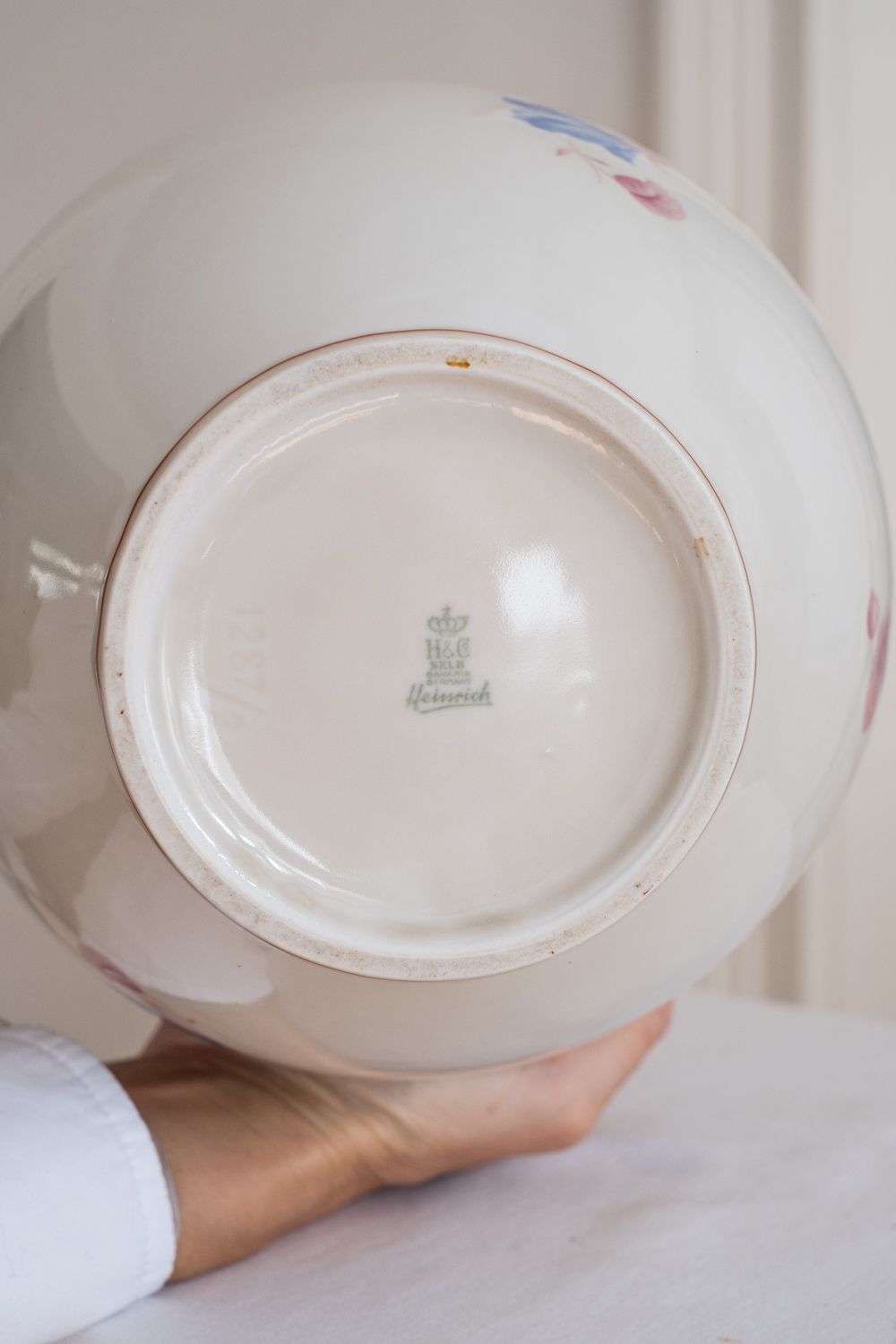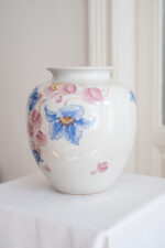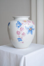 Nádherná váza s květinovým dekorem, u které jsme se hodně rozmýšlely, zda si ji nenechat. Pochází ze Slavkova z nejstarší porcelánky v Čechách – Haas a Czjek. Jelikož se jedná o větší a výraznou vázu, bude jí to slušet v patřičném prostoru – hala, konferenční stolek jen pro ni nebo velký jídelní stůl. Obsáhne poměrně dost květin, ale vzhledem k výraznému květinovému zdobení, postačí již jednoduhová květinová dekroace.