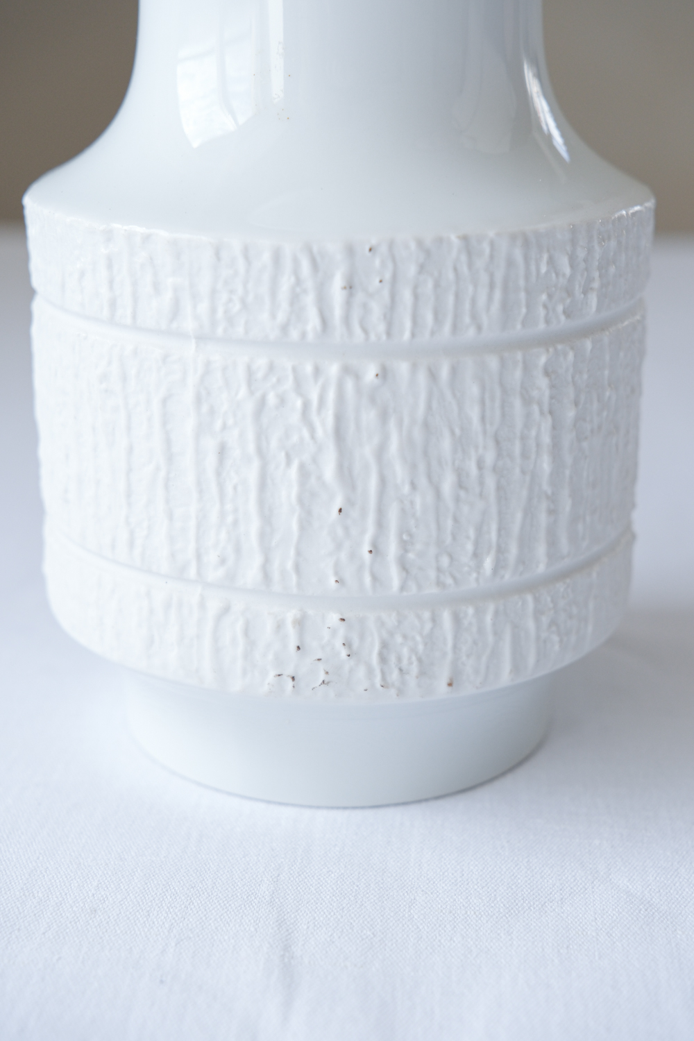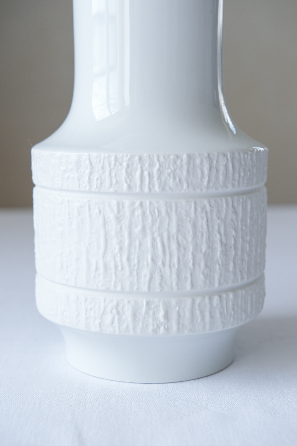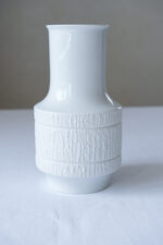 Porcelánová váza z produkce Thomas v čistě bílé barvě, která stojí na kombinaci jednoduchého tvaru a výraznějšího povrchového dekoru. Spodní část je v matném bisquit provedení s jemným reliéfem, zatímco horní zůstává hladká a lesklá, což vytváří příjemný kontrast.