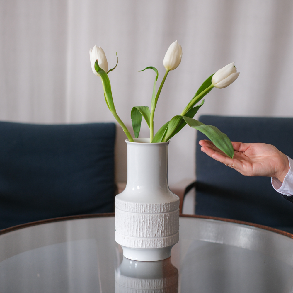 Díky užšímu hrdlu dobře drží i menší kytice nebo jednotlivé květy, které v ní působí přirozeně a vzdušně. Bílý porcelán navíc nechává vyniknout samotné aranžmá.