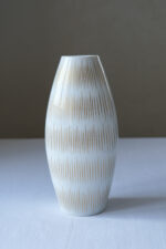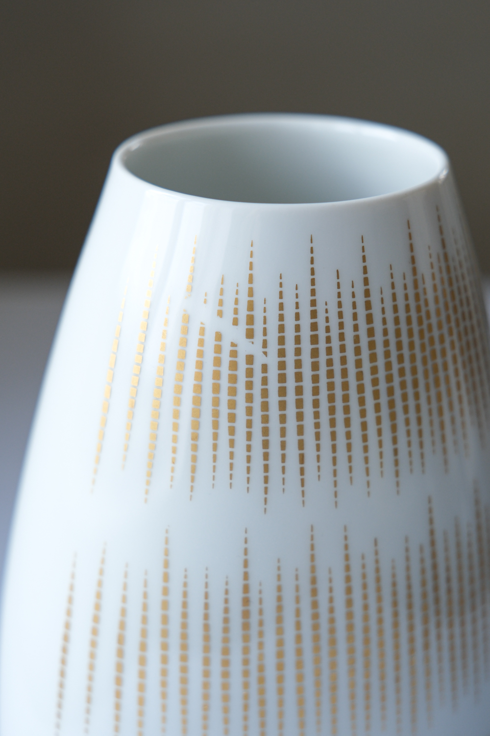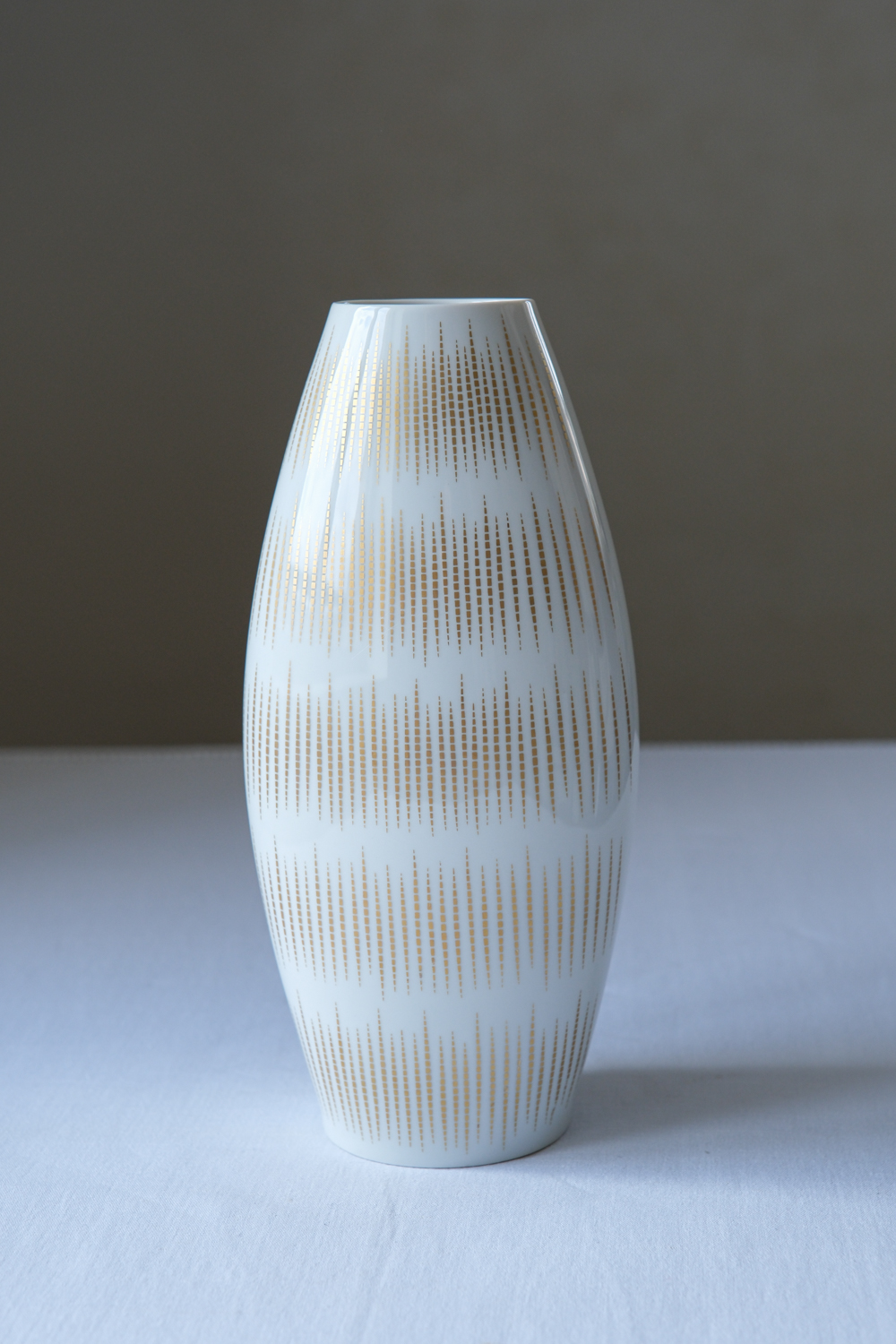 Porcelánová váza z produkce Thomas v bílé barvě s jemným zlatým dekorem. Štíhlý, lehce se rozšiřující tvar působí elegantně a dobře pracuje s výškou aranžmá.