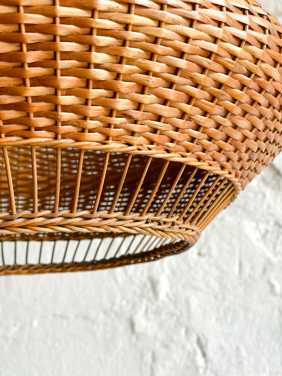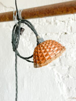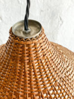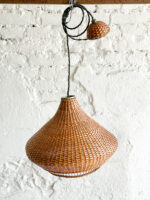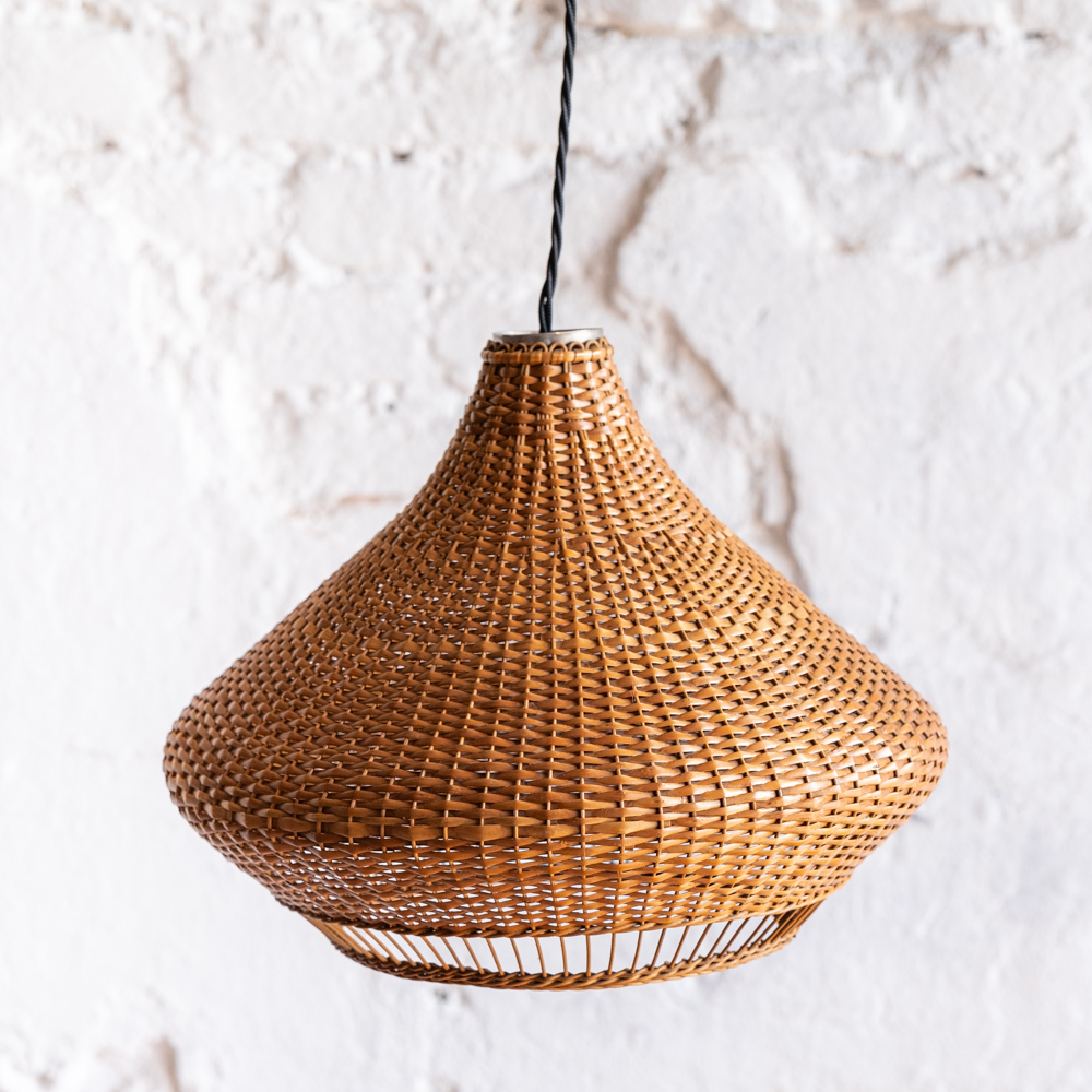 Retro proutěný lustr na textilní šňůře s proutěnou krytkou na uchycení u stropu. Vhodný nad jídelní stůl do bytu, kde bude působit hřejivým dojmem, ale i kamkoliv na chalupu.
