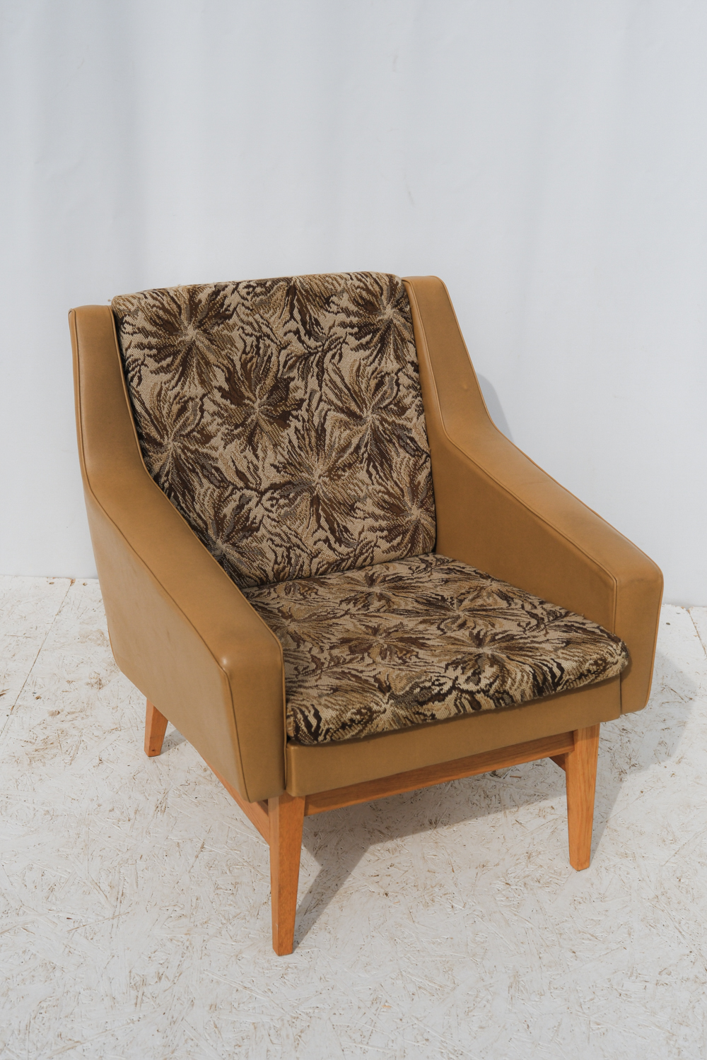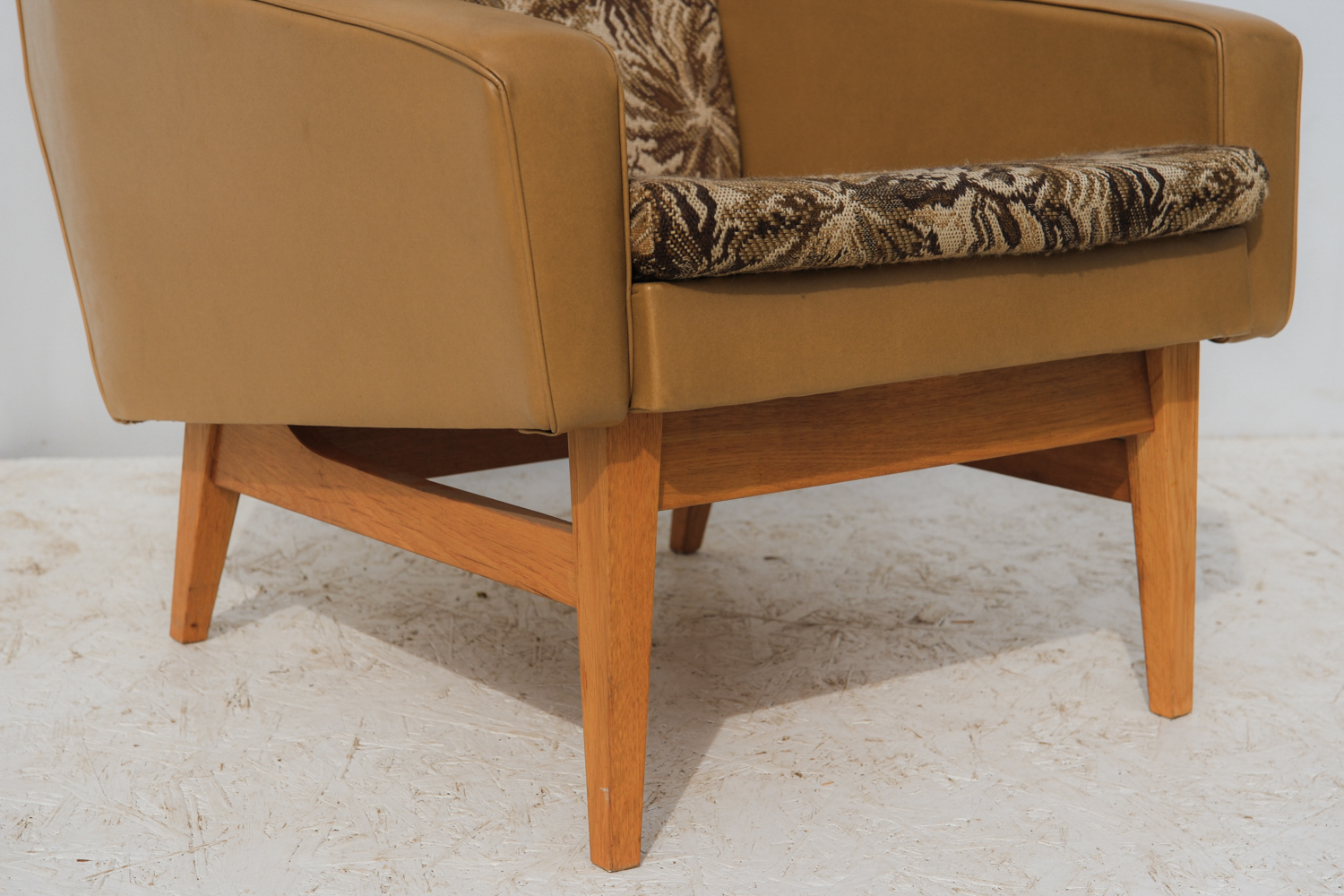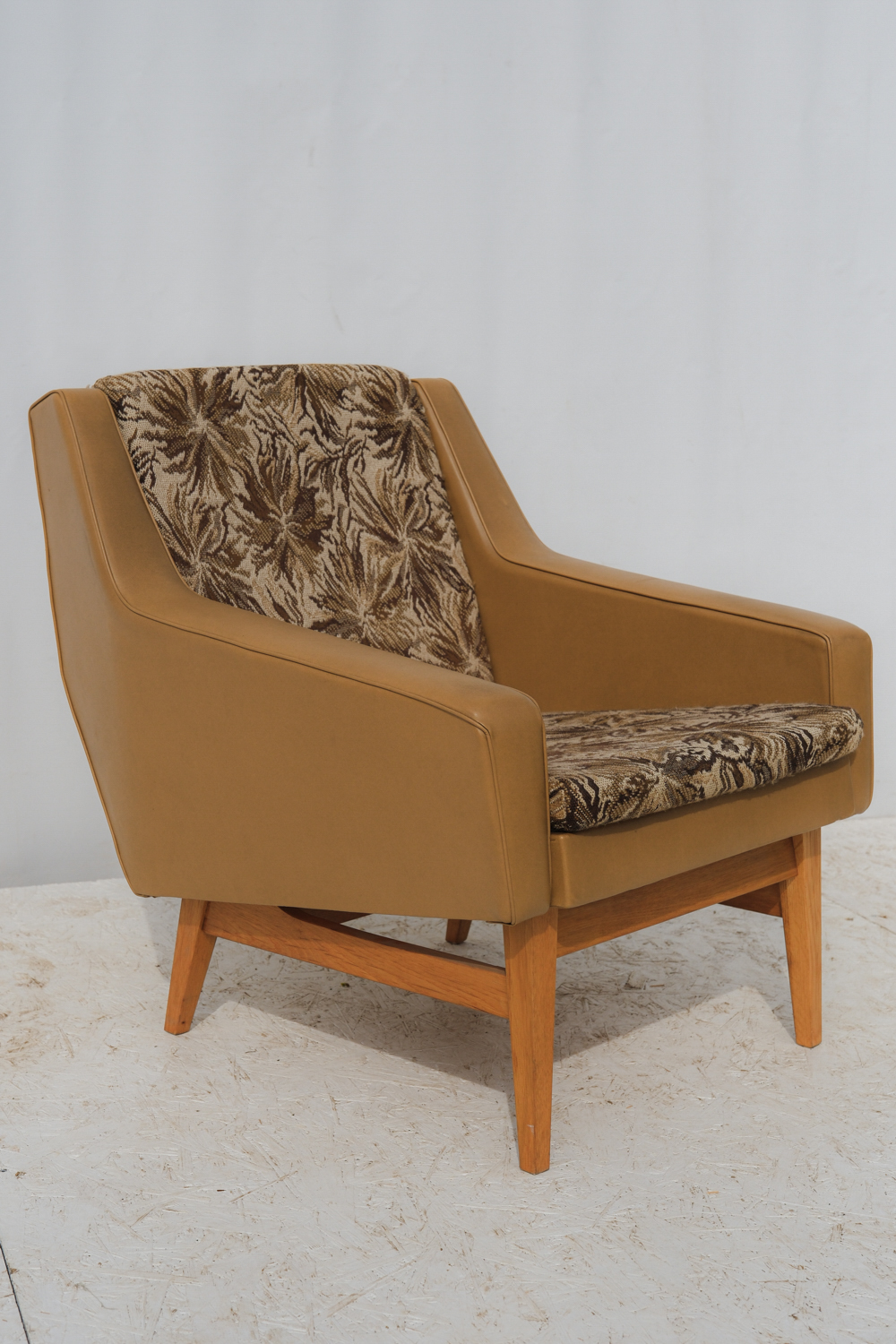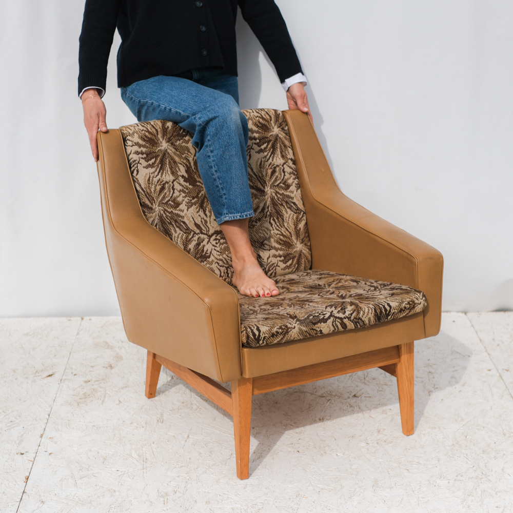 Původní čalounění dodává křeslu výrazný retro charakter, zatímco samotná silueta je překvapivě moderní a čistá. Právě v tom spočívá jeho kouzlo – v aktuálním stavu potěší milovníky autenticity, po přečalounění se snadno promění v minimalistické, současné křeslo, které obstojí i v moderním interiéru.