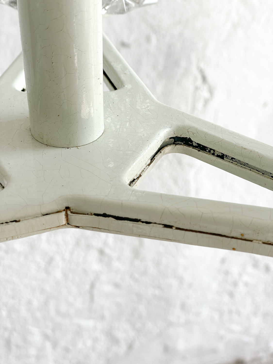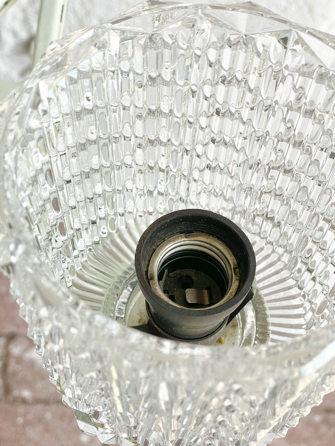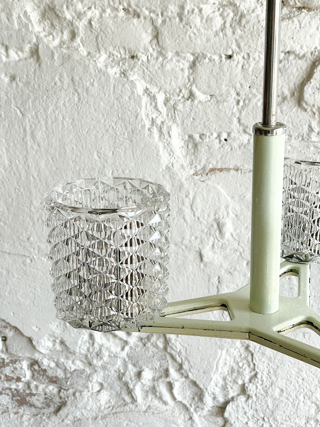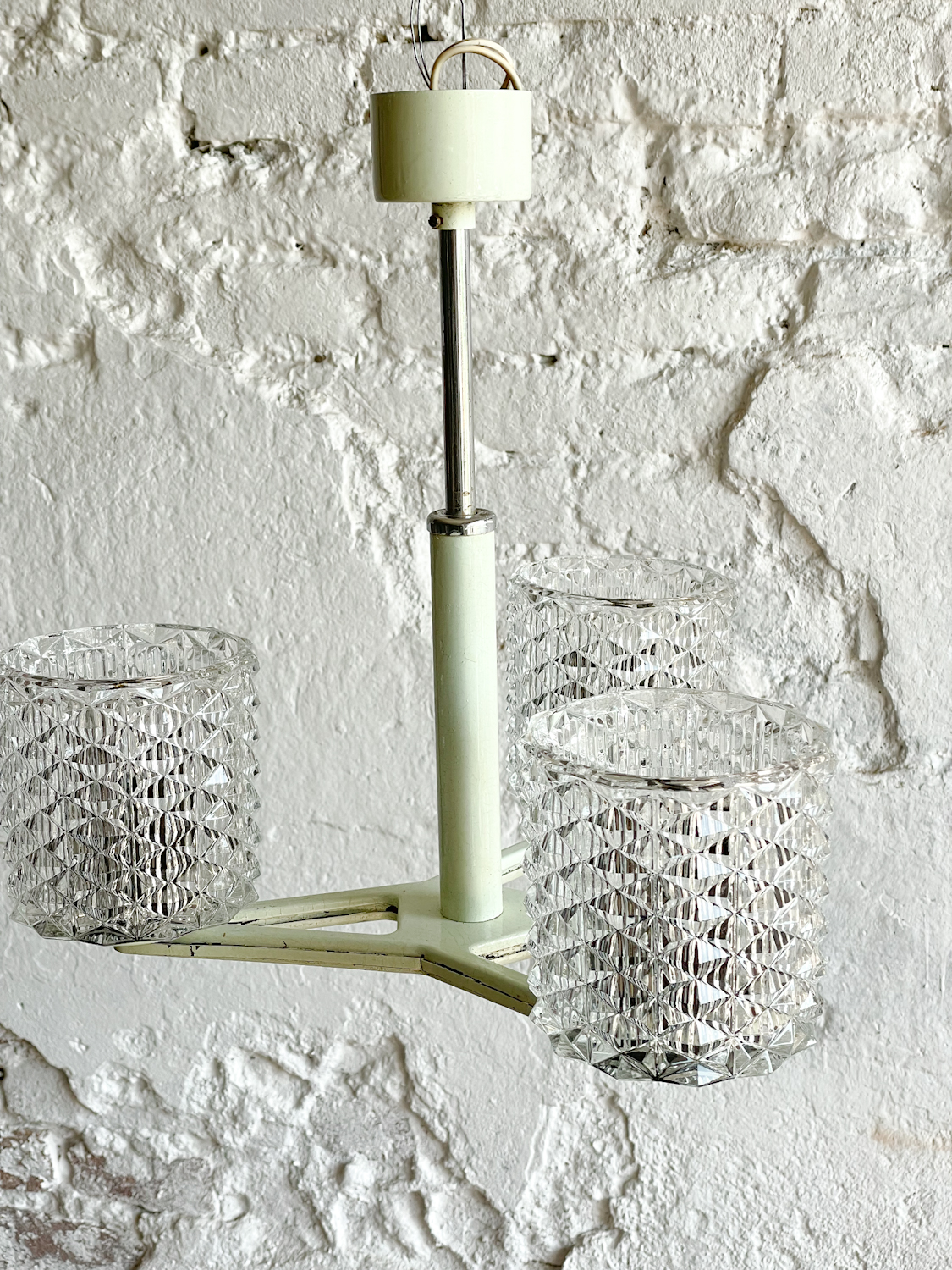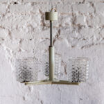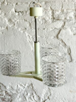 Retro lustr panelákového typu ve smetanové (s lehounkým nádechem světle mintové) barvě se stínidly z litého skla, po kterém bude toužit duše nejednoho hipstera.