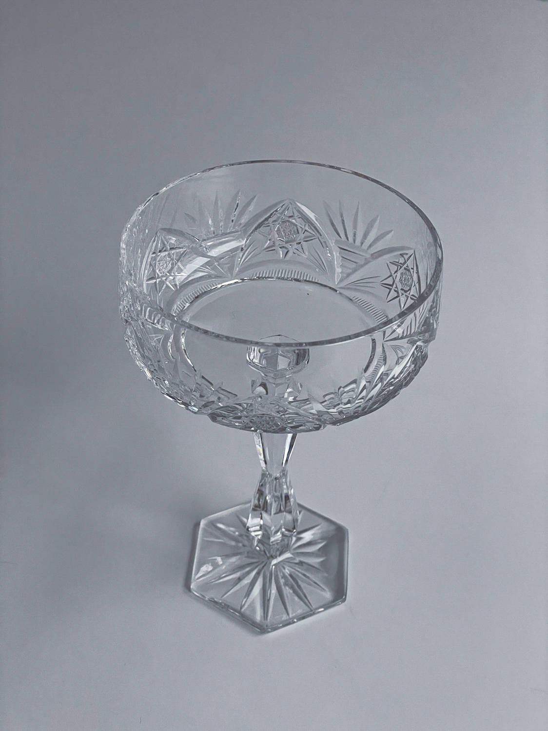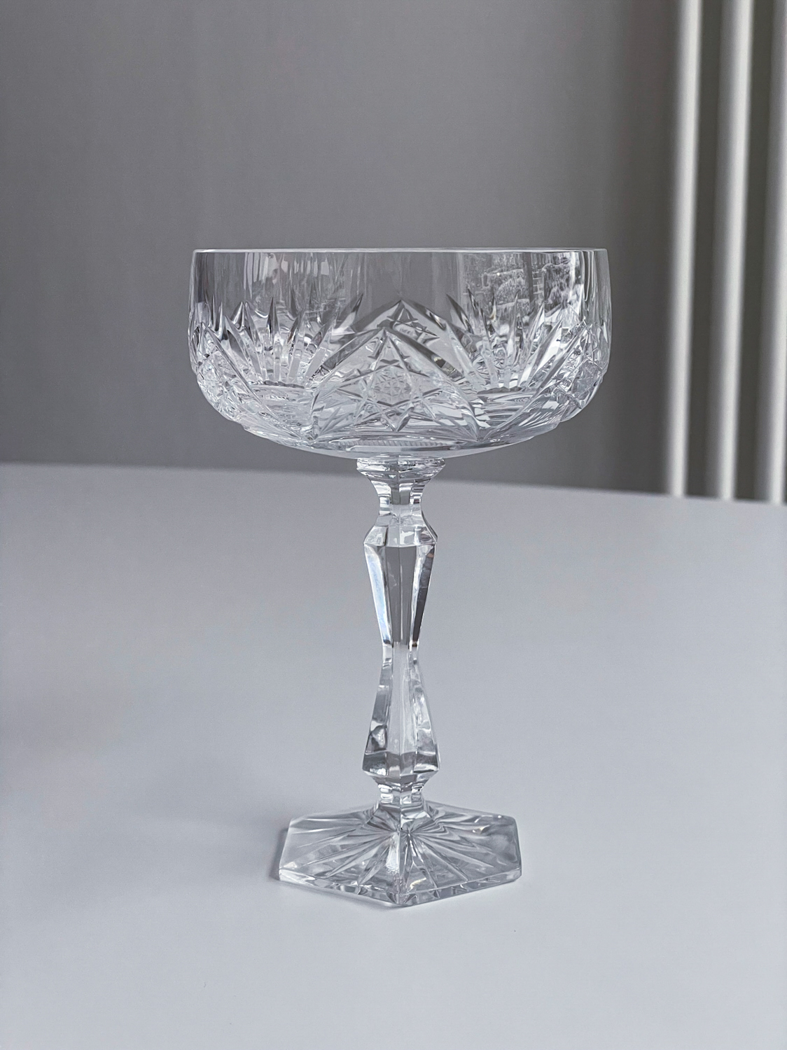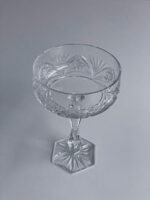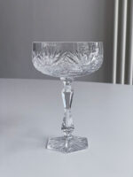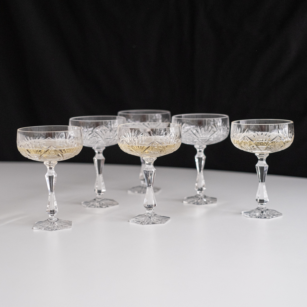 Sada 6 broušených sklenic na šampaňské v oblíbeném tvaru „mističek“. Sklenice mají zajímavě tvarovanou stonku a šestiboké probroušené dýnko. Velmi slavnostní a elegantní sklenice, které není ale nutno schovávat jen na novoroční přípitek.