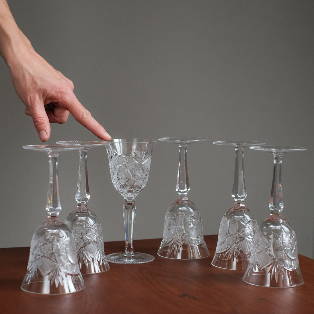 Sada šesti broušených sklenic, které nesou všechny typické znaky československé brusičská tradice: jiskřivé hvězdice, vějířové řezy a jemné geometrické plochy, v nichž se krásně láme světlo. Každá sklenice působí jako malý krystal – dekor je bohatý, ale vyvážený, nepůsobí těžce ani přezdobeně.