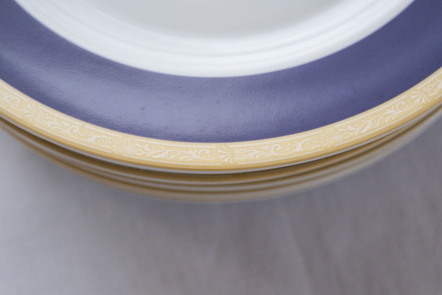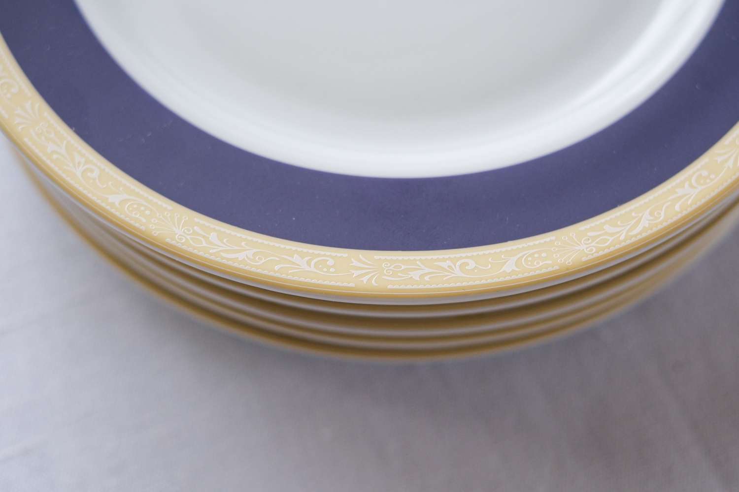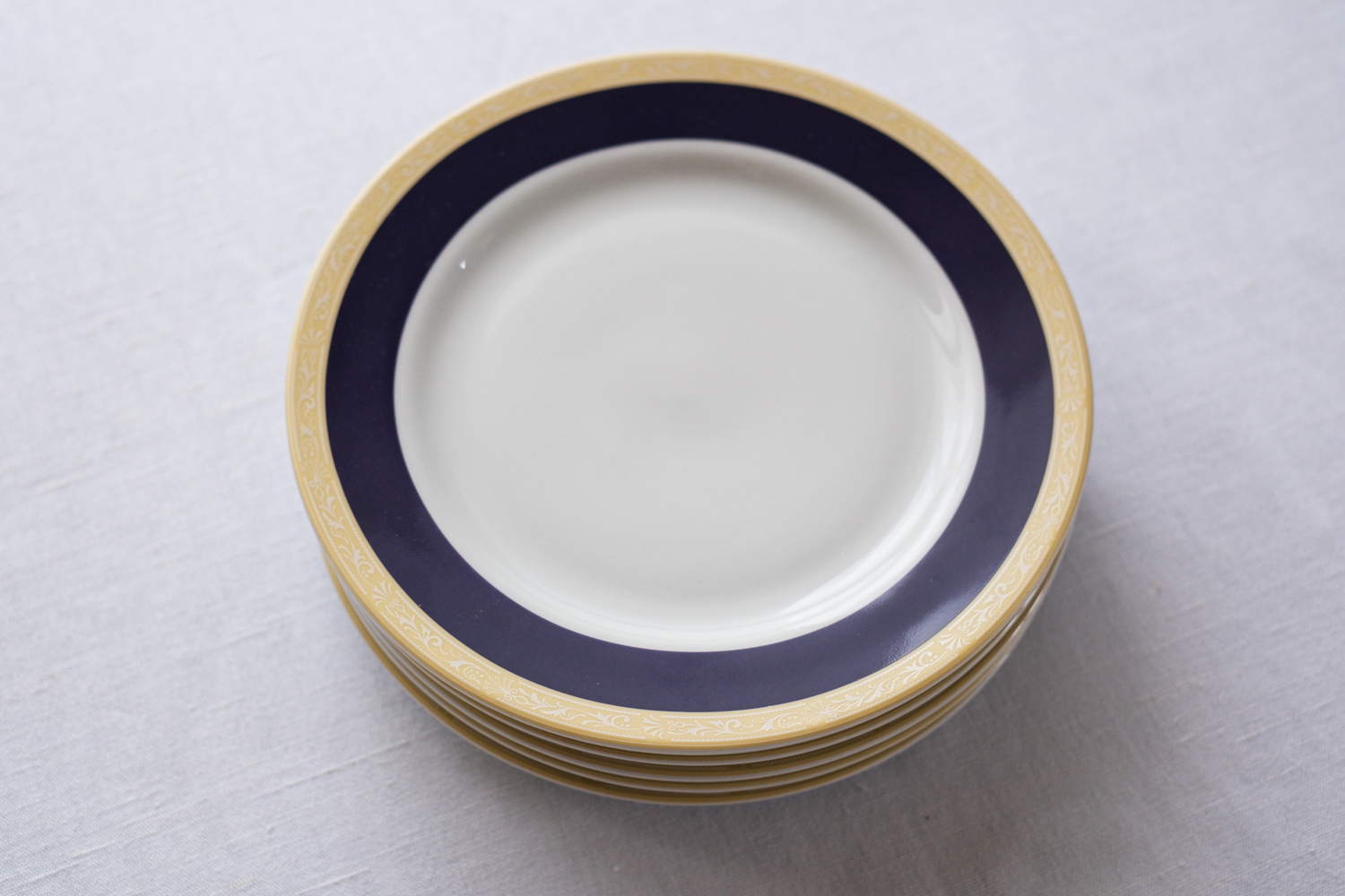 Sada 6 mělkých větších talířů od české porcelánky Thun (ale neznačeno). Kombinace kobaltově modré a vanilkové působí velmi elegantně. Tato barevná kombinace je doplněna ještě něžným bílým dekorem na vanilkovém lemu.