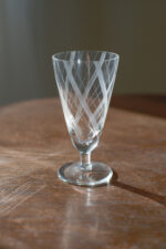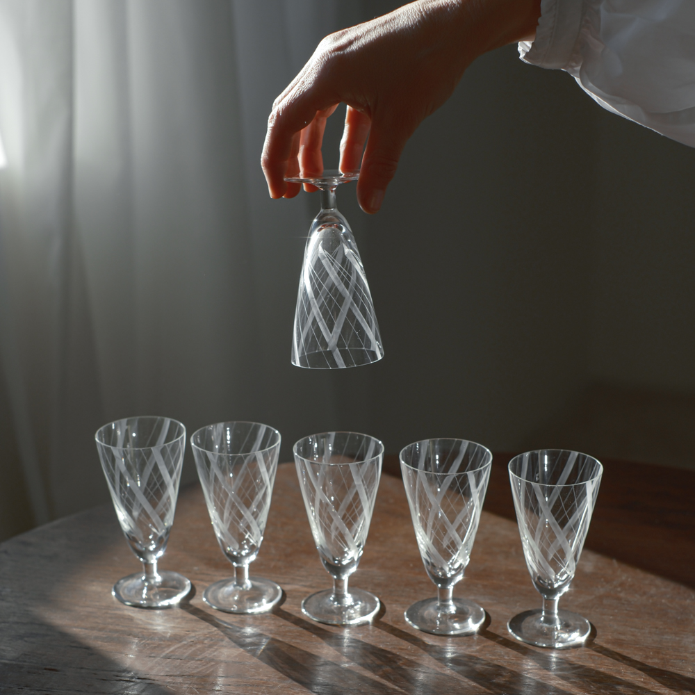 Sada 6 sklenic na likér z tenoučkého skla s vybroušeným dekorem do šikmých pruhů.