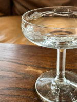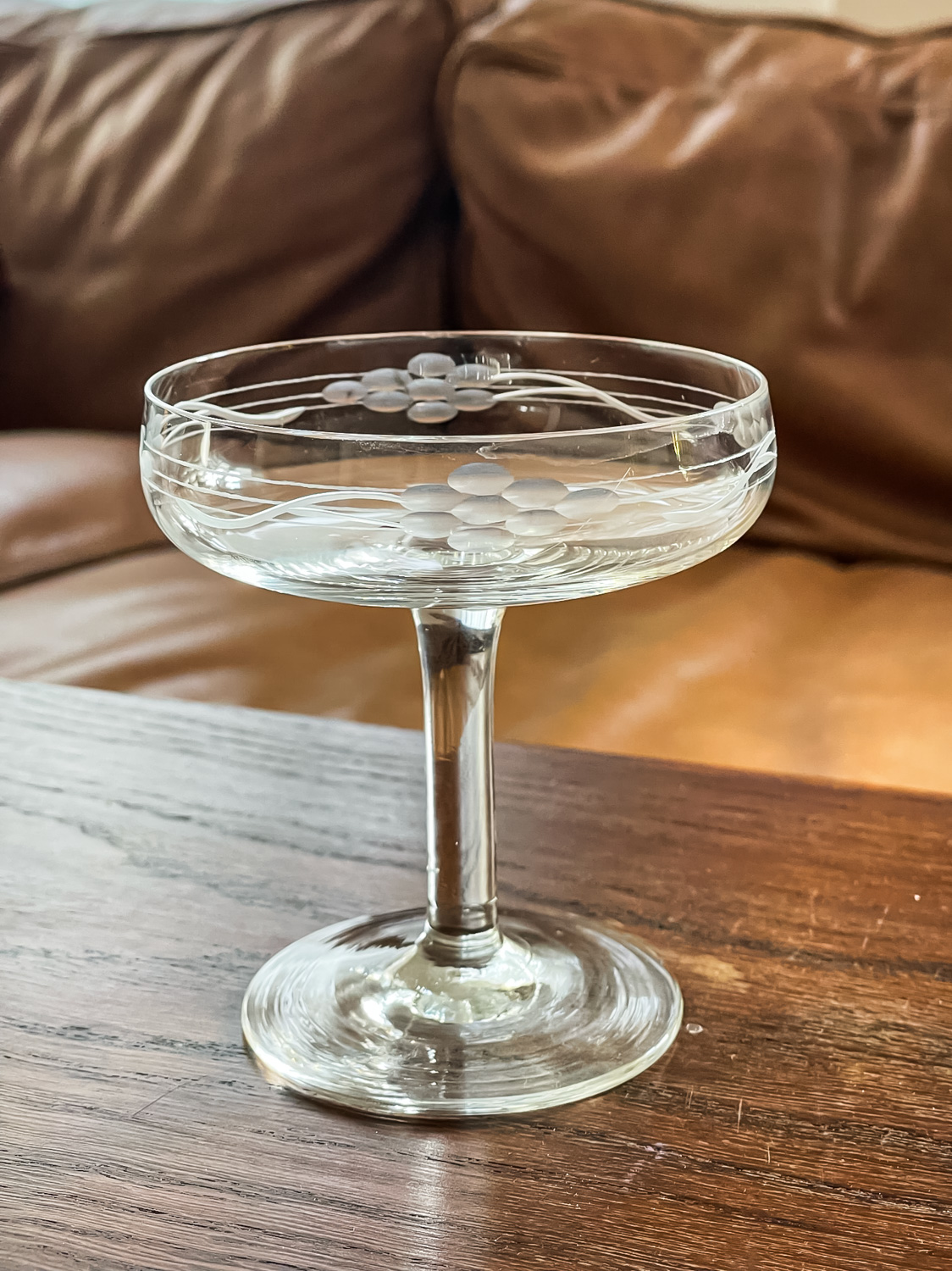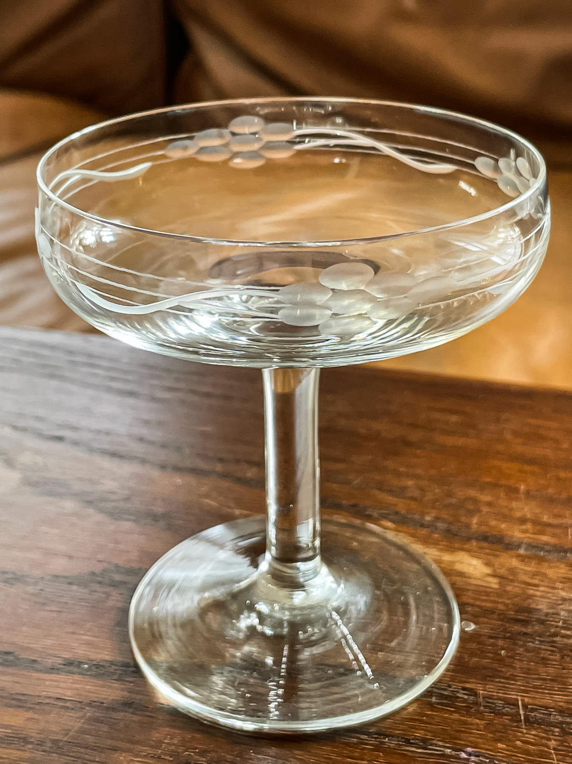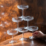 Sada krásných sklenic na šampaňské ve tvaru misek, ze kterých se dá postavit slavnostní pyramida. Sklenice je ve stylu art deco a má vybroušené stylizované hrozny. Budou krásnou ozdobou jakéhokoliv slavnosntího přípitku nebo večírku.