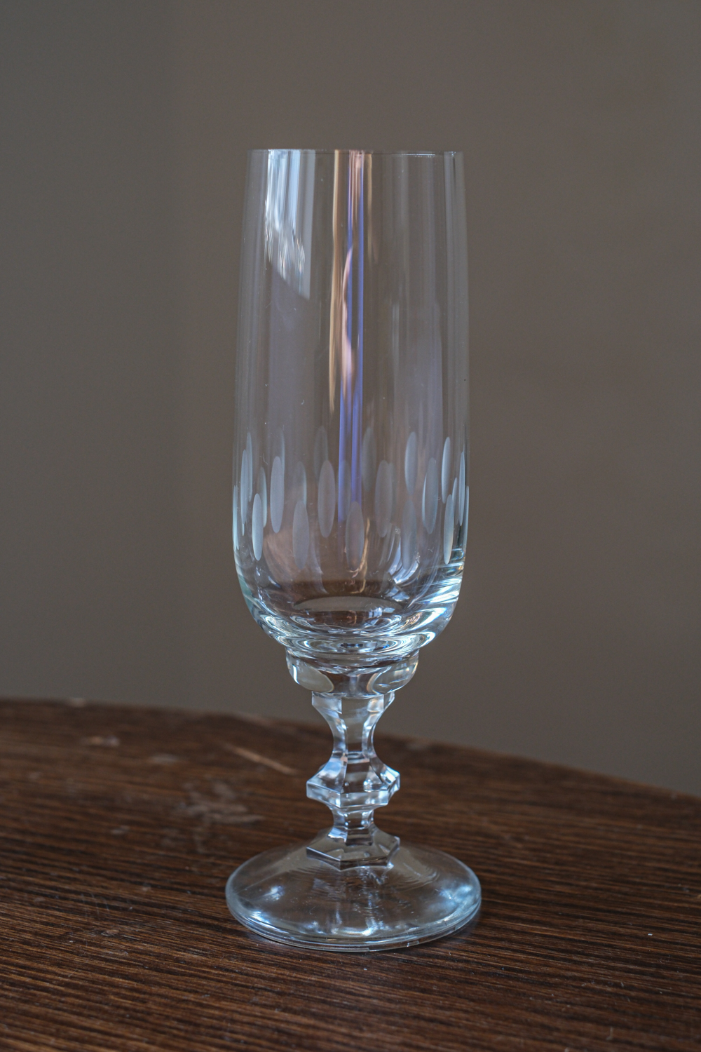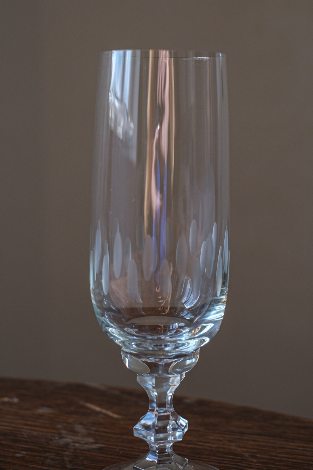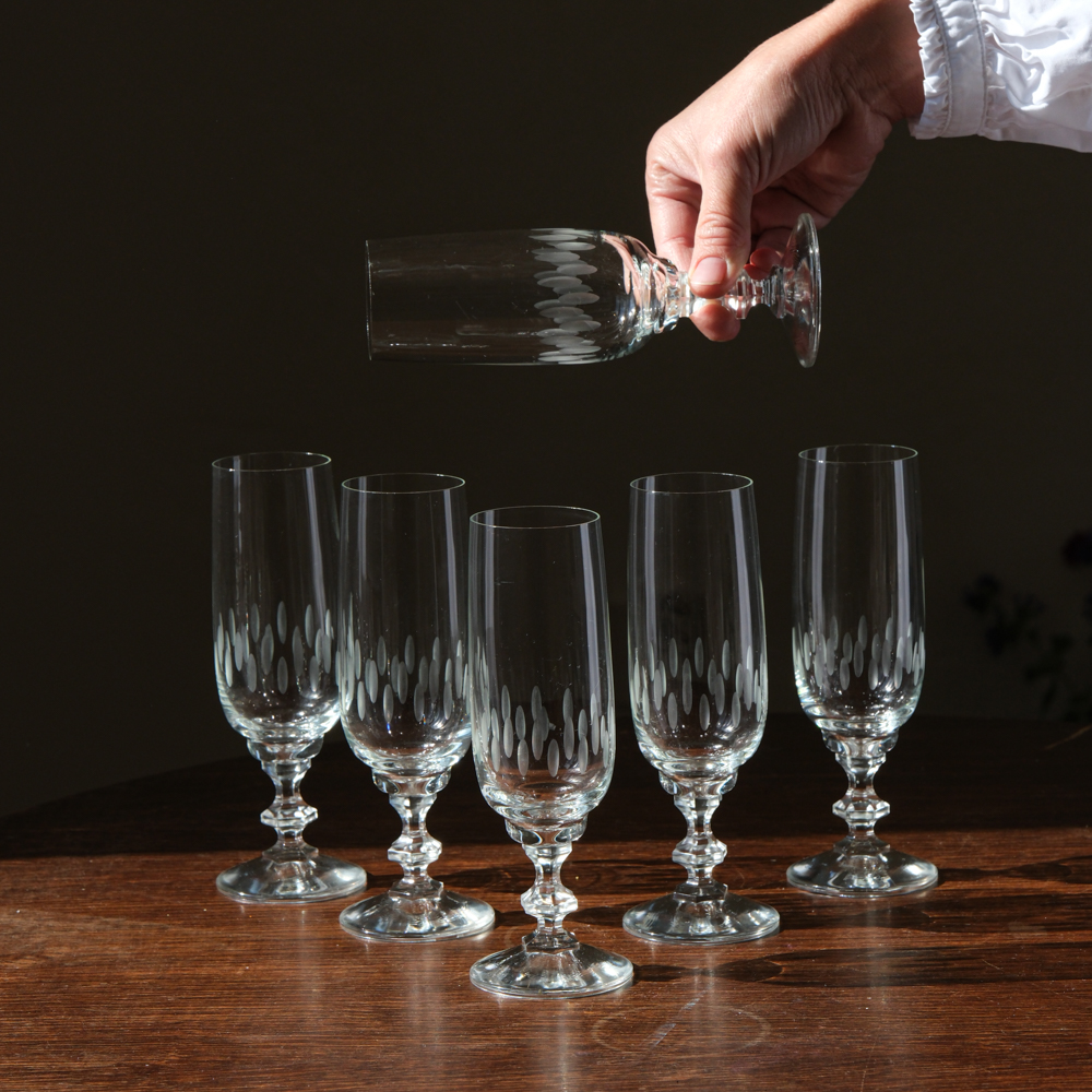 Sada šesti elegantních vintage sklenic s jemně broušeným dekorem v podobě podlouhlých oválů. Díky tvaru se sklenice výborně hodí nejen na šumivá vína, ale i na lehké dezertní koktejly.