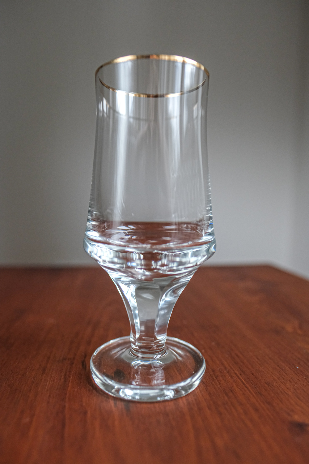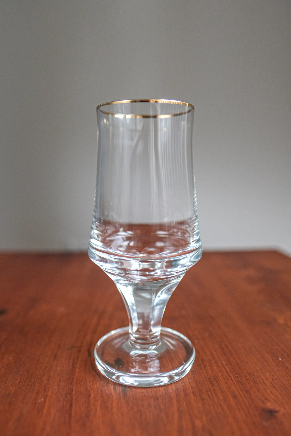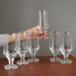 Sada šesti čirých sklenic s jemnou zlatou linkou na horním okraji. Tvar je čistý a nadčasový: štíhlé tělo se směrem dolů lehce zužuje do masivnější paty, která plynule přechází do nízké nožky. Kombinace subtilního horního profilu a pevného spodního tvaru dodává sklenicím hezkou vizuální rovnováhu. Zlatý okraj působí decentně a slavnostně, aniž by sklenice byly příliš zdobné.