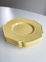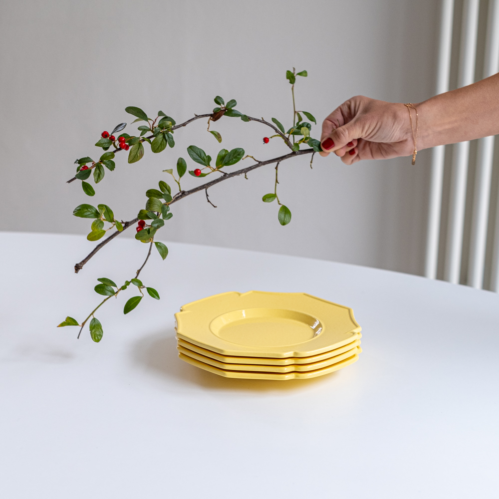 Sada dezertních porcelánových talířů silnějšího střepu od designérky Jacques Molin. Žlutá barva působí velmi optimistickým dojmem a to i přes svůj kubistický tvar. Talíř je trochu hlubší než klasické dezertní talíře a tak je vhodný i na dezert přelitý omáčkou. Krásně se budou kombinovat i s čistě bílými nebo tmavěmodrými talíři. Tmavě modré ve stejném tvaru máme také k dipozici.