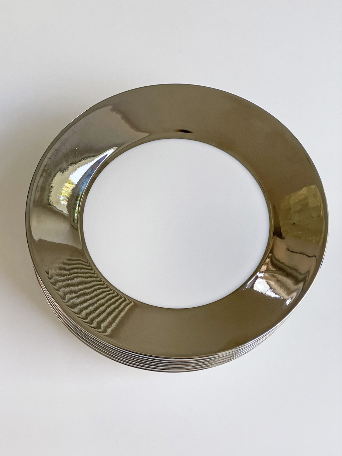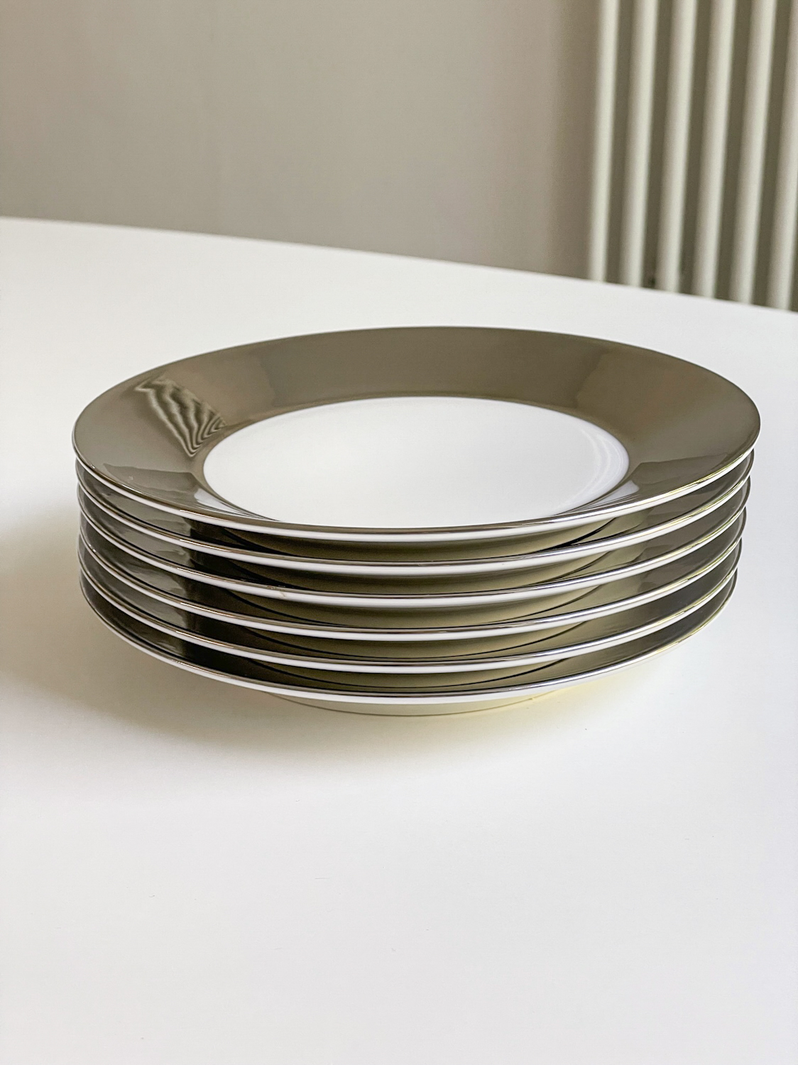 Set 6 dezertních talířků od značky Thun s širokým platinovým lemem. Působí velmi moderně, ale můžete jim díky kombinaci s jiným porcelánem či doplňky vdechnout i styl secese či art deca.