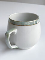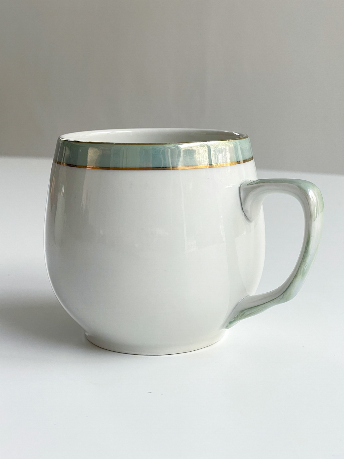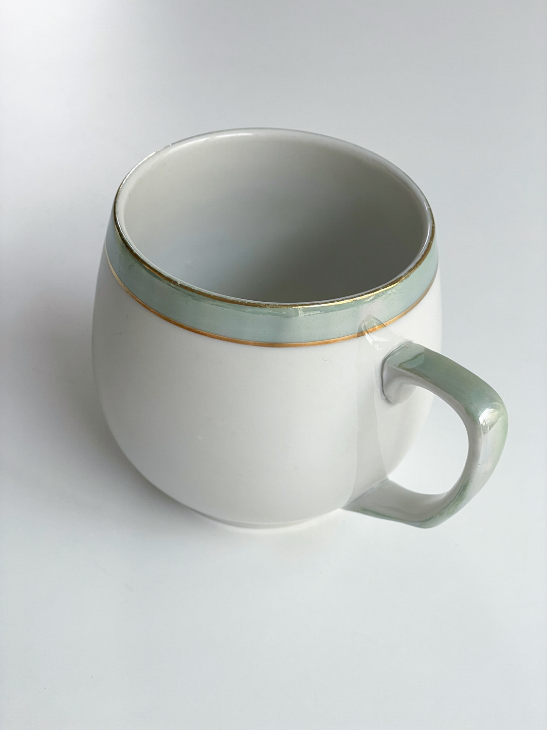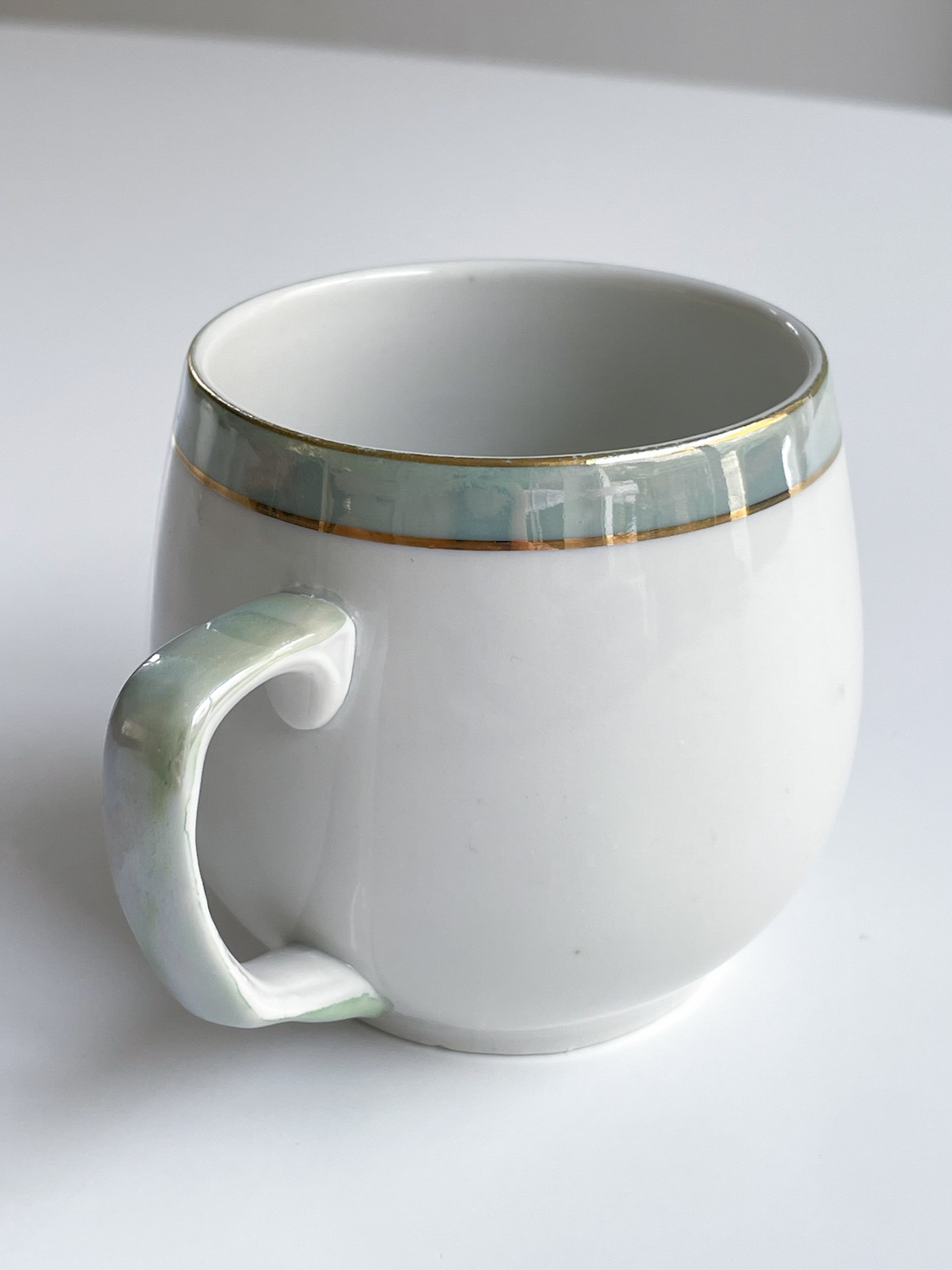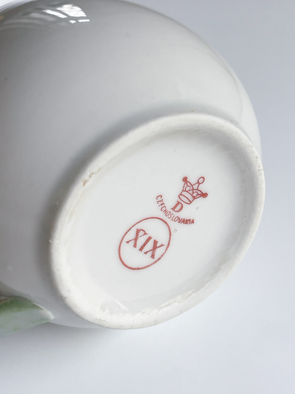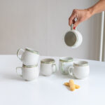 Sada buclatých hrnečků na čaj či kakao od značky Dubí. Značka tohoto typu se používala do roku 1945. Hrnečky mají perleťové ucho a centimetrový proužek na okraji, který je lemován ještě dvěmi zlatými proužky.
