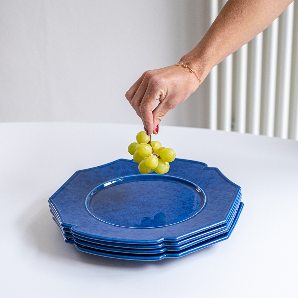 Sada dezertních porcelánových talířů silnějšího střepu od designérky Jacques Molin. Talíře mají kubistický tvar a krásně modrou barvu. Budou se dobře kombinovat jak s čistě bílými nebo žlutými talíři. Žluté dezertní talíře stejného tvaru a značky máme k dispozici.