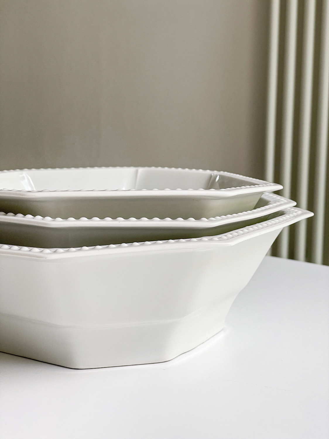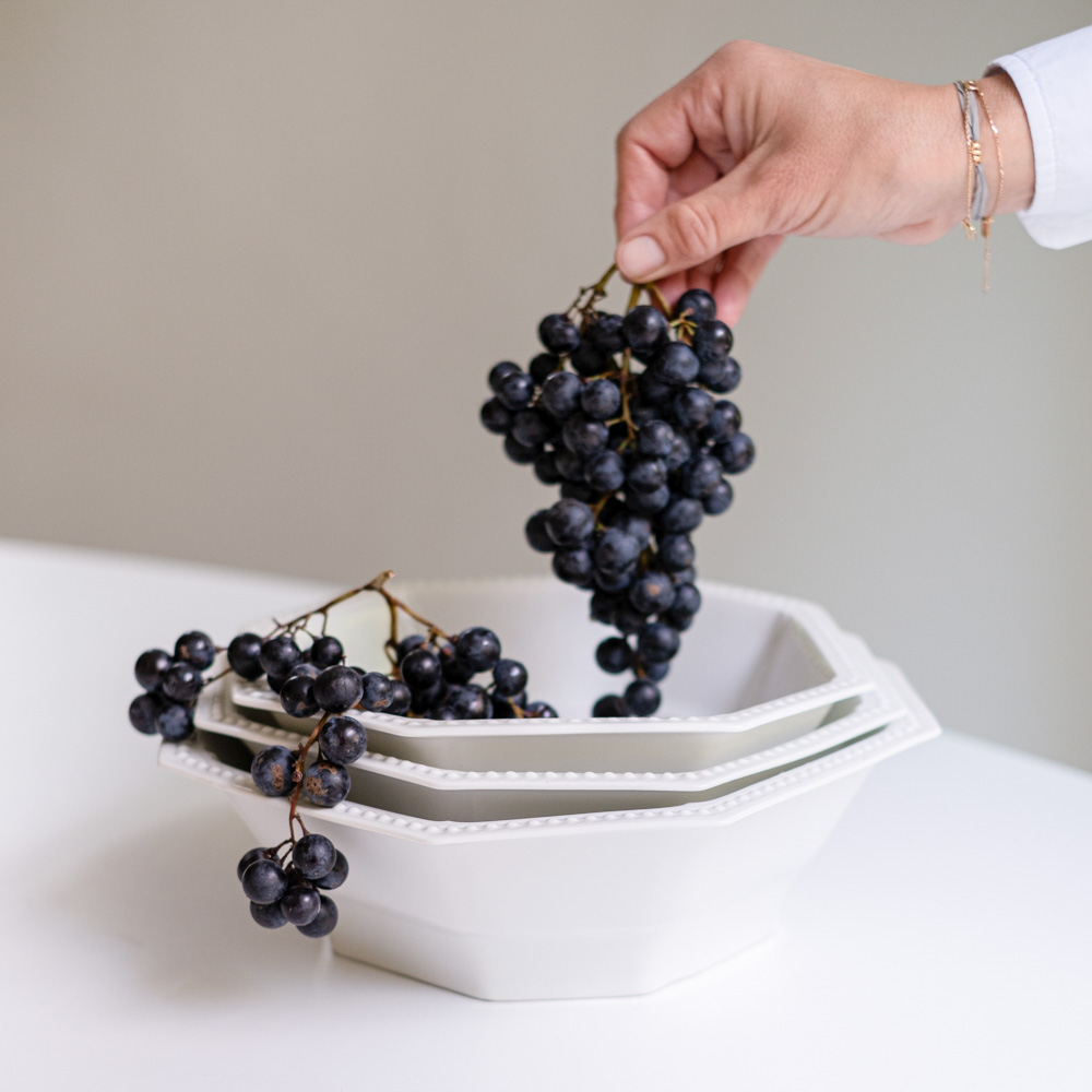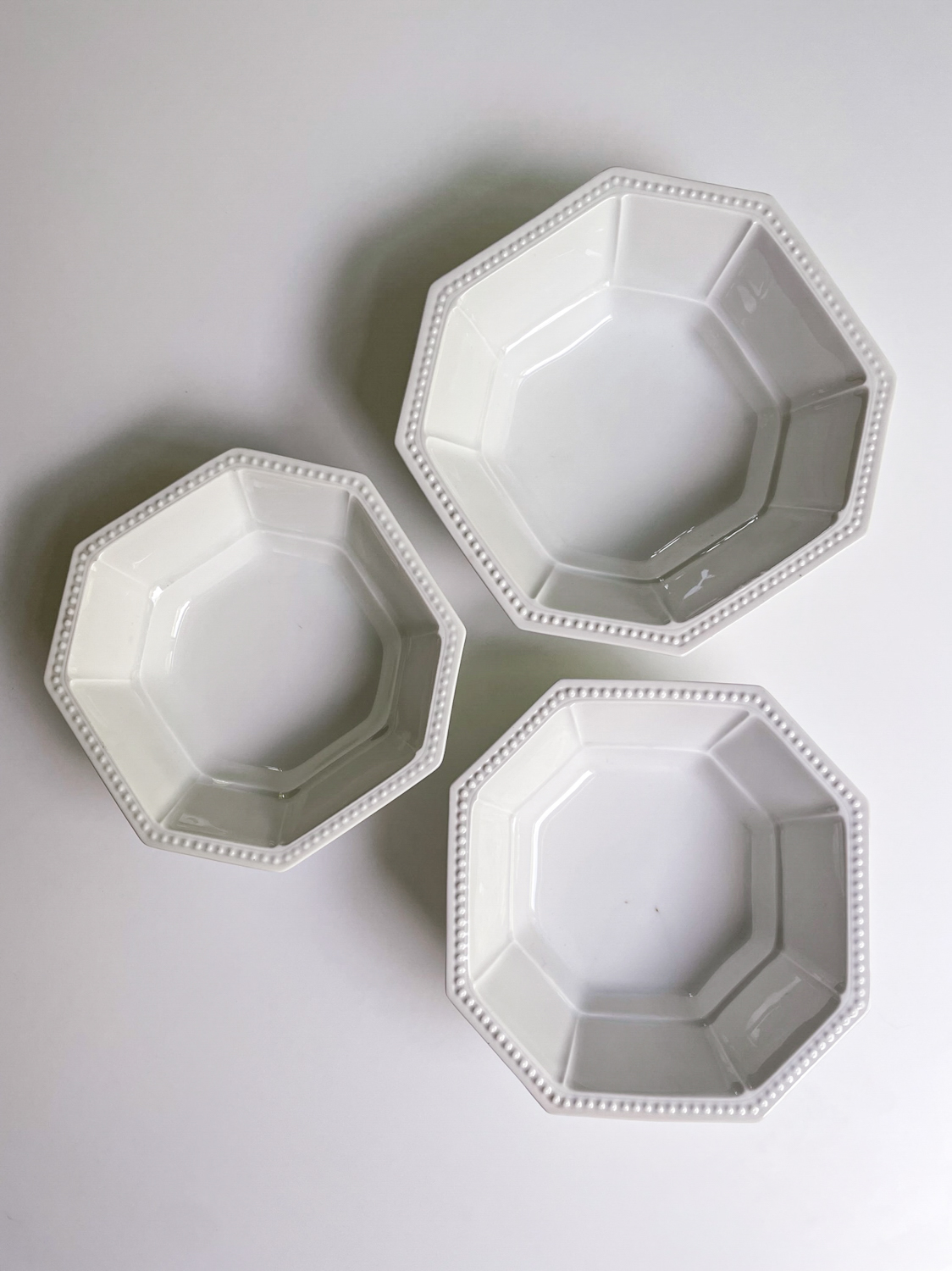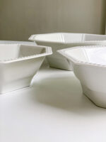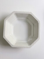 Krásná sda salátových mís ve tvaru osmihranu od německé porcelánky Hutschenreuther, jedné z nejstarších evropských porcelánek, která patří už přes dvě dekády do „rodiny“ Rosenthal. Mísy jsou zajímavé nejen tvarem, ale i plastickým zdobením v podobě kuliček na lemu.