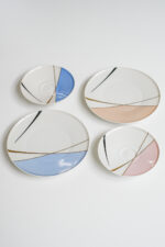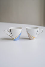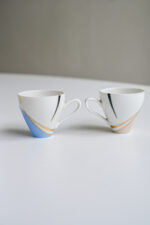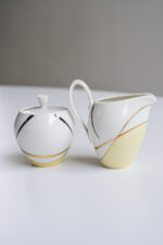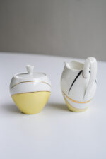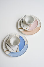 Sada na espresso pro dva z 60. let minulého století v bruselském stylu, pro který jsou typické pastelové barvy, zde navíc doplněno o zlaté a černé linie. Sada pochází z jedné z nejstarších českých porcelánek Haas a Czjzek.