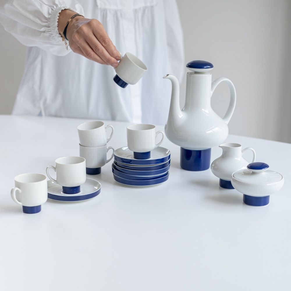 Elegantní souprava ne espresso v minimalistických liních avšak výrazná kobaltovou modrou barvou. Kvalitní avšak neznačený porcelán.
