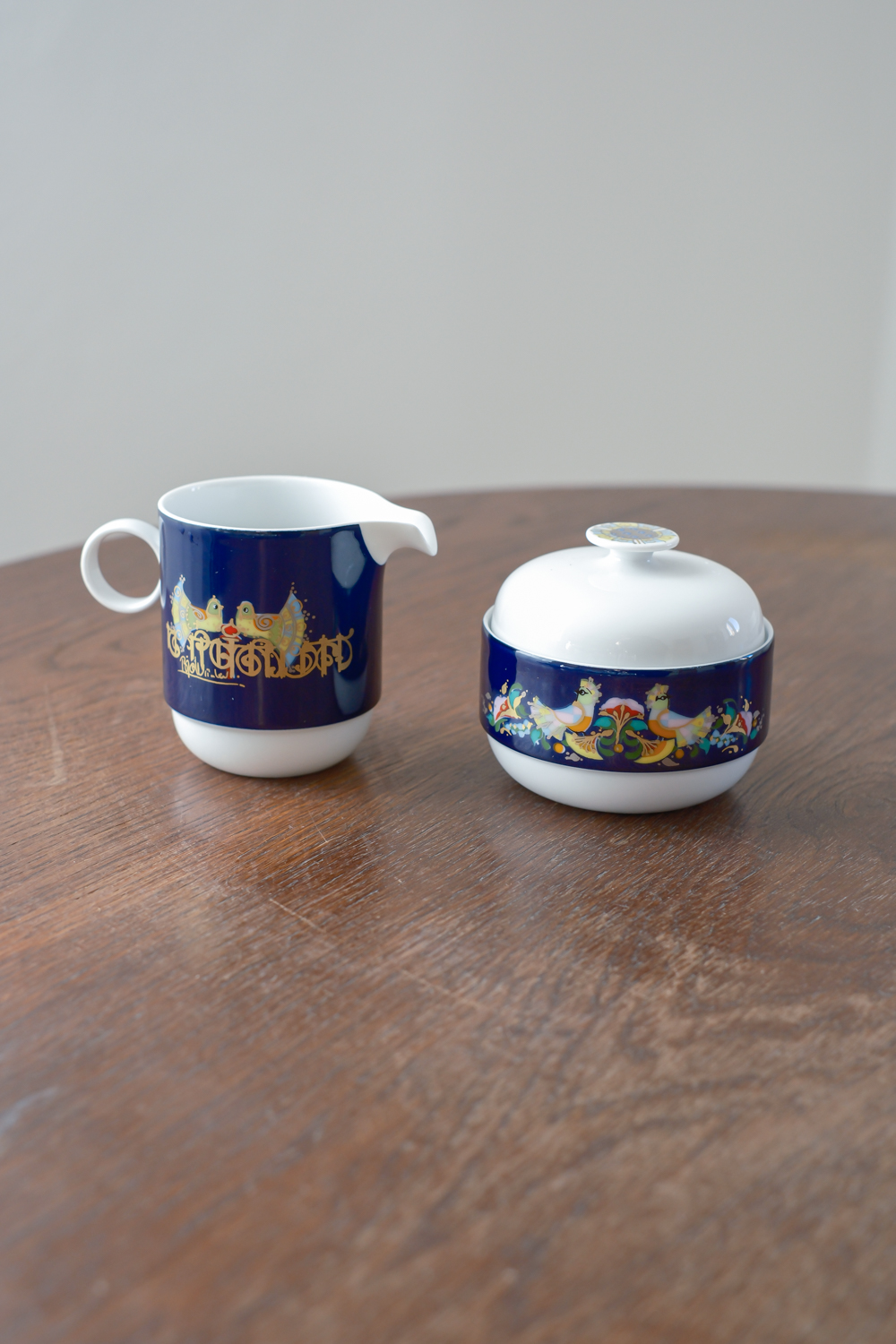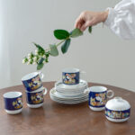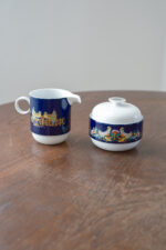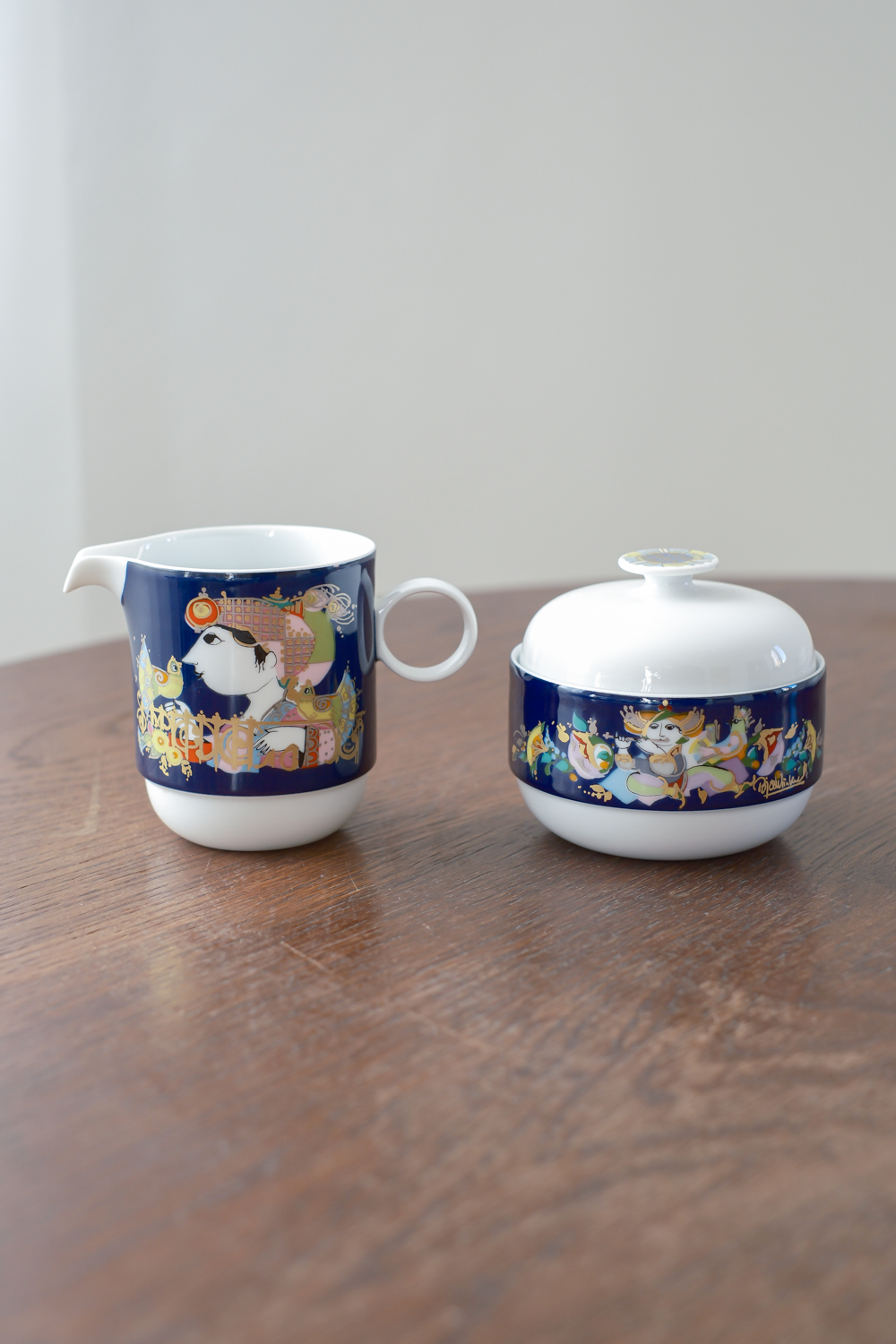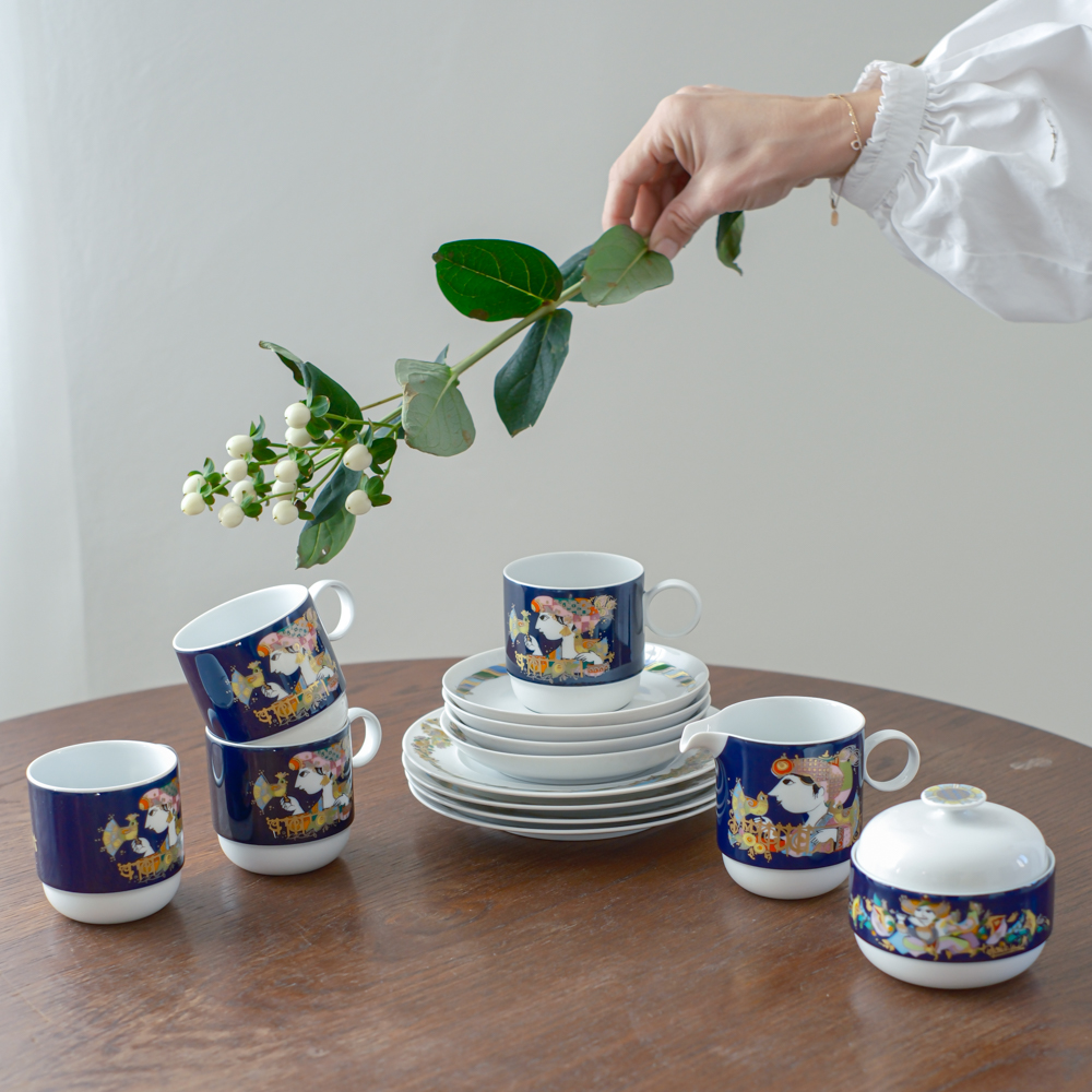 Sada na kávu v kobaltově modré barvě s výrazným barevným dekorem od německé porcelánky Rosenthal dle návrhu dánského malíře a designéra Bjørn Wiinblada. K charakteristickým rysům jeho tvorby patří rozmarní lidé s kulatými tvářemi, oblečení v nejasném kostýmu z 19. století. Často jsou obklopeny přírodními prvky: vinnou révou, květinovými věnci a fantastickými stromy. Jeho barvy jsou syté a výrazné – někdy až psychedelické – a často je doplňuje kovová zlatá nebo stříbrná.